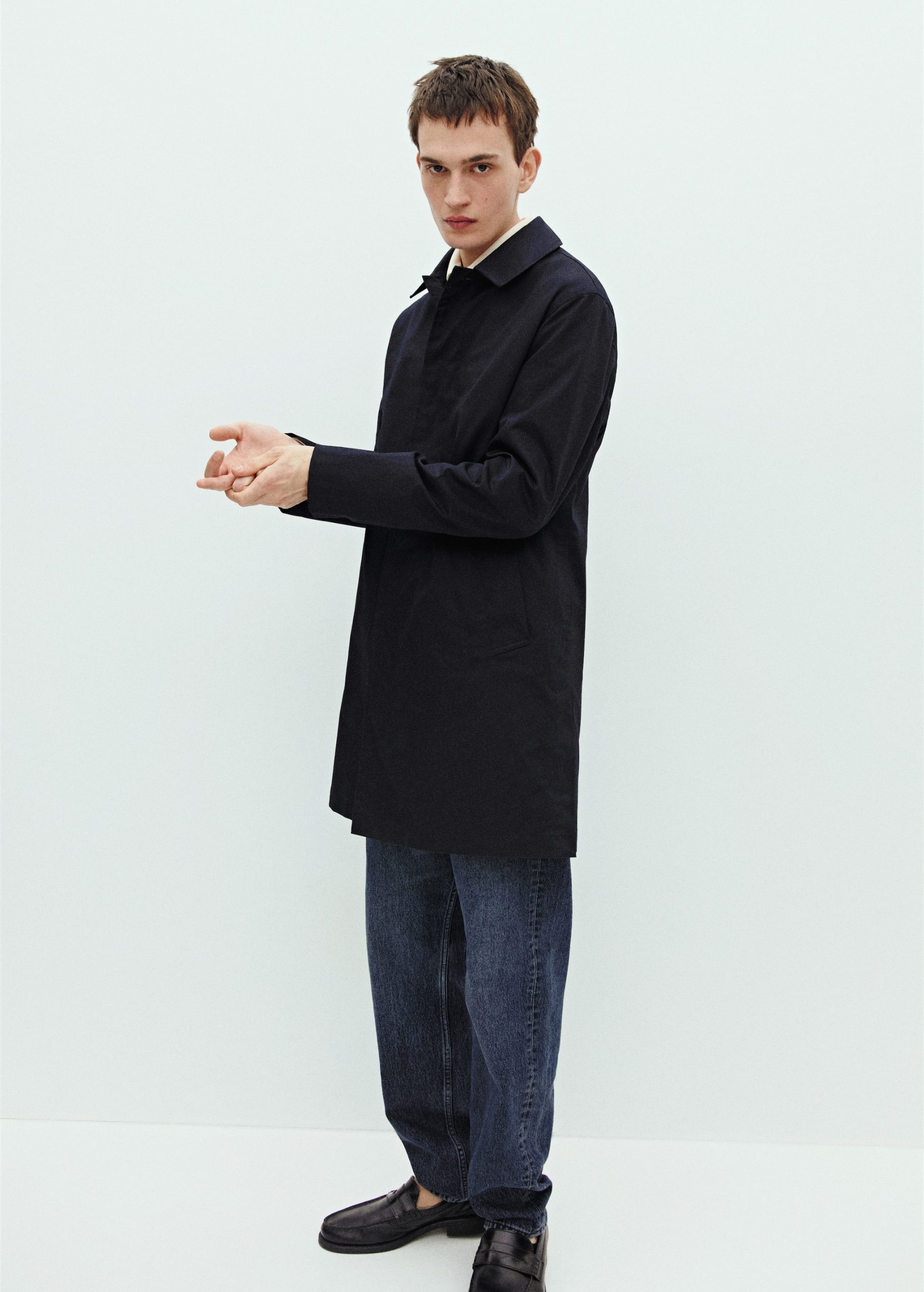 ESSENTIALS: Made to last. Print detail on the inside of the neck. Two side welt pockets. Inner lining. Interior pocket. Back Slit at the Hem. Long design. Front button closure. Classic collar. 100% cotton fabric. ESSENTIALS: Made to last. We have strengthened our quality requirements by adding new resistance tests to our garments. Designed paying careful attention to their manufacture, they are now even more durable, versatile and timeless.