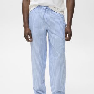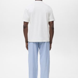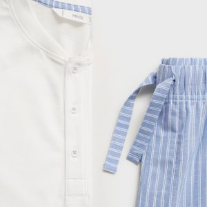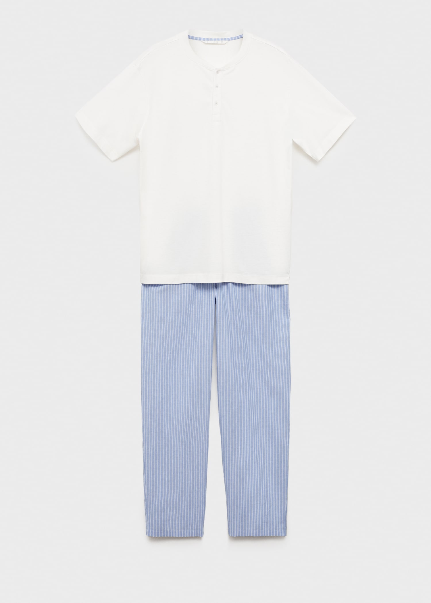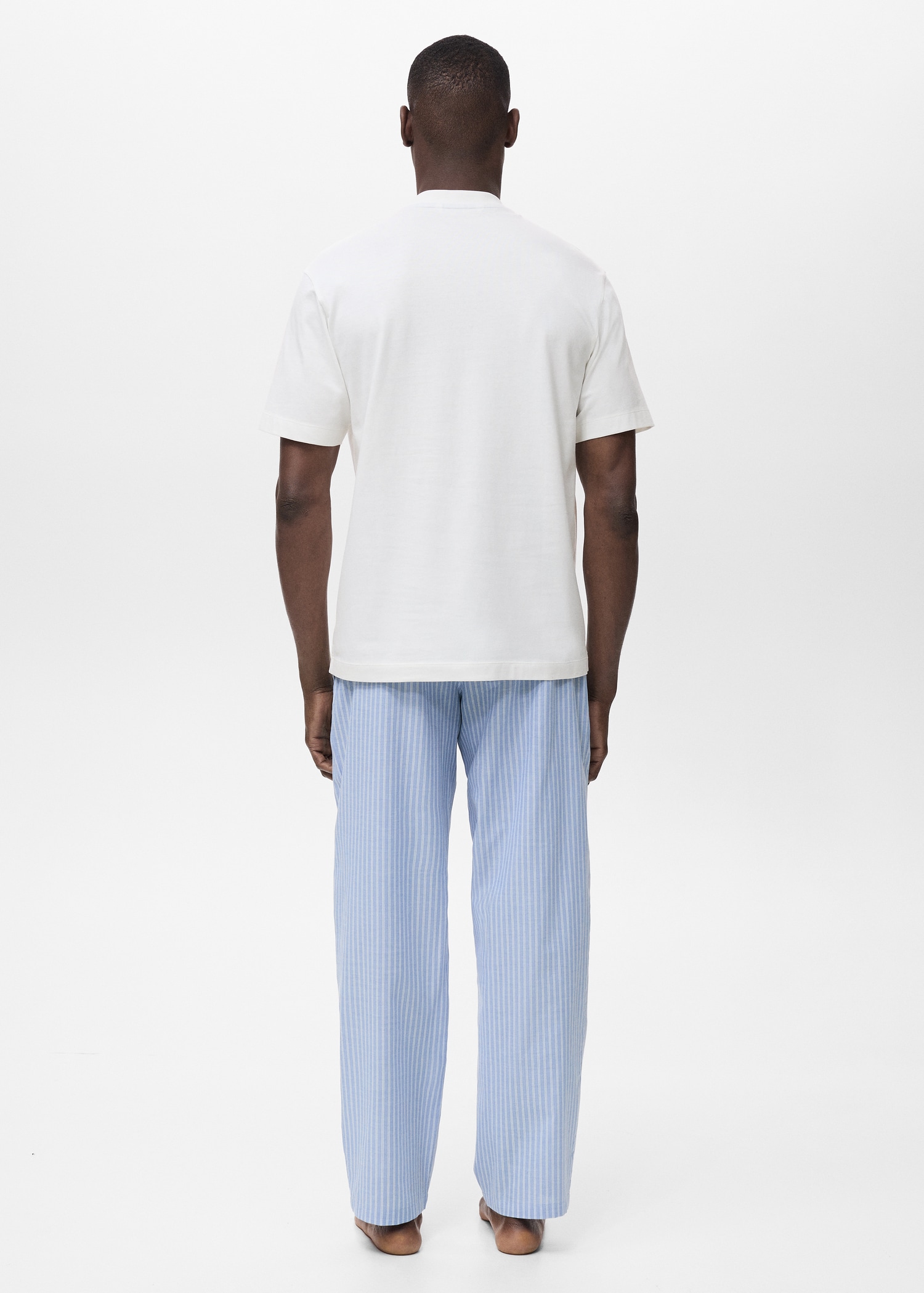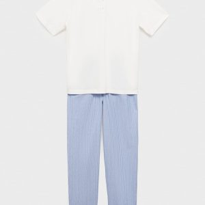 100% cotton fabric. Short-sleeved t-shirt and long pants with elastic waistband and adjustable drawstring. Striped print