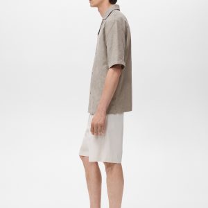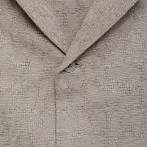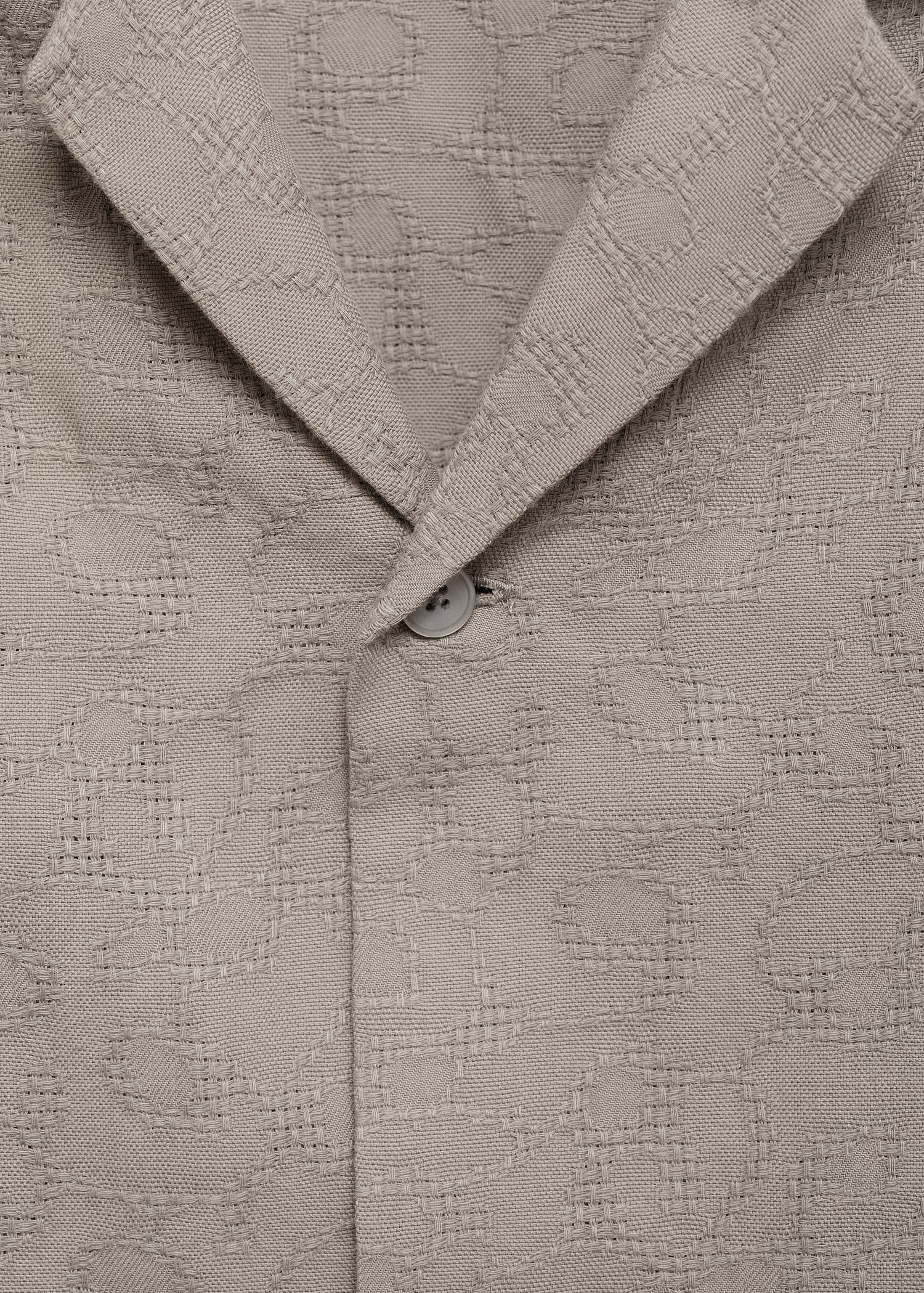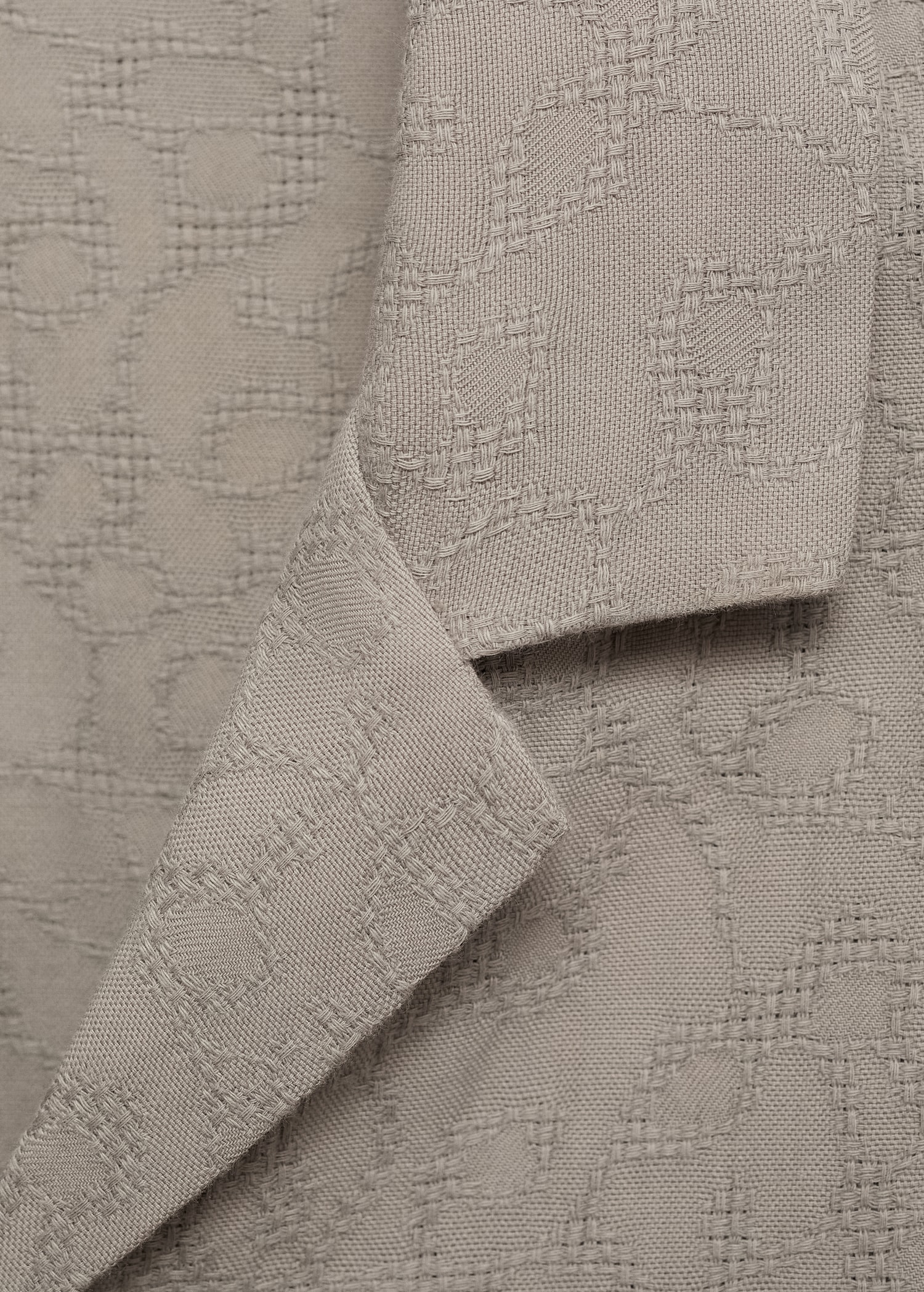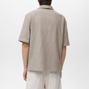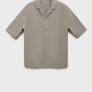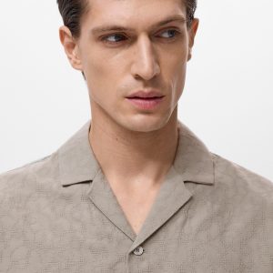 100% Cotton. Regular Silhouette. Embroidered structure fabric. Bowling collar. Short sleeve. Front button closure. The model is 5'7" and is wearing a size M