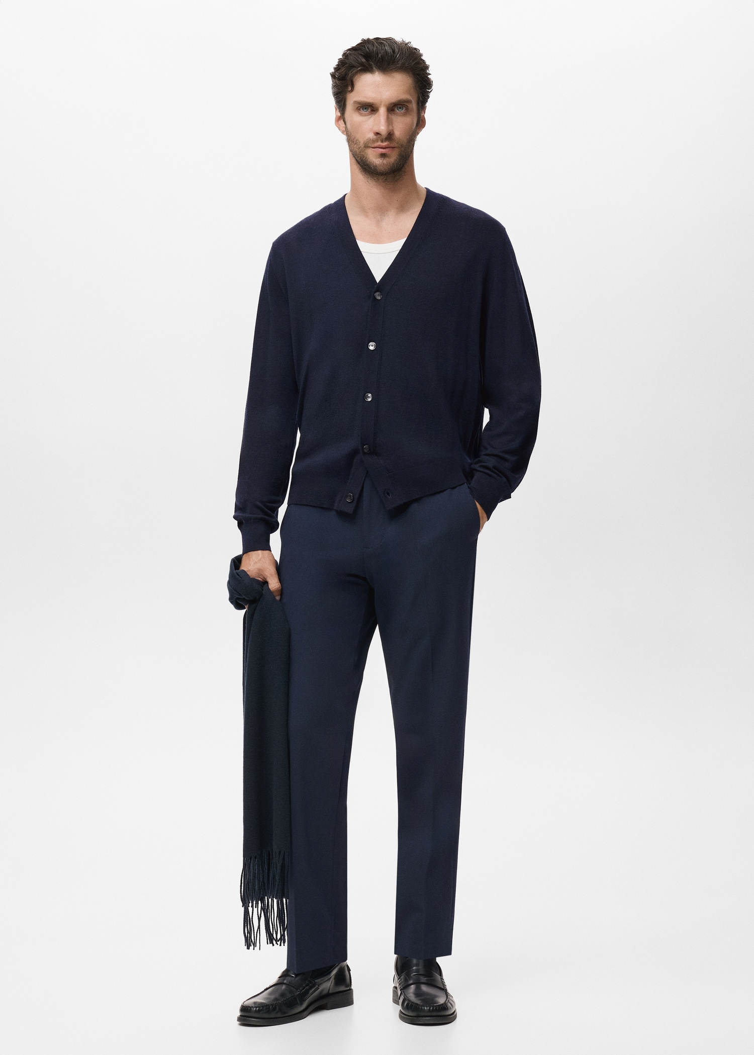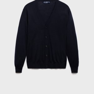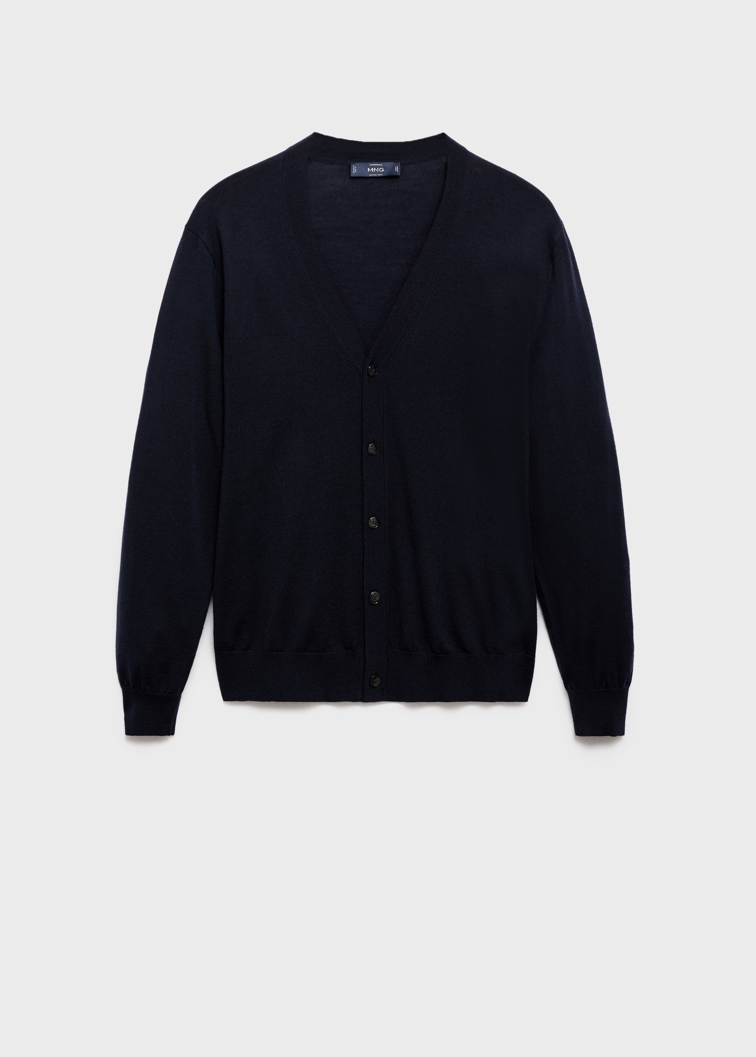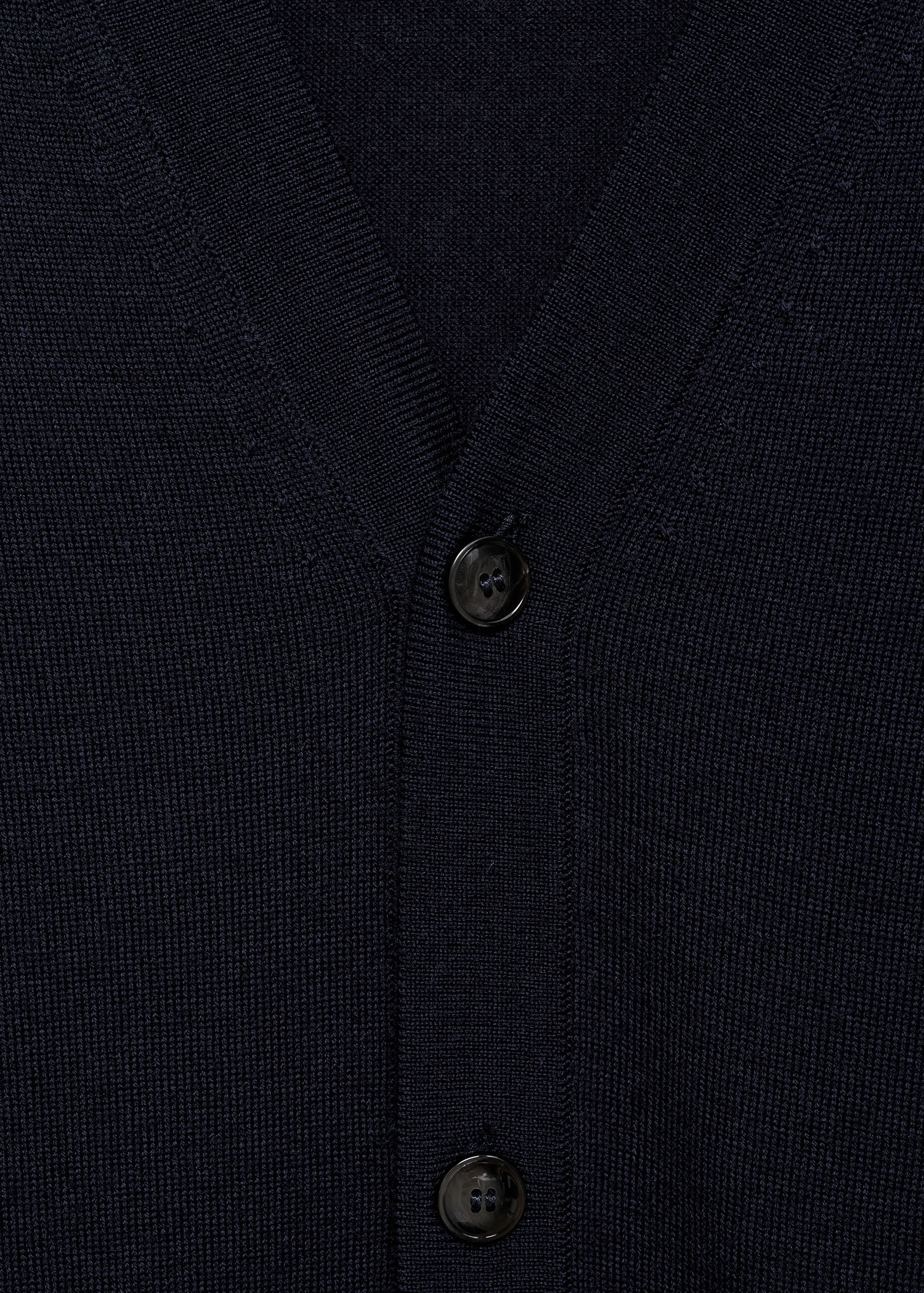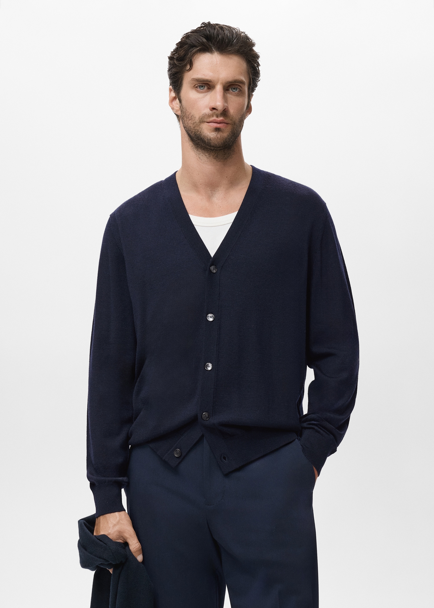 Online Exclusive. Regular fit. 100% wool fabric. V-neck. Long sleeves with elastic cuffs. Front button closure. Ribbed collar, sleeves and hem. ESSENTIALS: Made to last. We have strengthened our quality standards by adding new endurance tests to our garments. Designed with careful consideration of their construction, they are even more durable, versatile and timeless
