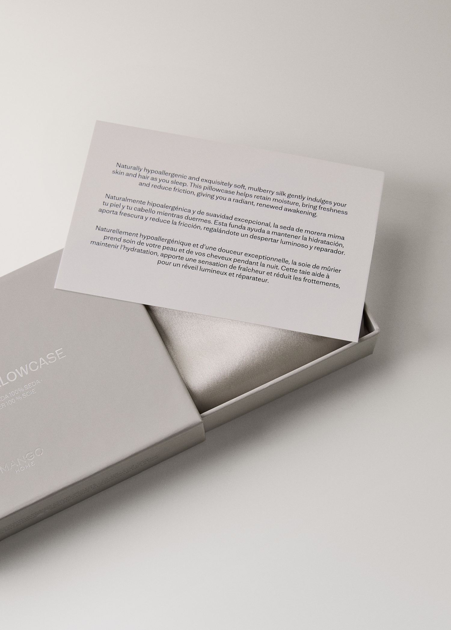 100% silk. Size: 50x75cm. Filling included. This pillowcase is crafted with an elegant and sophisticated design, made from 100% silk, giving it a texture that is smooth and silky to the touch. Its surface has a glossy finish that subtly reflects light, adding a touch of luxury. In addition, silk is beneficial for the skin and hair. Hypoallergenic and thermoregulating, it is perfect for adding luxury and comfort to your daily rest