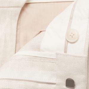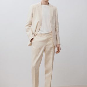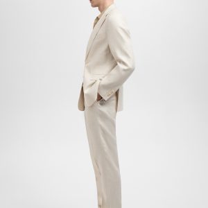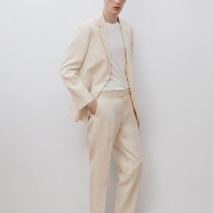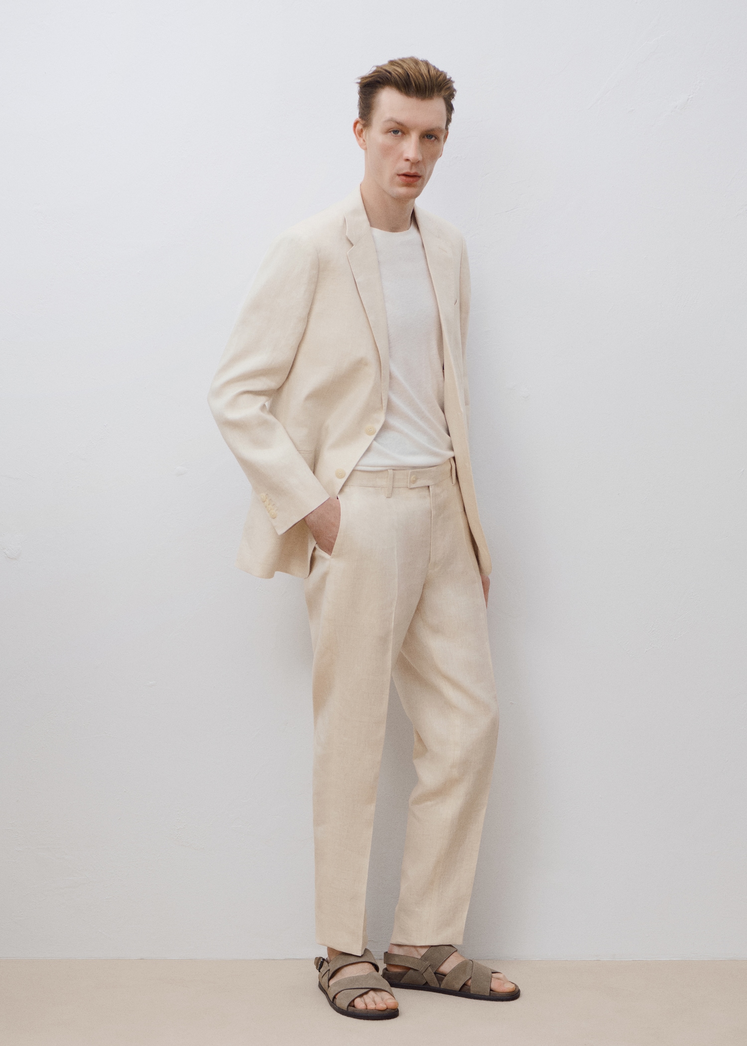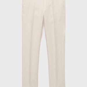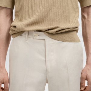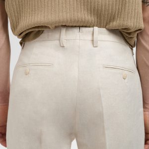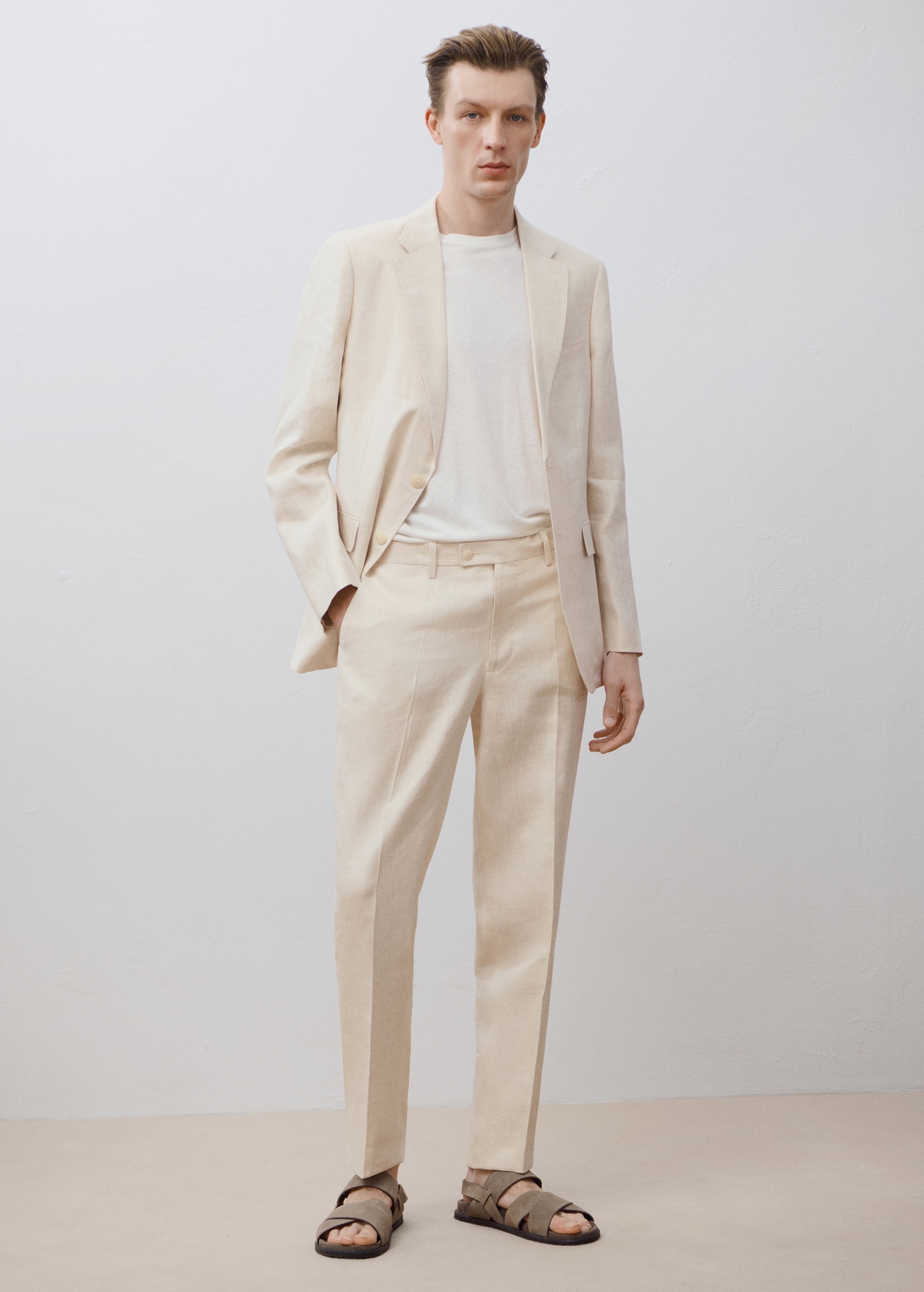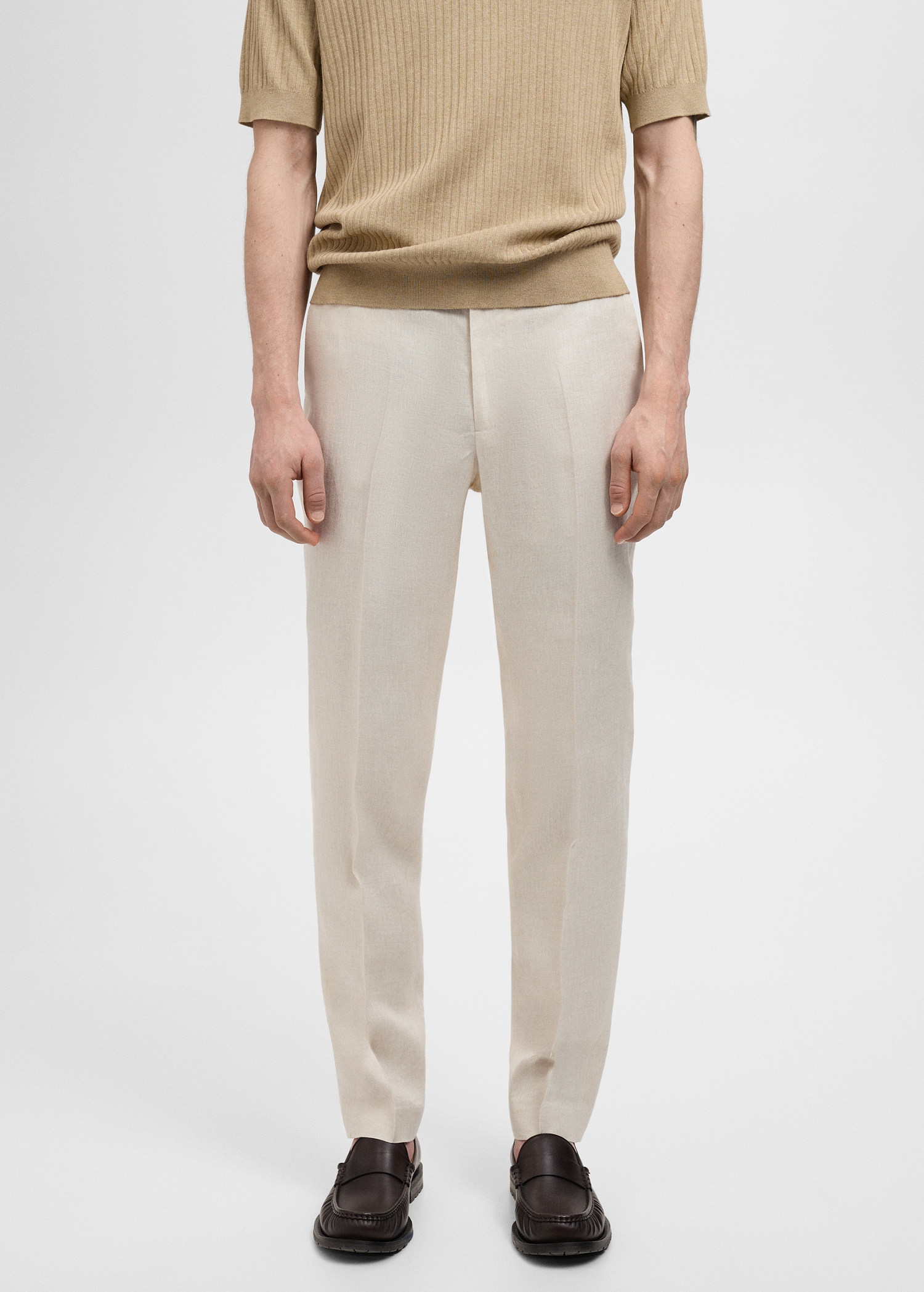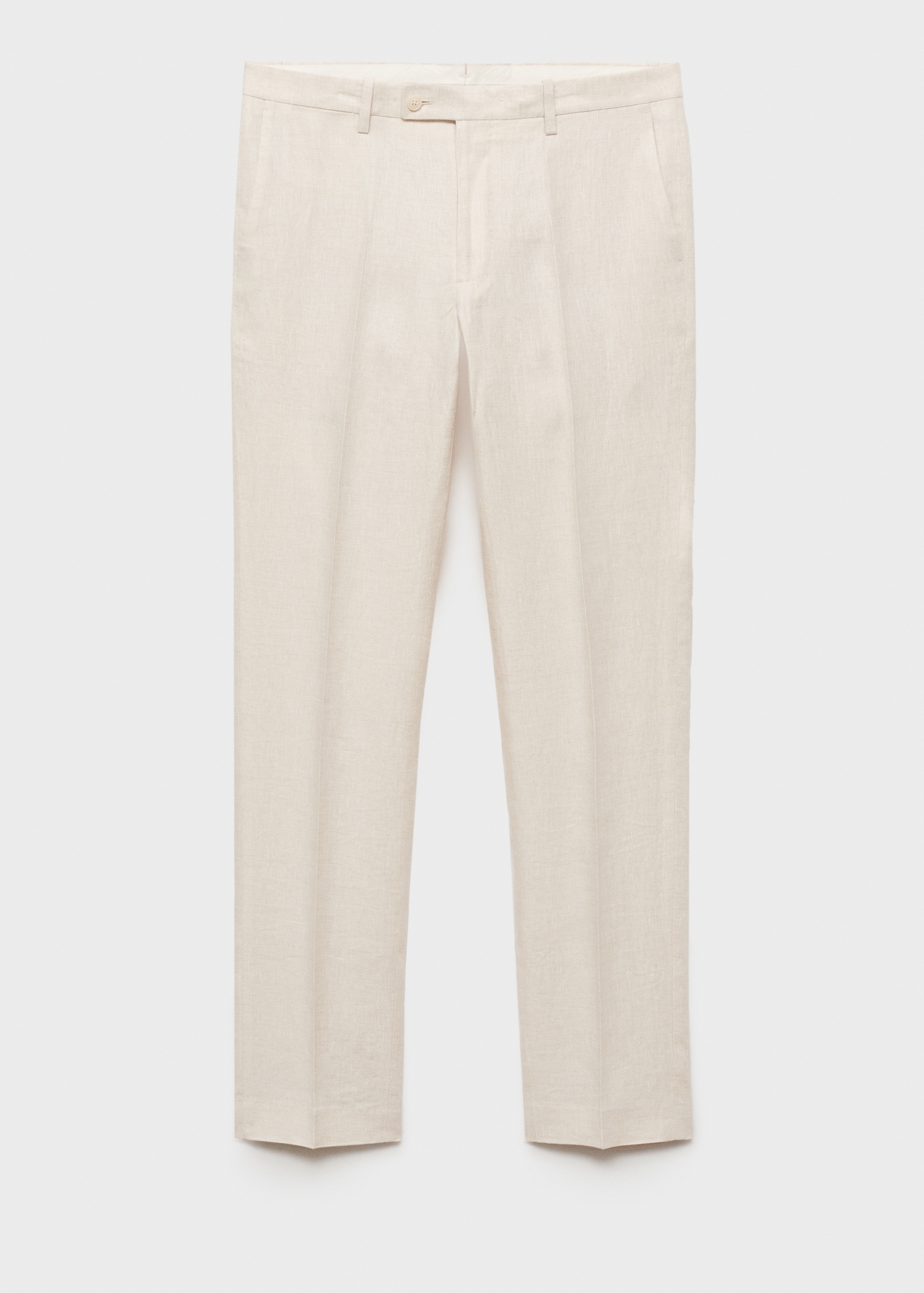 Slim fit. 100% linen fabric. Belt loops. Tailoring collection. Front closure with double-breasted buttons and zipper. Coin pocket. Two side pockets. Two welt pockets with button at the back. Ironed stripe detail at front and back