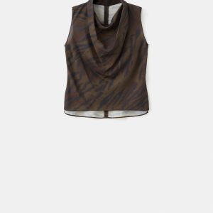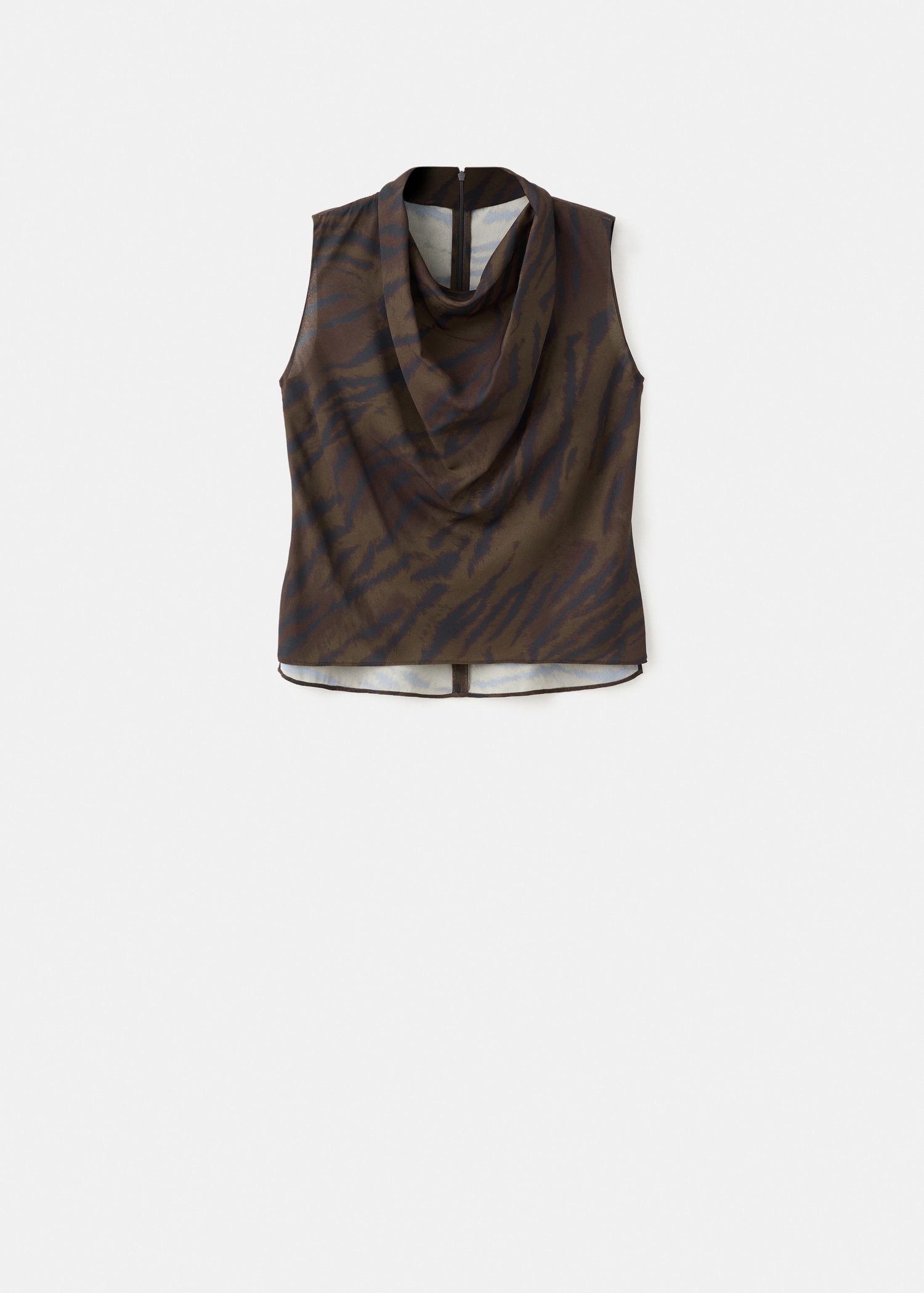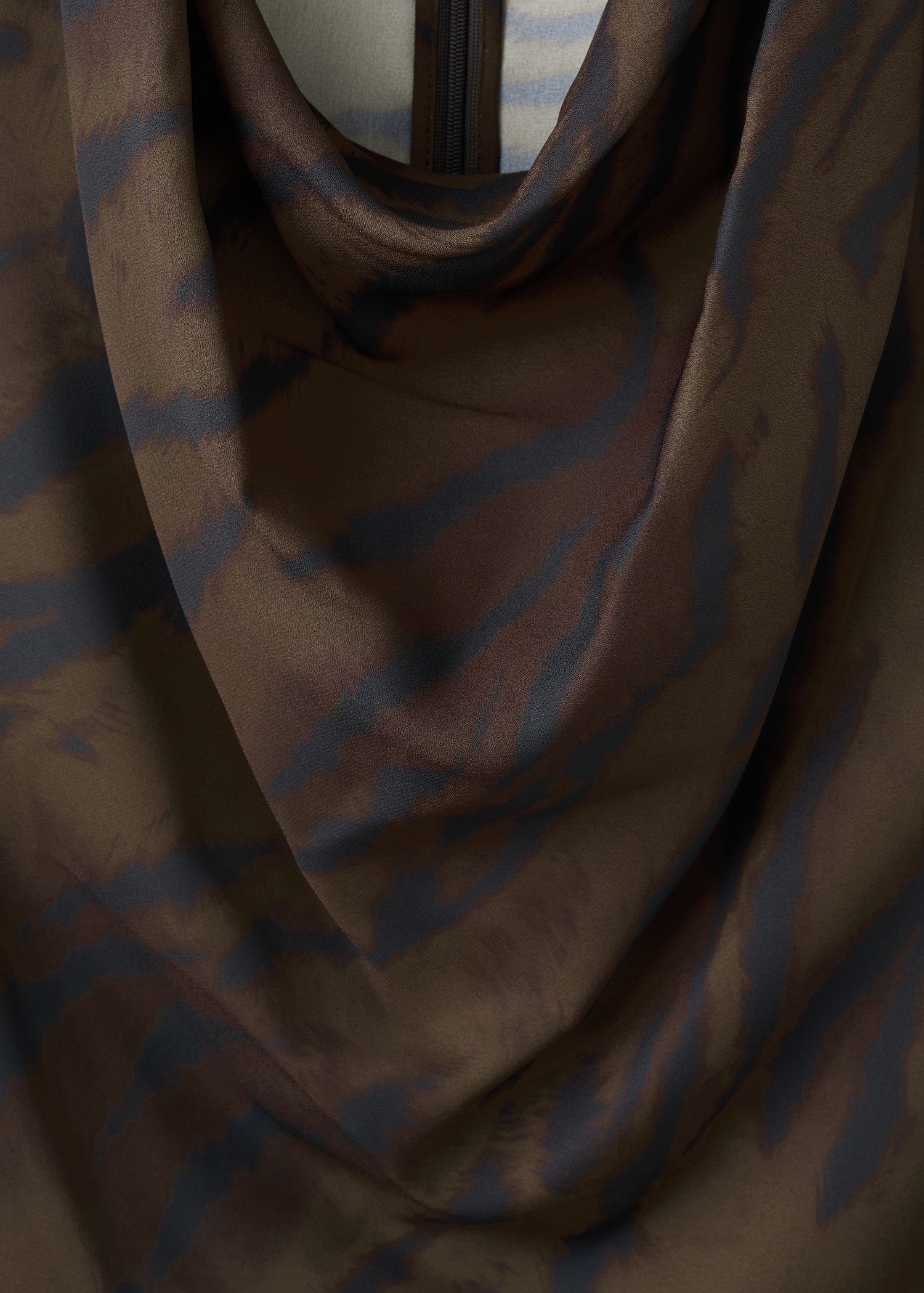 Straight Design. Animal print. Draped neckline. Wide straps. Hem with two side slits. Back zipper closure