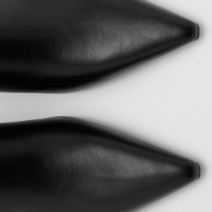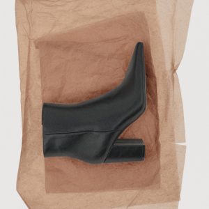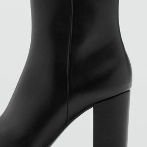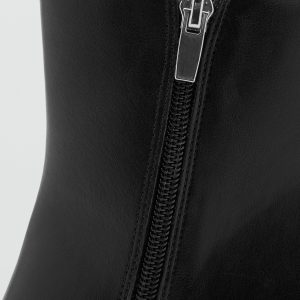 Short leg. Pointed. Block heel. Side zip closure. Inner lining. 3.35 in heel