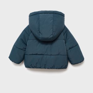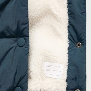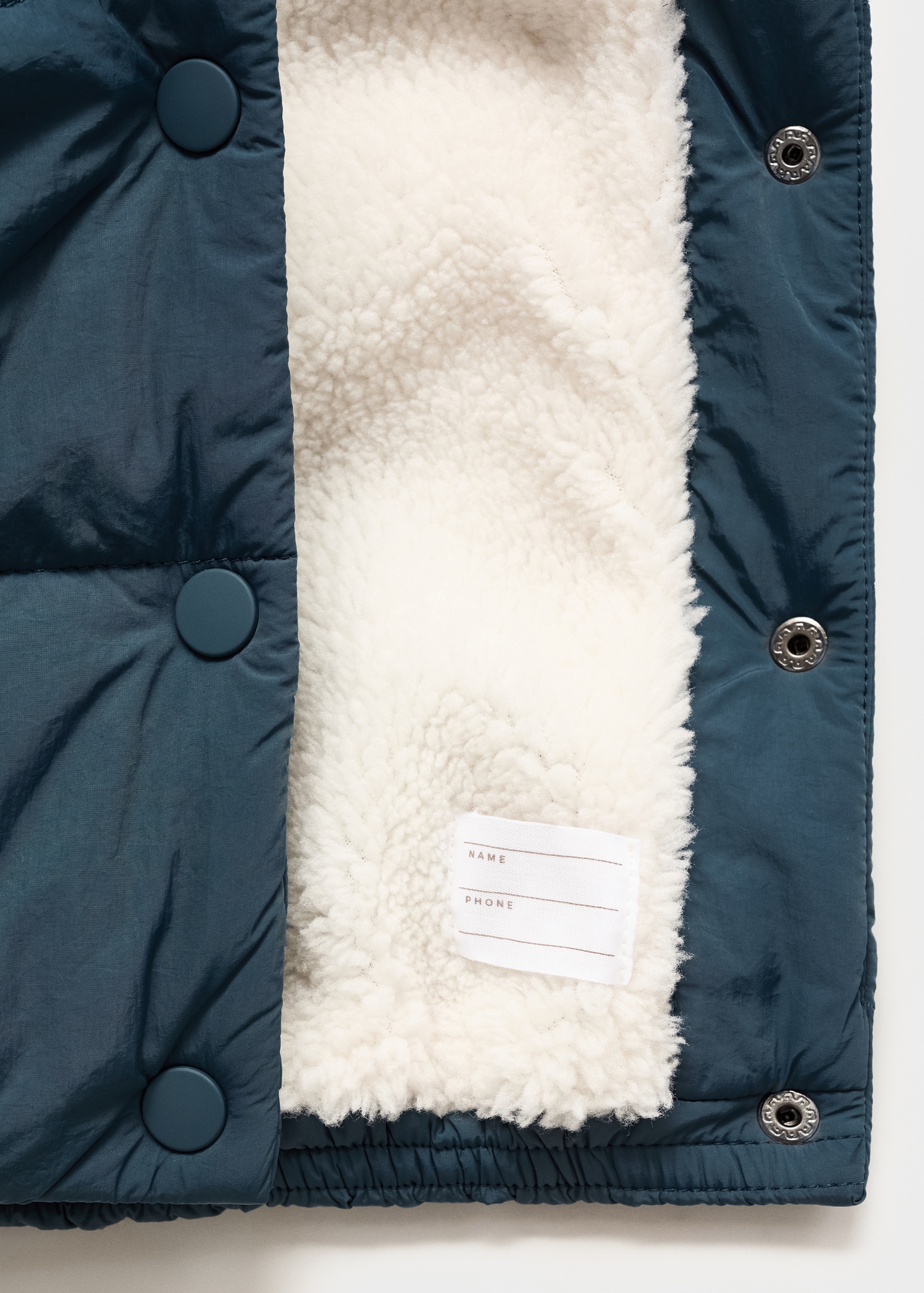 Quilted fabric. Polyester fabric. Fur-effect lining. Straight Design. With hood. Long Sleeve. Front button closure. Two side pockets