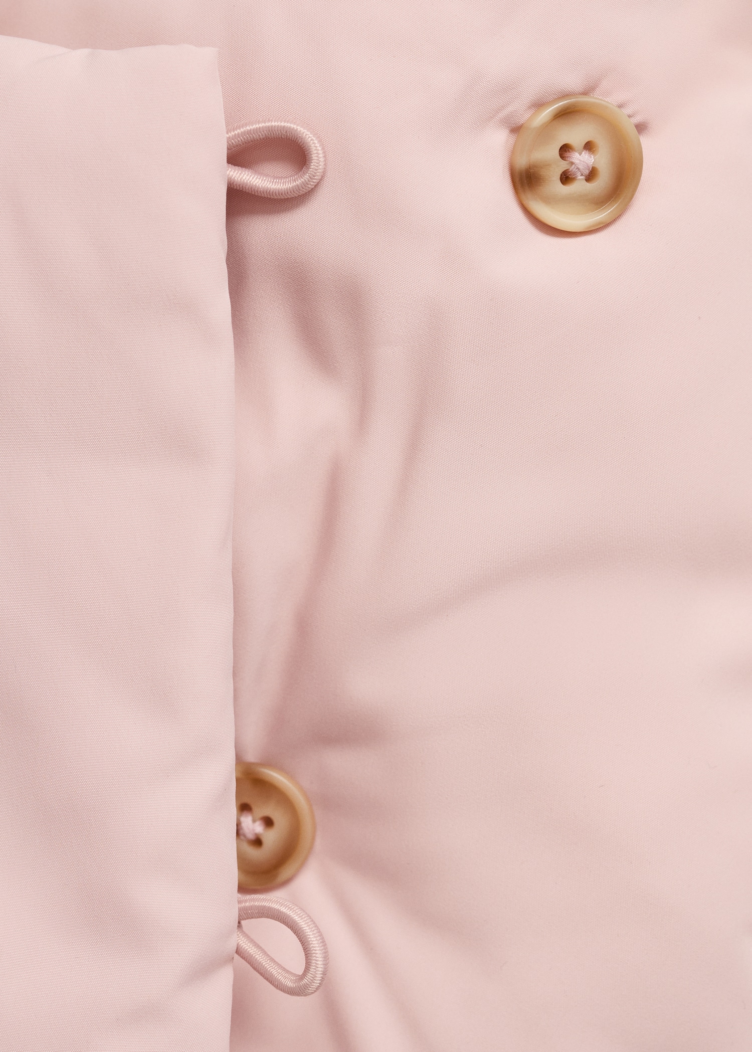Quilted fabric. Straight Design. Cross-locking. Button closure. Long Sleeve. Hood with synthetic hair detail. Inner polar fleece lining