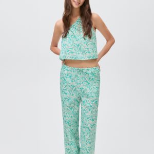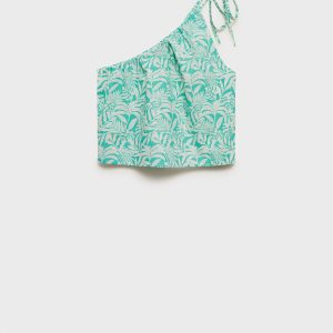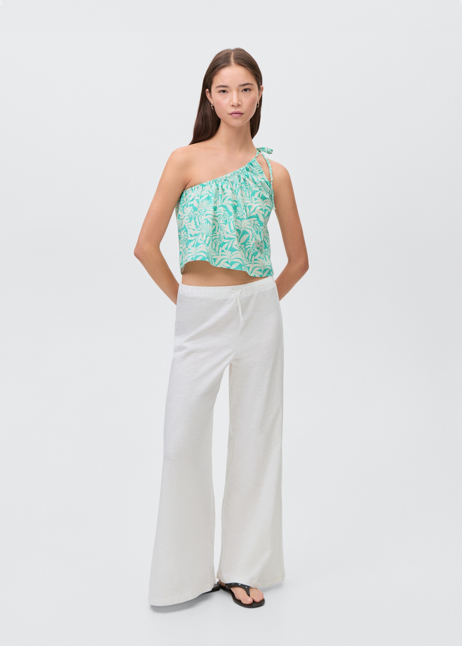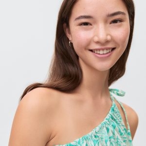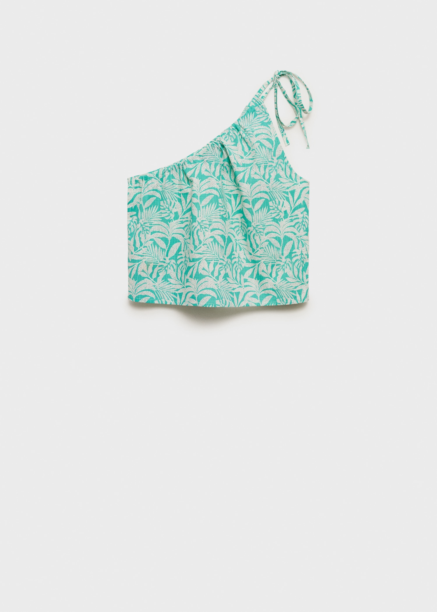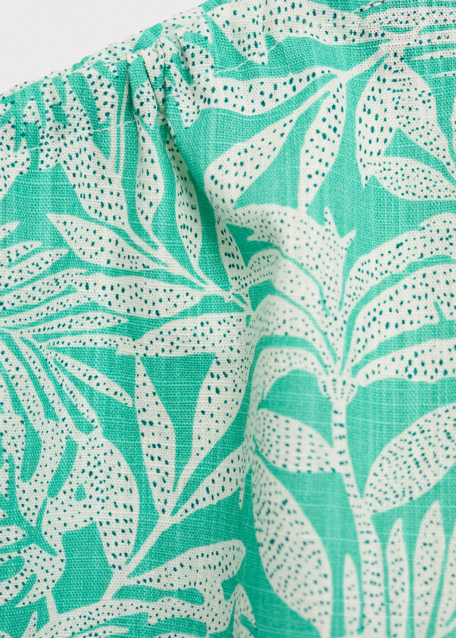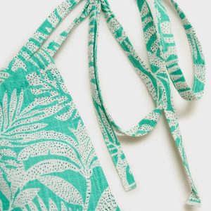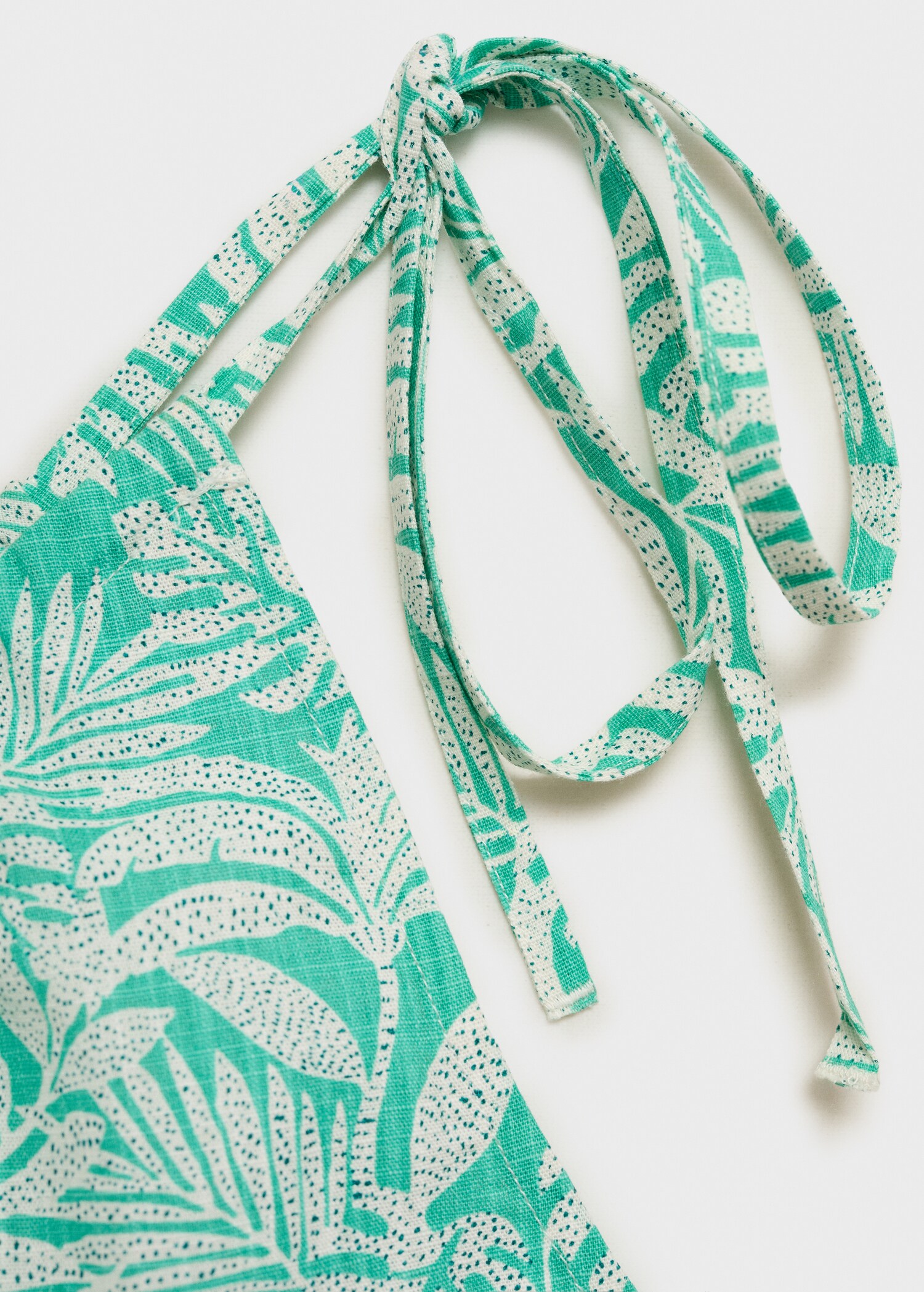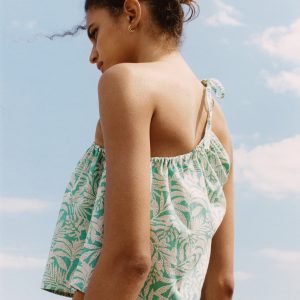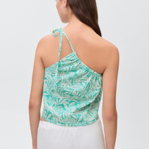 100% cotton fabric. Asymmetric design. Short design. Printed design. Leaf print. Asymmetric neckline. Strap with bow. Adjustable thin strap. Total look