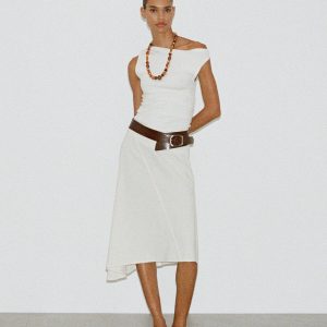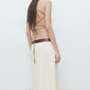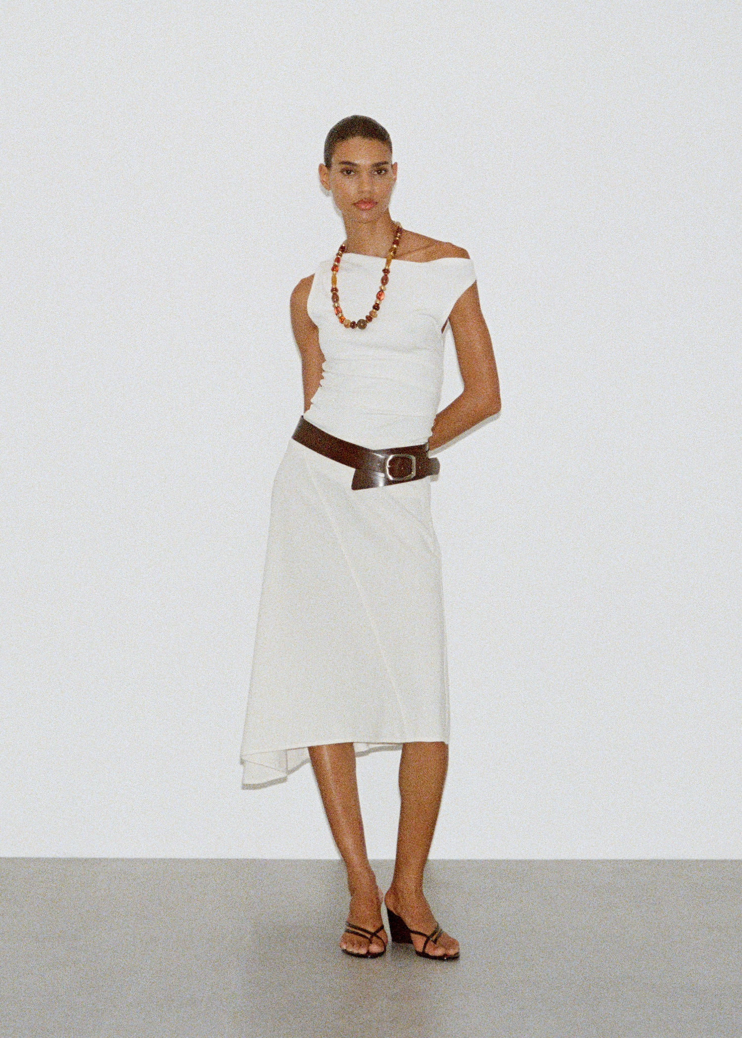 Cotton and linen blend fabric. Midi design. A-line design. Mid-rise. Asymmetric hem. Side zip closure