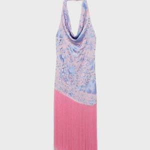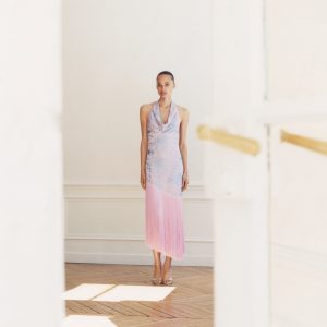 Asymmetrical dress with embroidered fringes