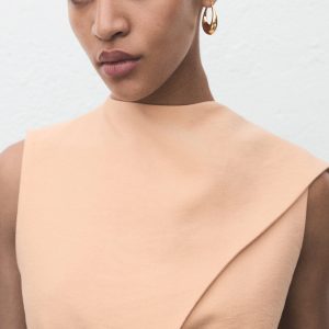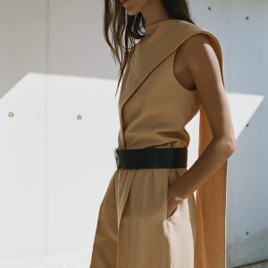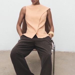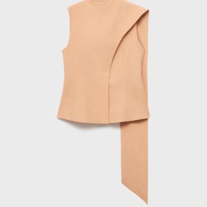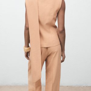 Crafted from lyocell fabric, this top features an asymmetrical design with sleeveless armholes. The round neckline is adorned with a foulard. It comes with matching pants for a more elevated look