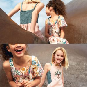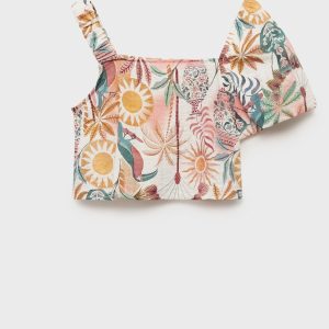 Viscose fabric. Asymmetric design. Straight Design. Printed design. Multicolor print. Top effect. Thin strap. Puffed short sleeve. With inner lining. Total look
