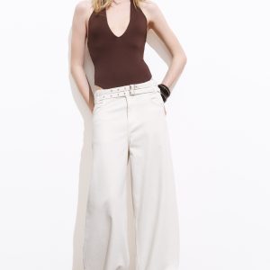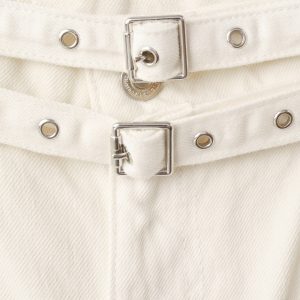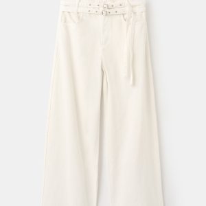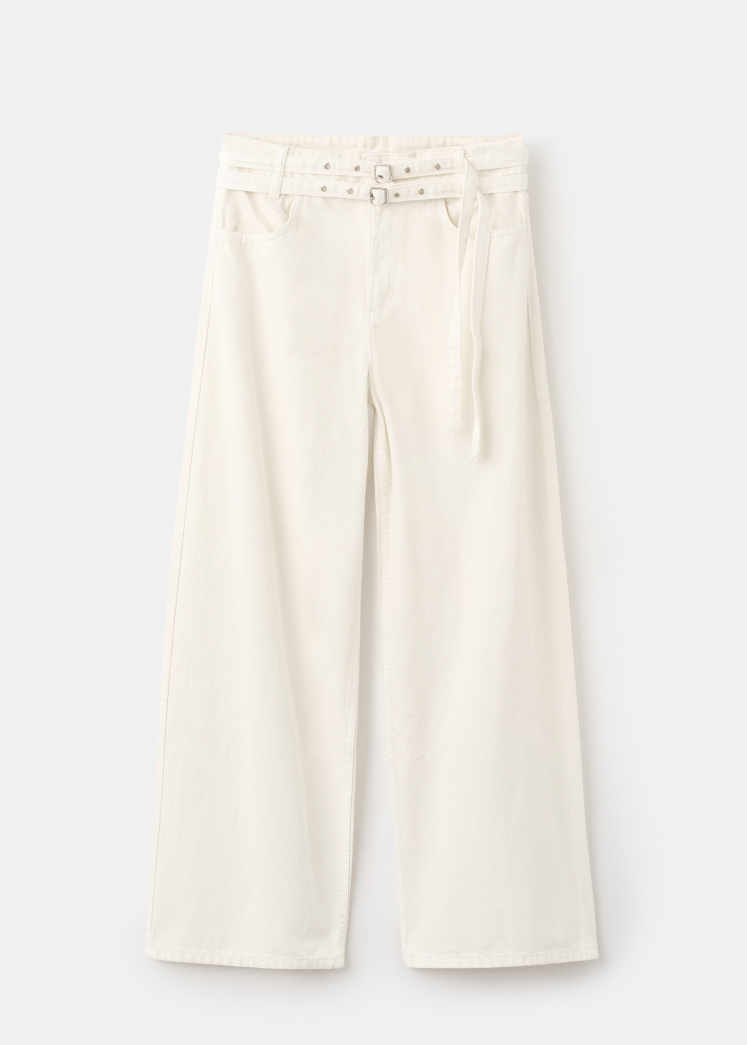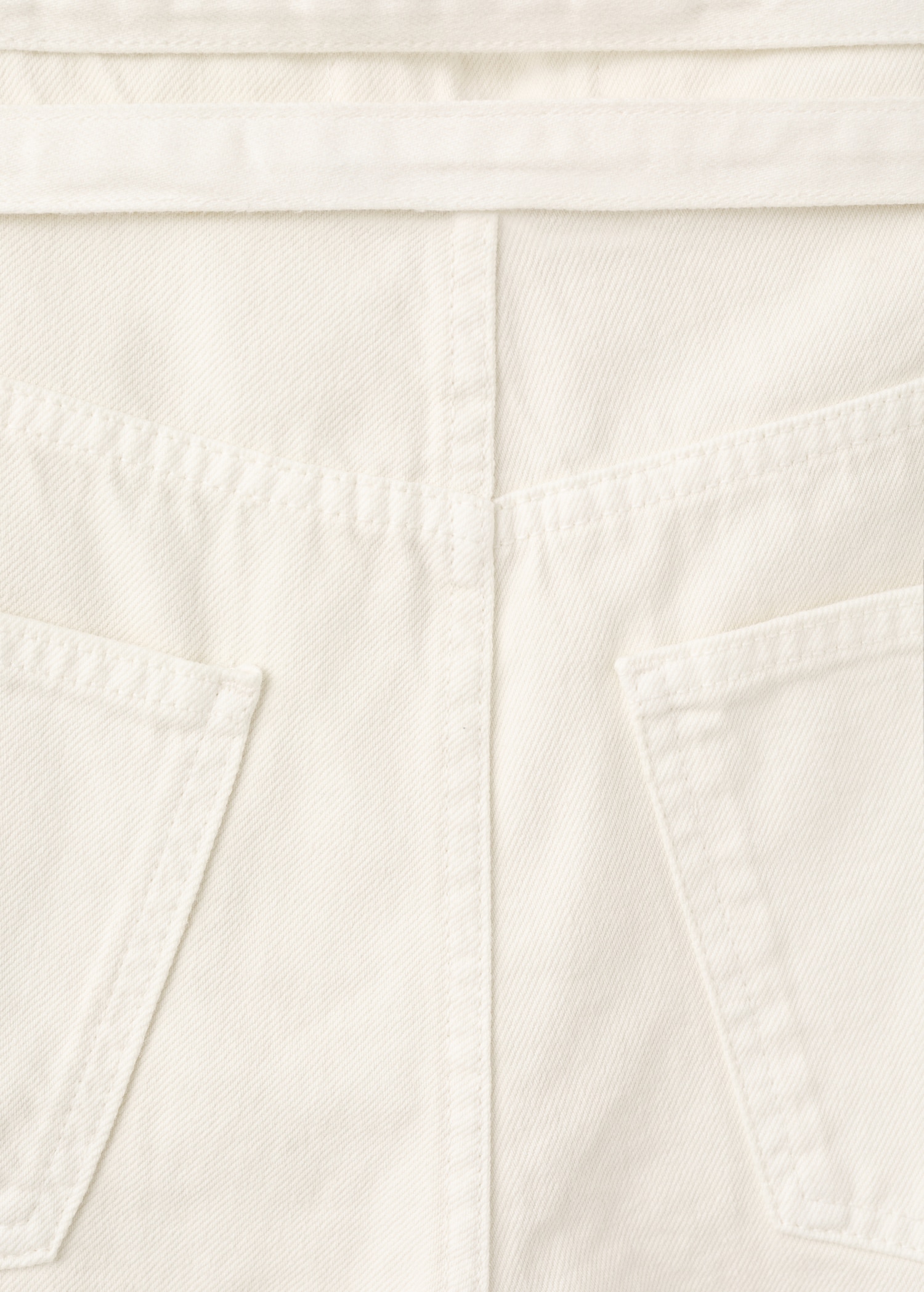 Cotton denim fabric. Balloon design. Barrel style. Ankle brace. Mid-rise. Two side pockets. Double decorative belt. Zip and button closure. Inseam 31.49 in. Total look