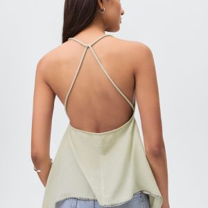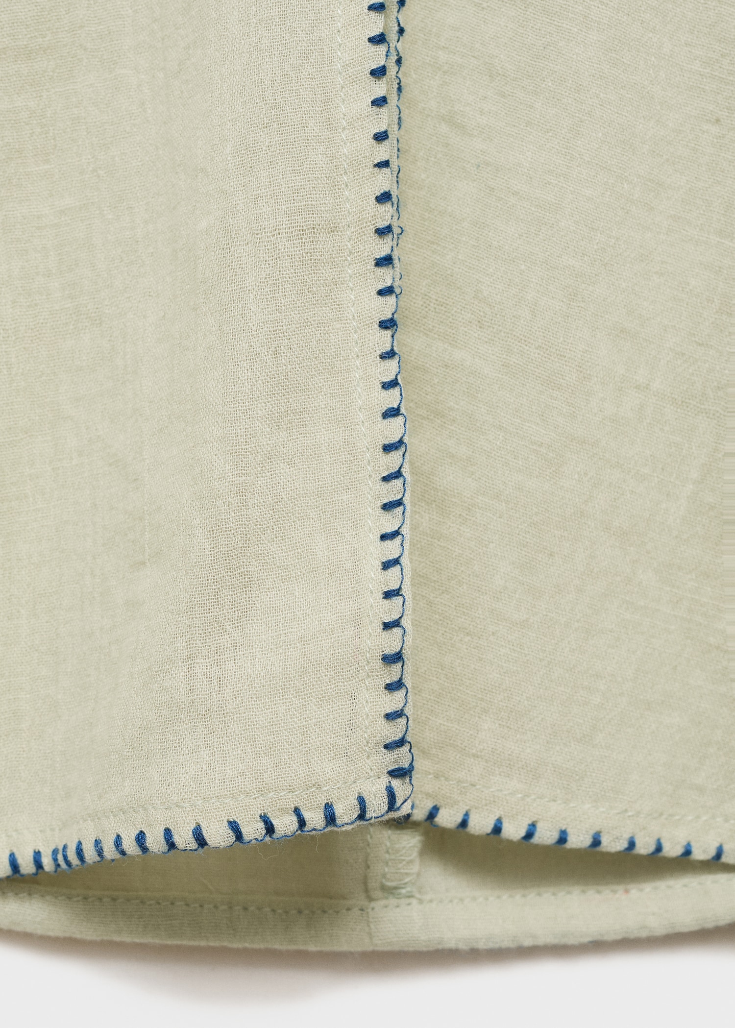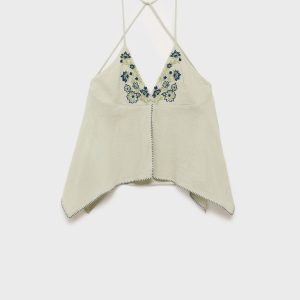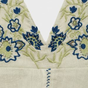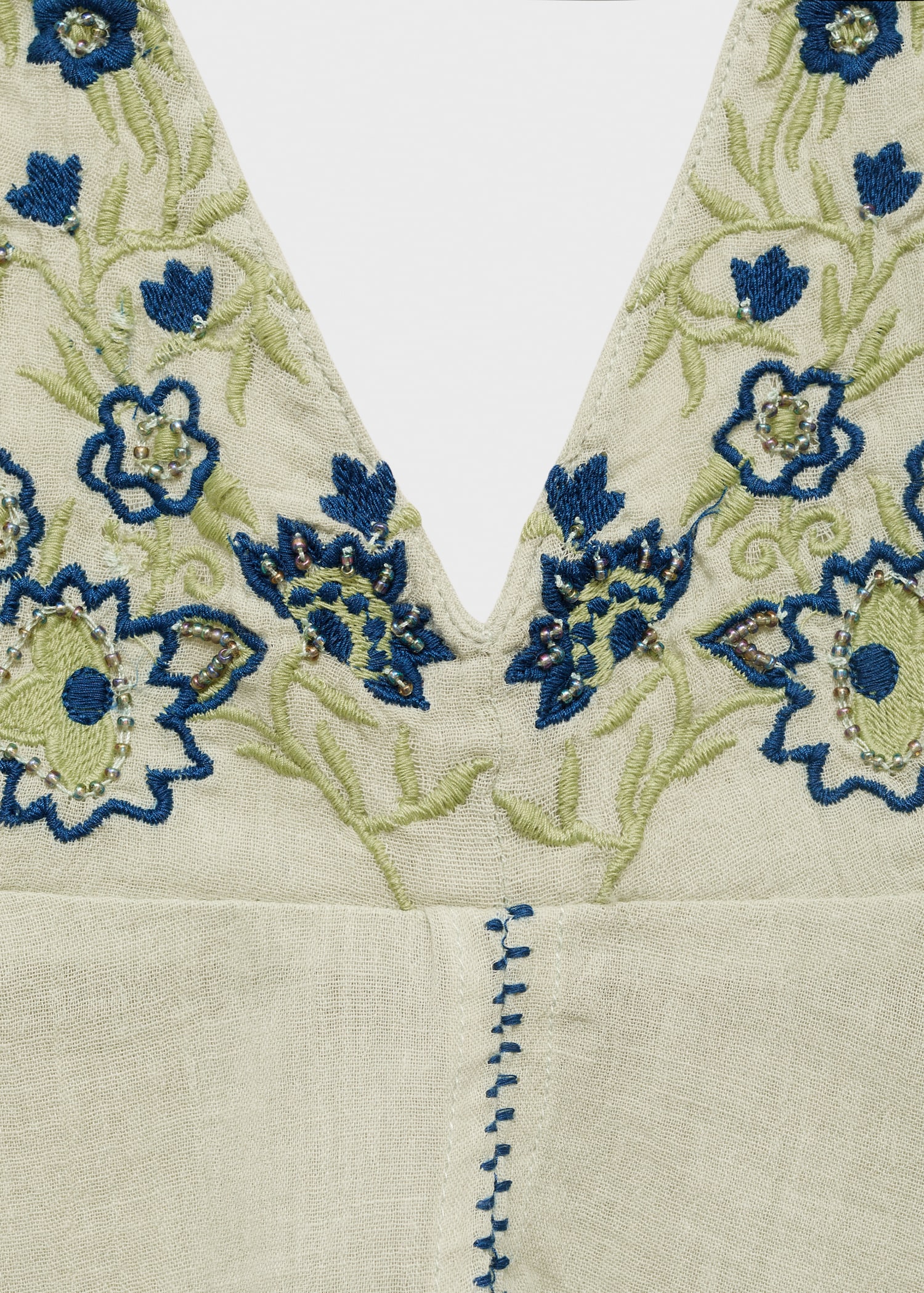 100% cotton fabric. Asymmetric design. V-neck. Embroidered design. Floral embroidery. Thin straps. Open back. Beaded detail. Front opening on the hem