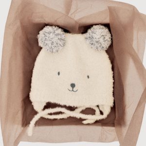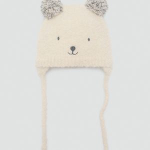 Knitted fabric. Teddy bear design. Decorative tassels. Tie closure. Available set. This hat has matching scarf, gloves and socks