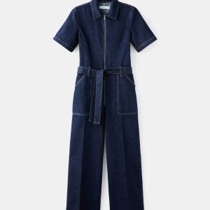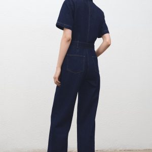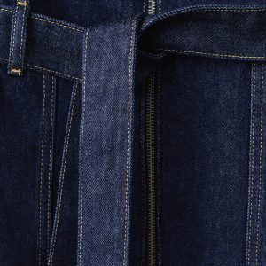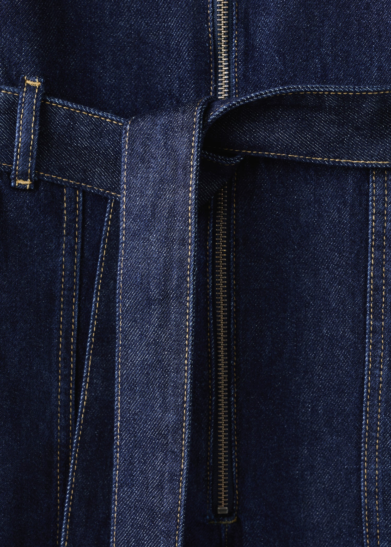 Cotton denim fabric. Long design. Straight Design. Shirt collar. Long sleeves with buttoned cuffs. Belt loops. Two patch pockets on the front. Two patch pockets at the back. Nightgown-style belt. Front zipper closure. Online Exclusive. This garment is part of our casual collection, designed to stylishly accompany you in your day-to-day life