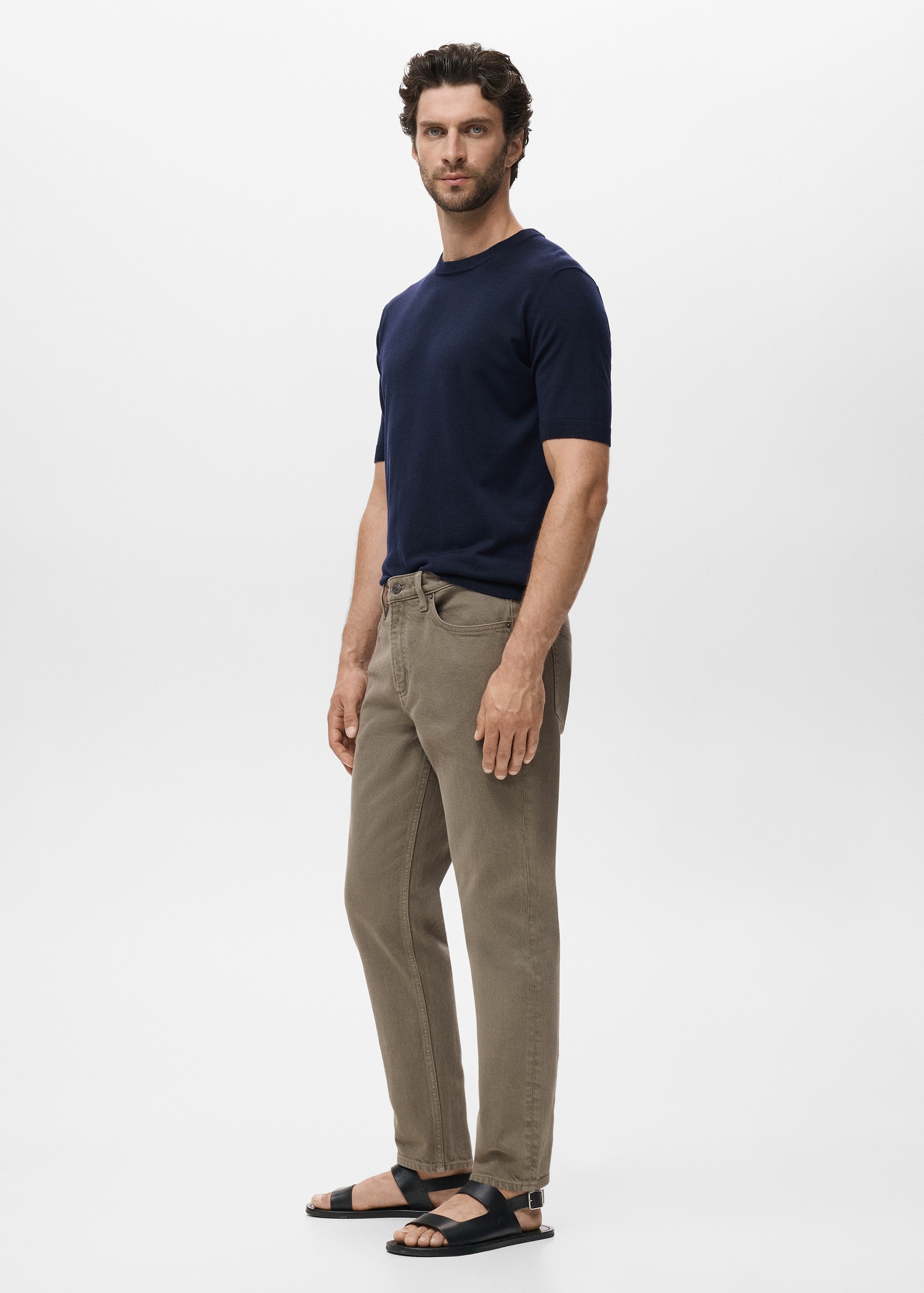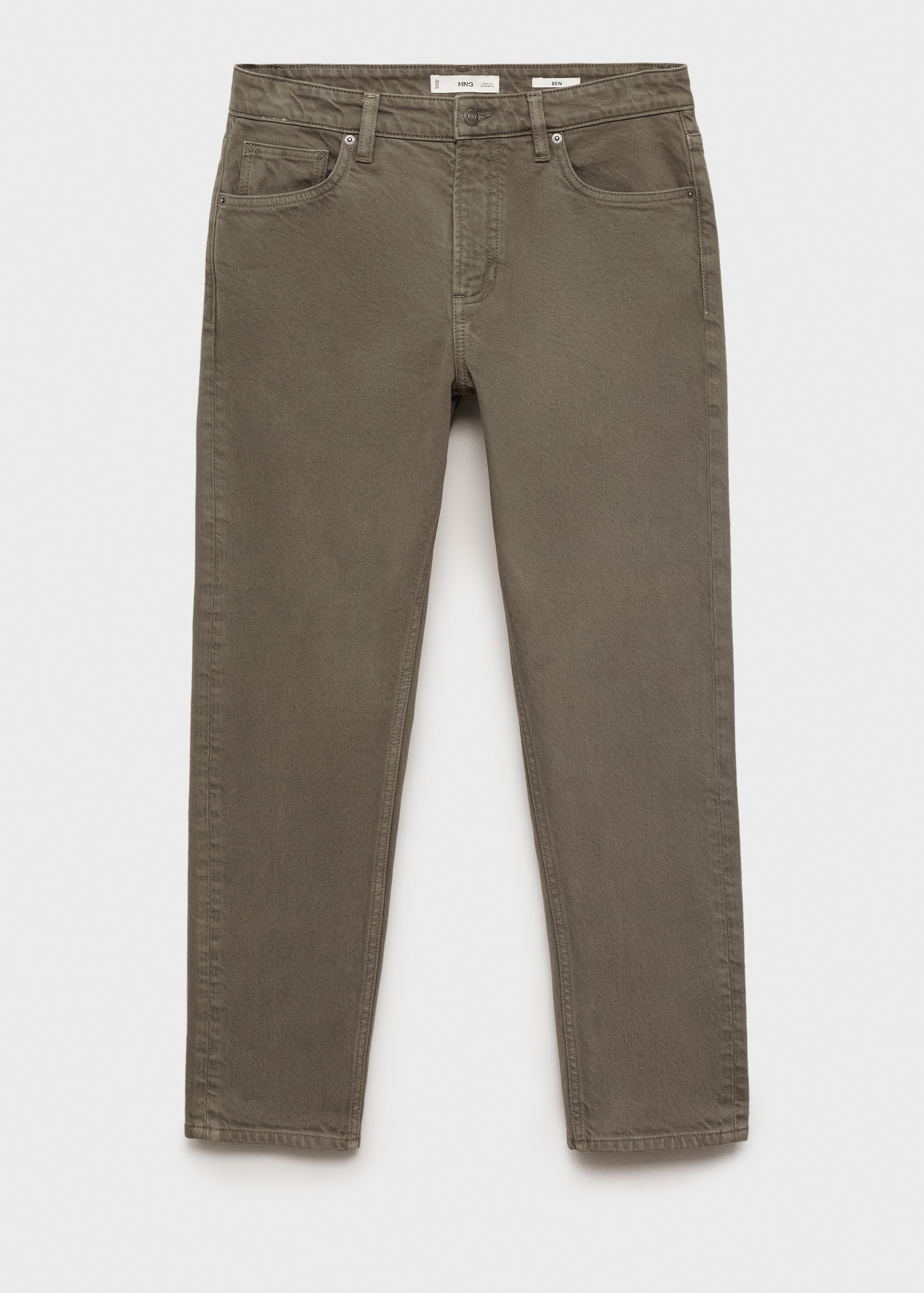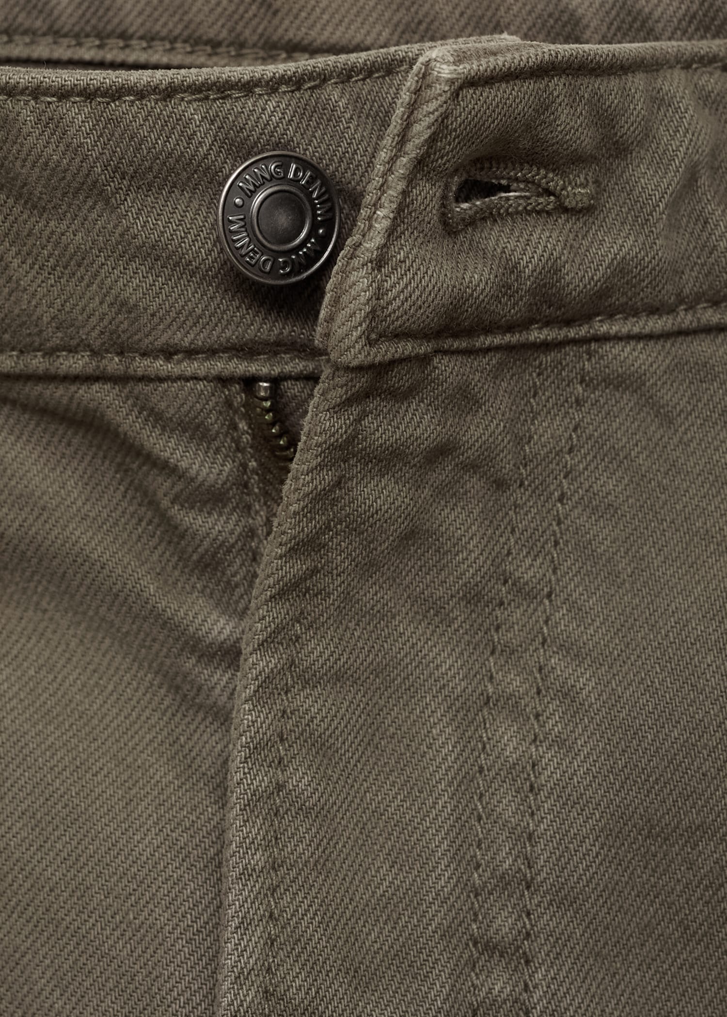 Tapered fit: wide cut at the top that narrows from the knee to the ankle. Crop design. Cotton denim fabric. Belt loops. Button and zipper closure. Coin pocket at hip height. Two side pockets. Two patch pockets at the back