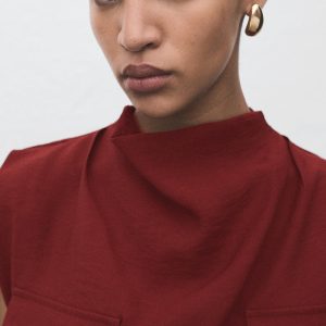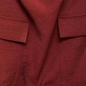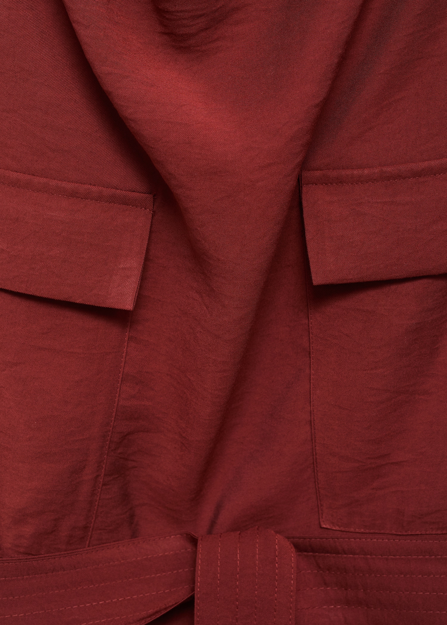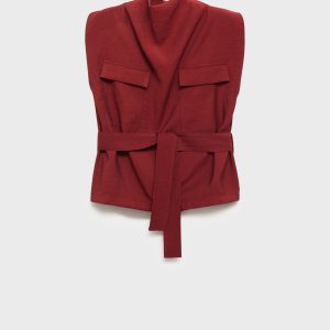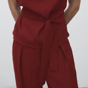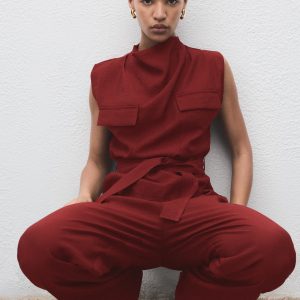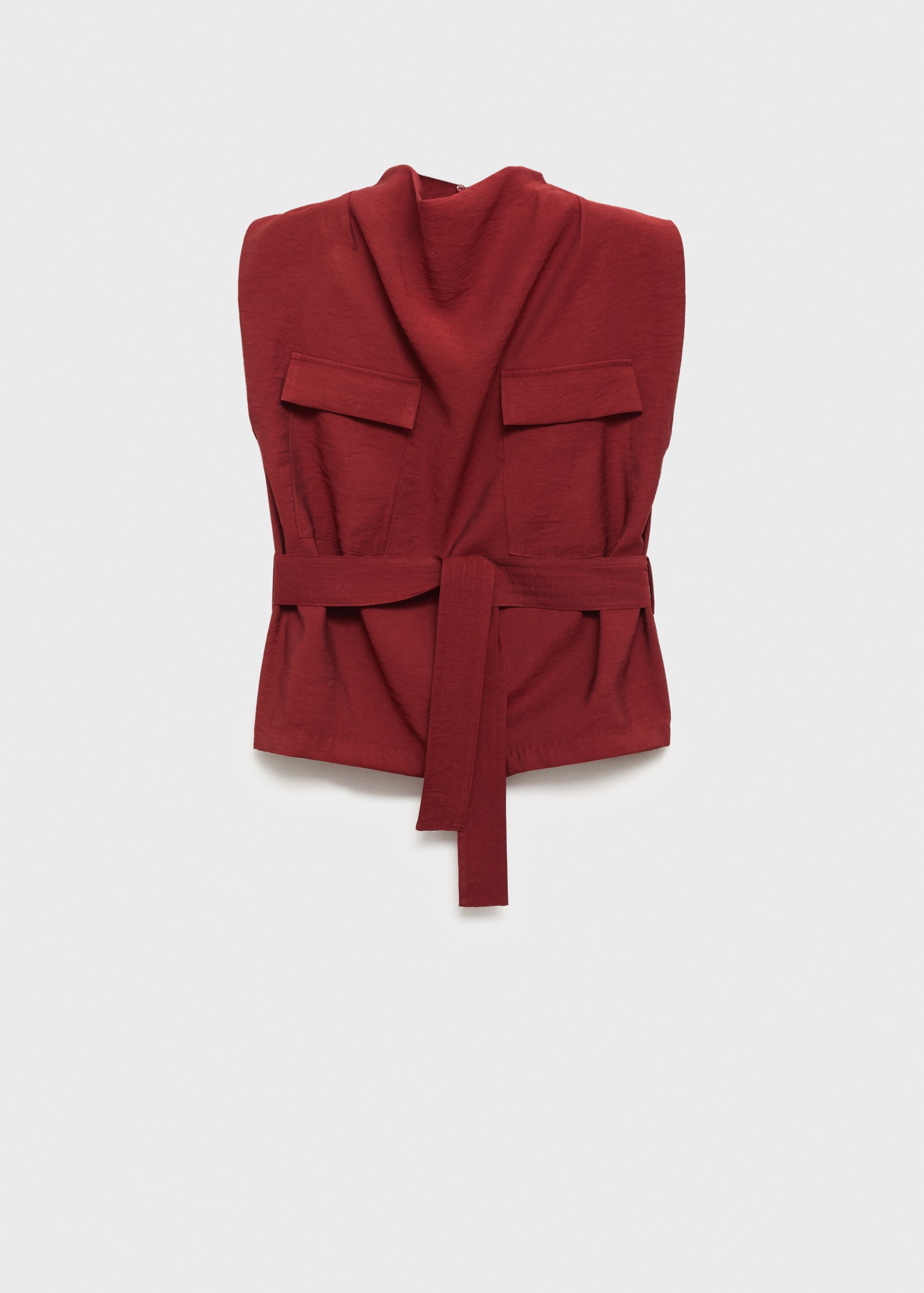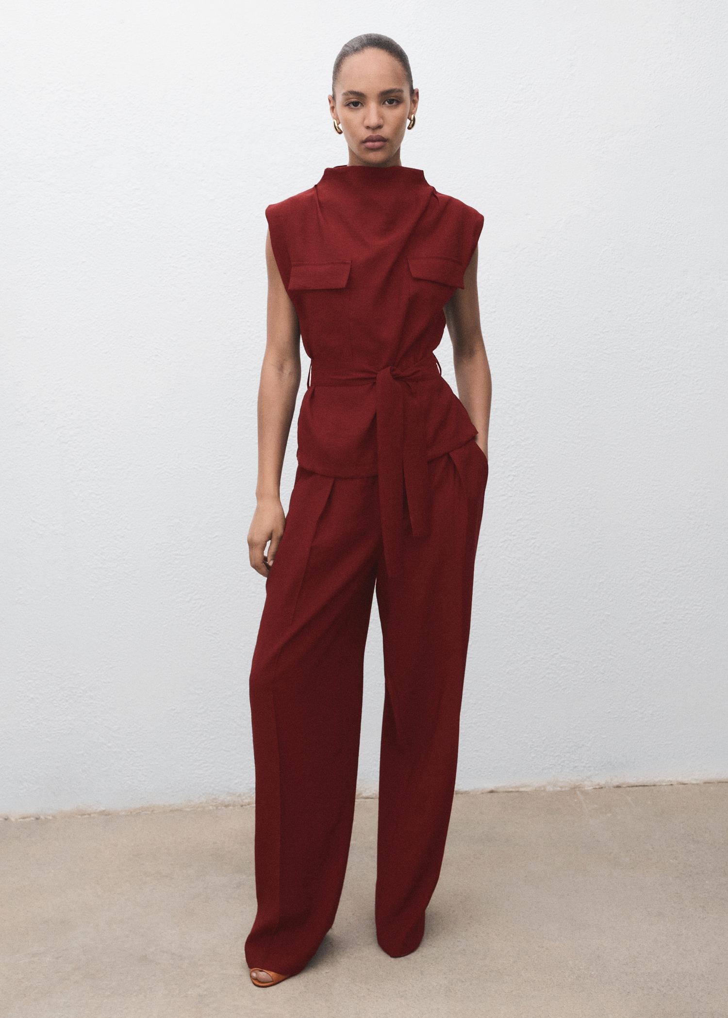 Crafted from fluid fabric, this garment features a straight design with a draped neckline and a sleeveless cut. It includes two flap pockets on the chest and an adjustable belt. It comes with matching pants for an ideal total look