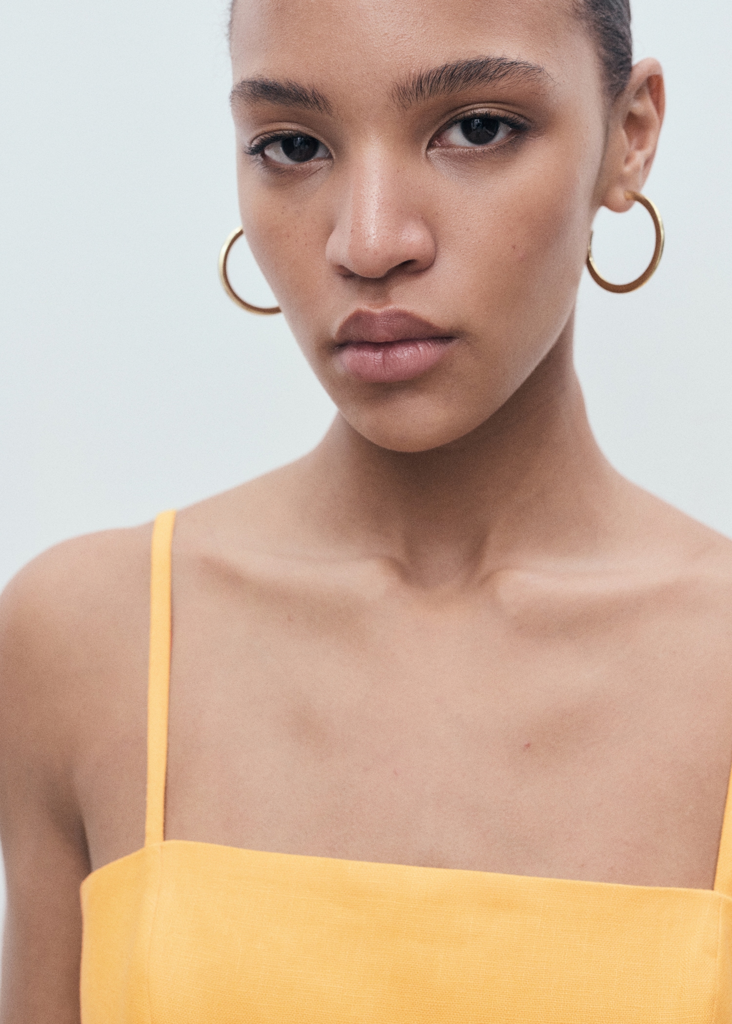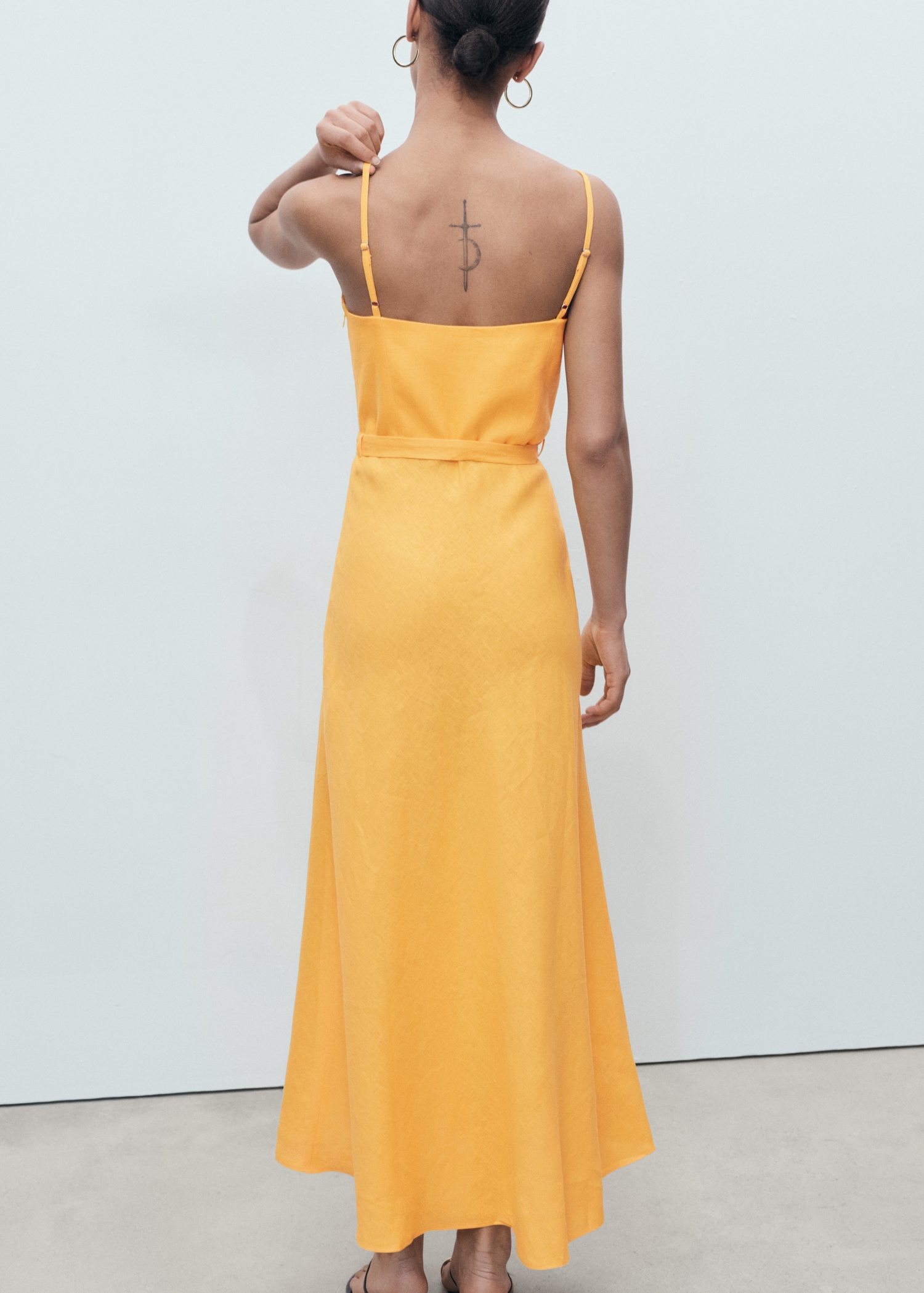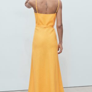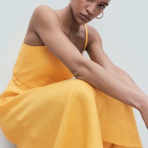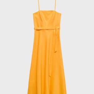 100% linen fabric. Long design. A-line design. Low neckline. Sleeveless. Thin straps. Bow detail at the waist. Side zip closure. 100% cotton lining. The orange color is exclusive online. This garment is part of our casual collection, designed to stylishly accompany you in your day-to-day life