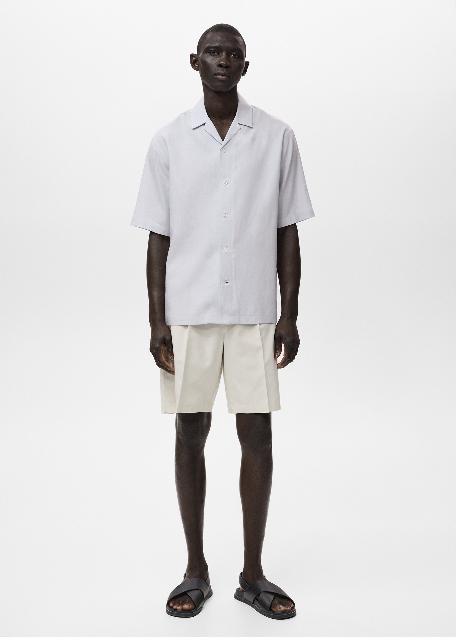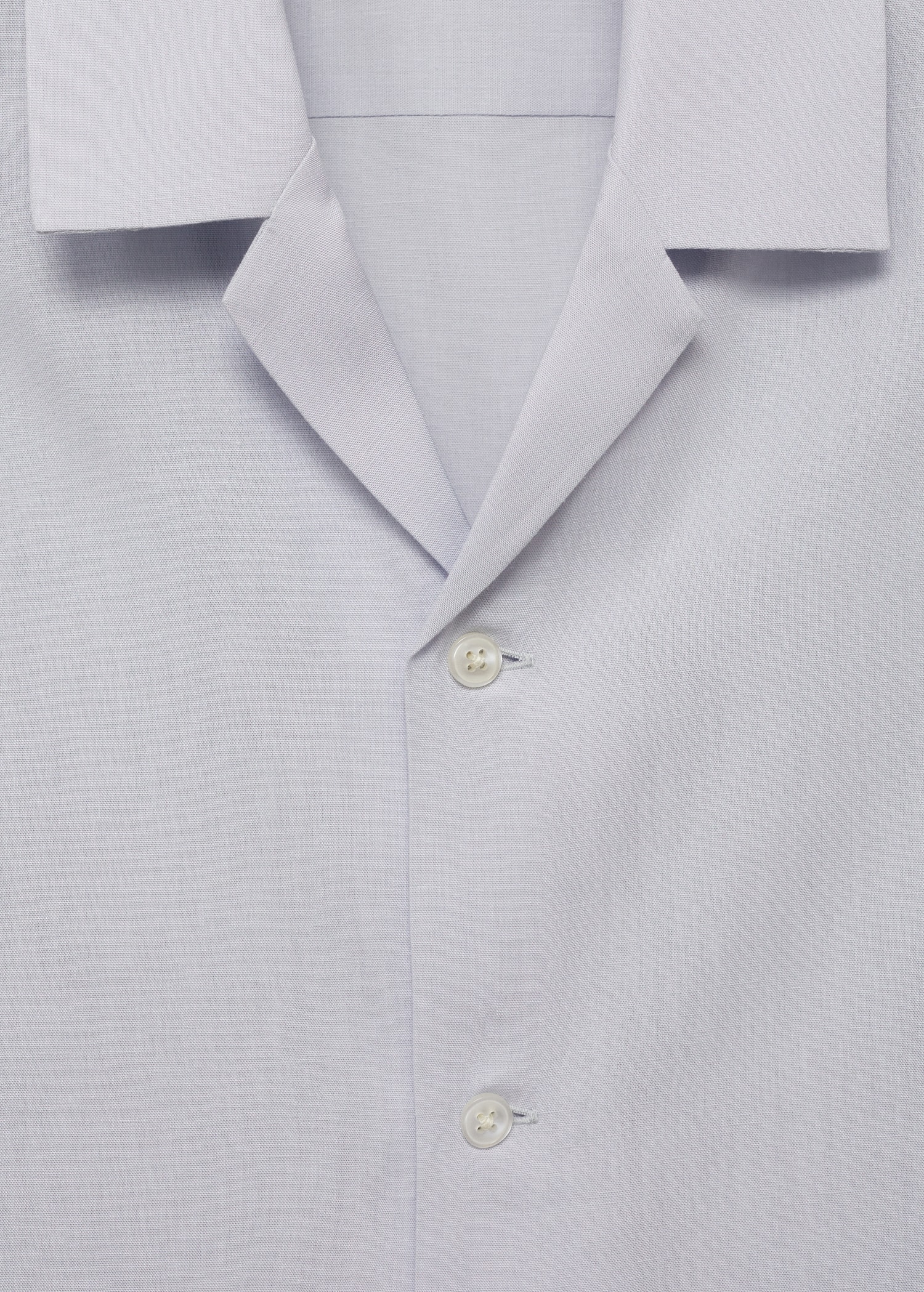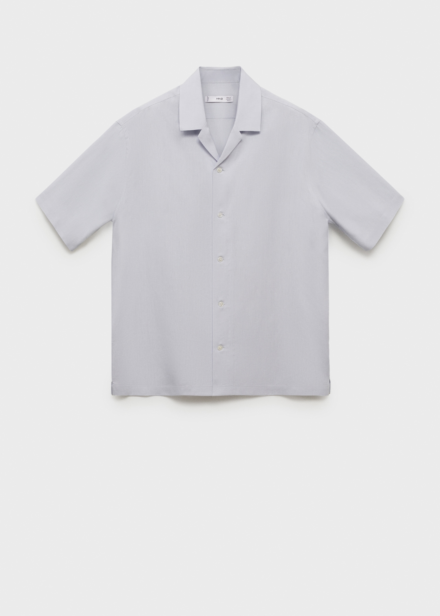 Linen and lyocell blend fabric. Fluid fabric. Regular Silhouette. Bowling collar. Front button closure. Short sleeve. Straight hem