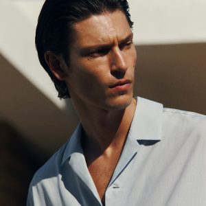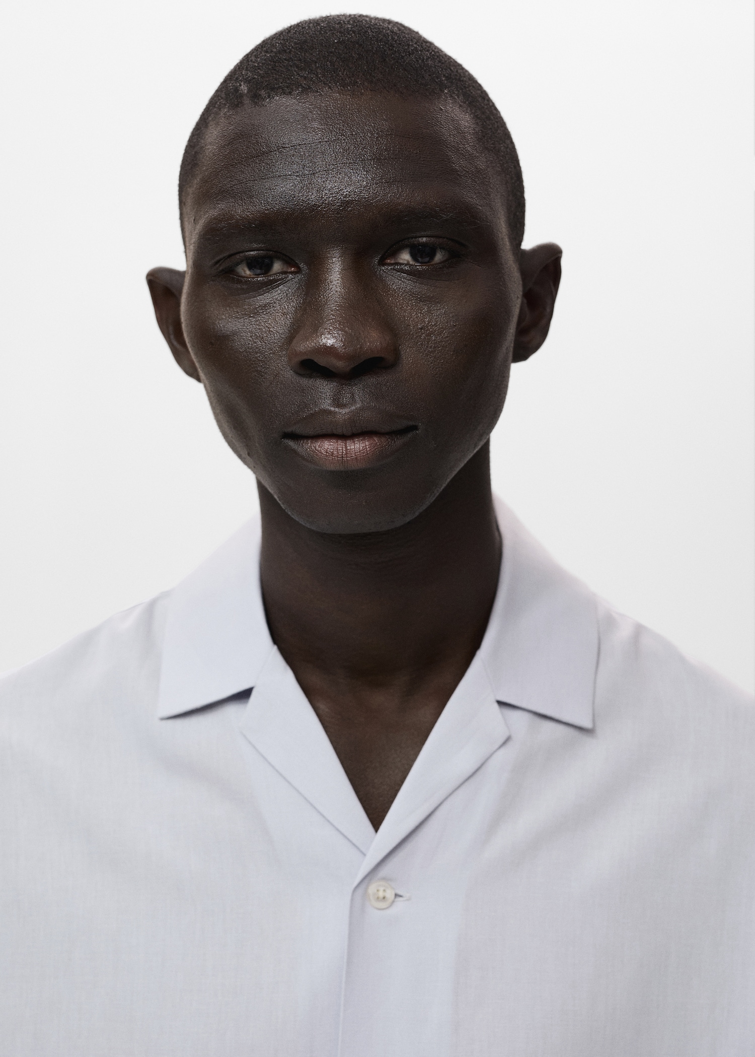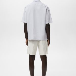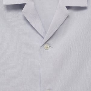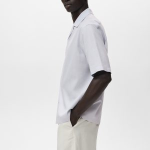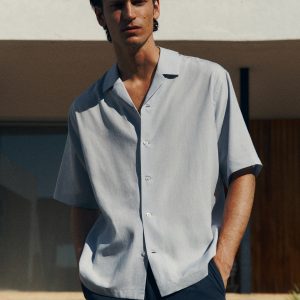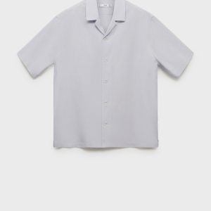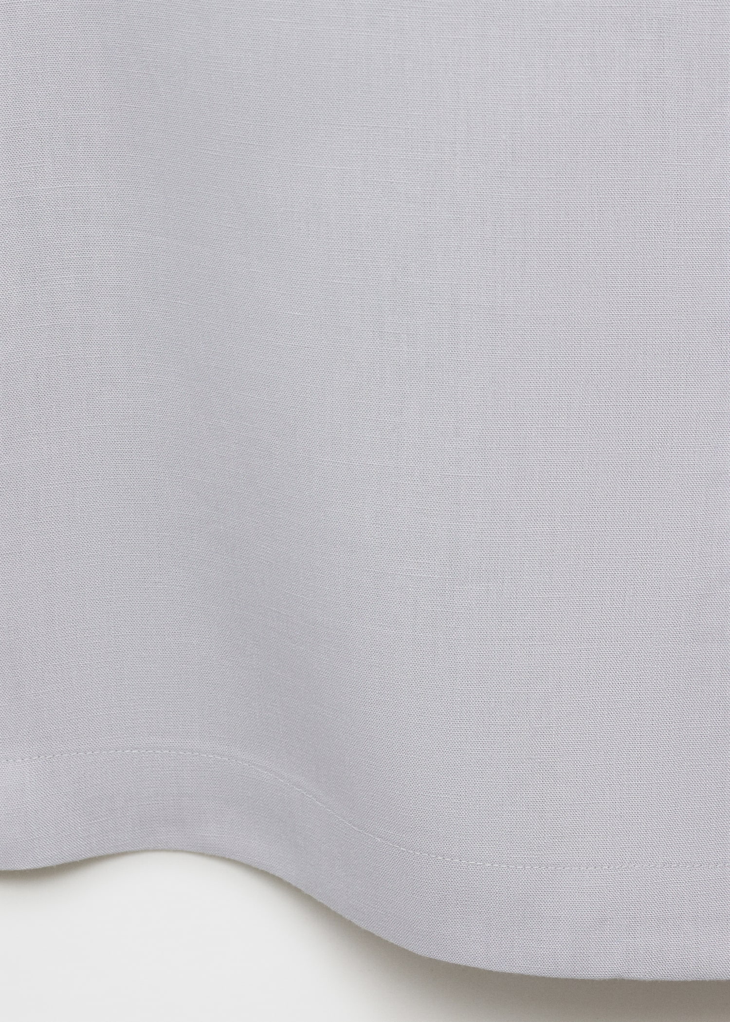 Linen and lyocell blend fabric. Fluid fabric. Regular Silhouette. Bowling collar. Front button closure. Short sleeve. Straight hem