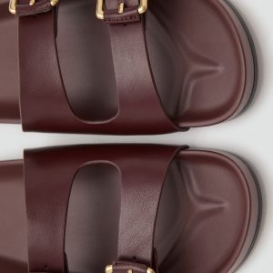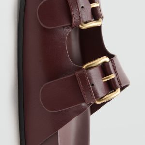 Flat design. Straps design. Straps with metal buckles. Open toe. No closure
