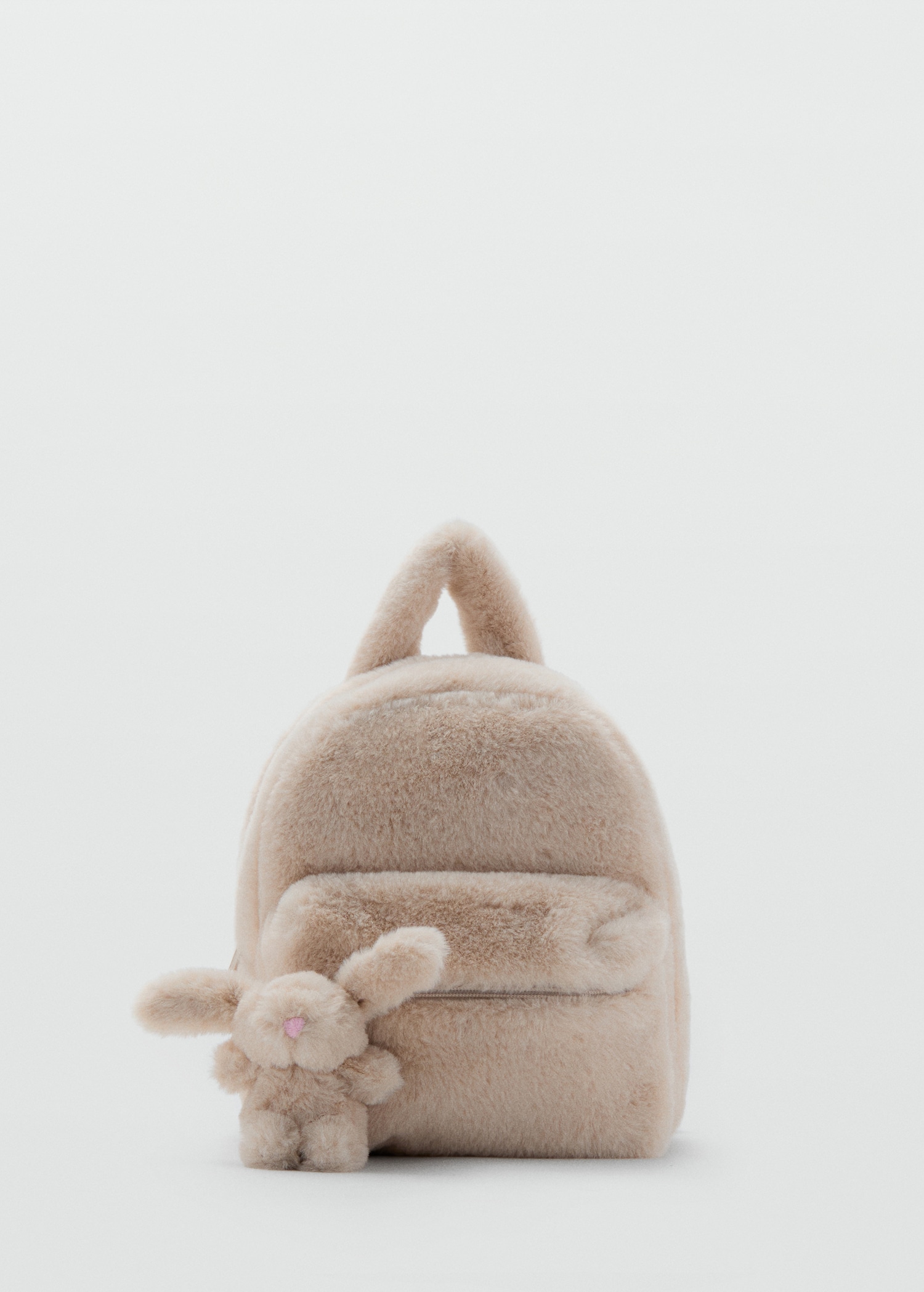Fur fabric. Animal design. Little rabbit design. Detachable bunny. Zipper closure. Front patch pocket. Two adjustable handles. Back to school