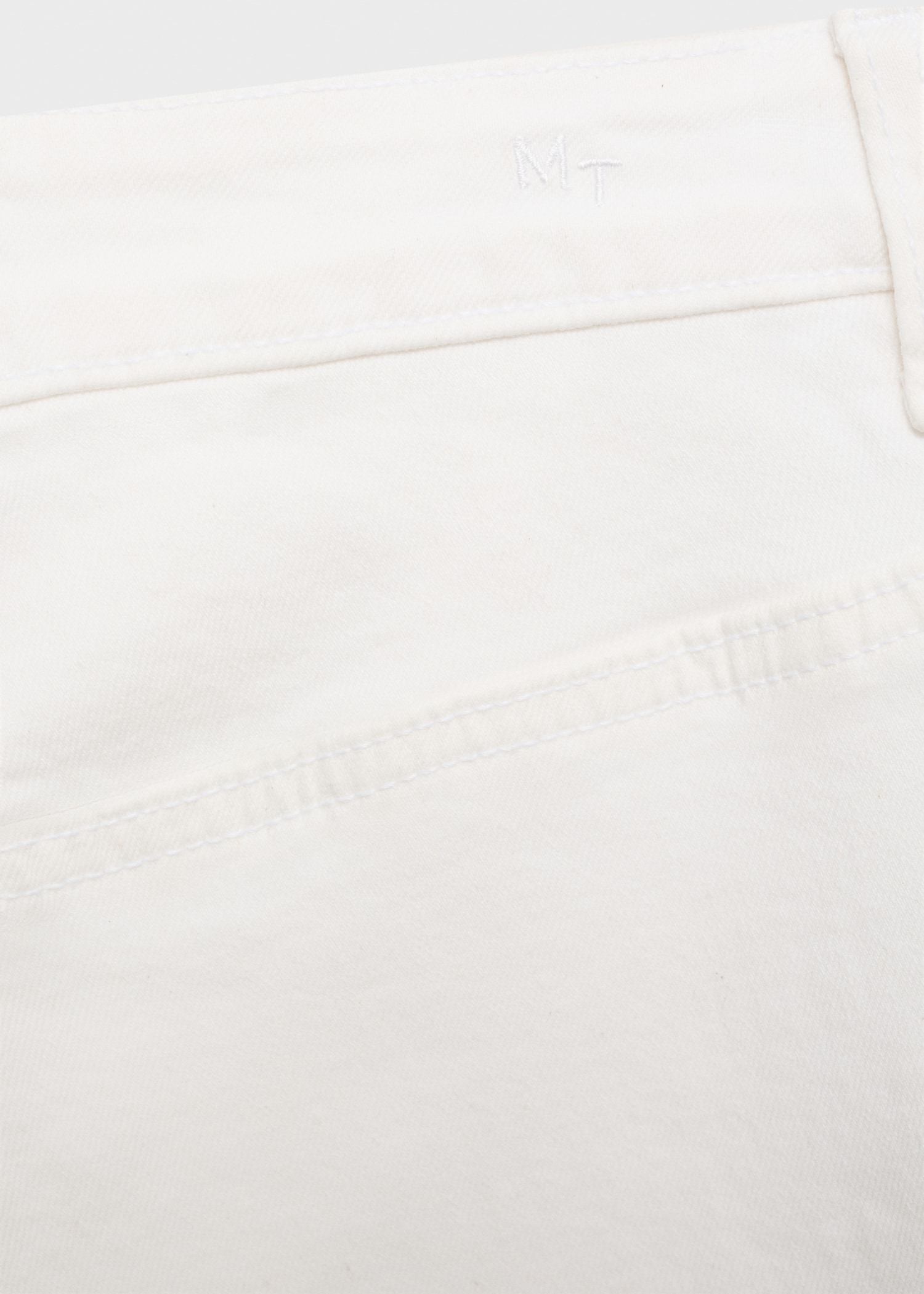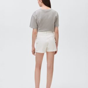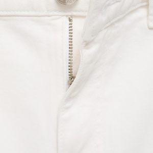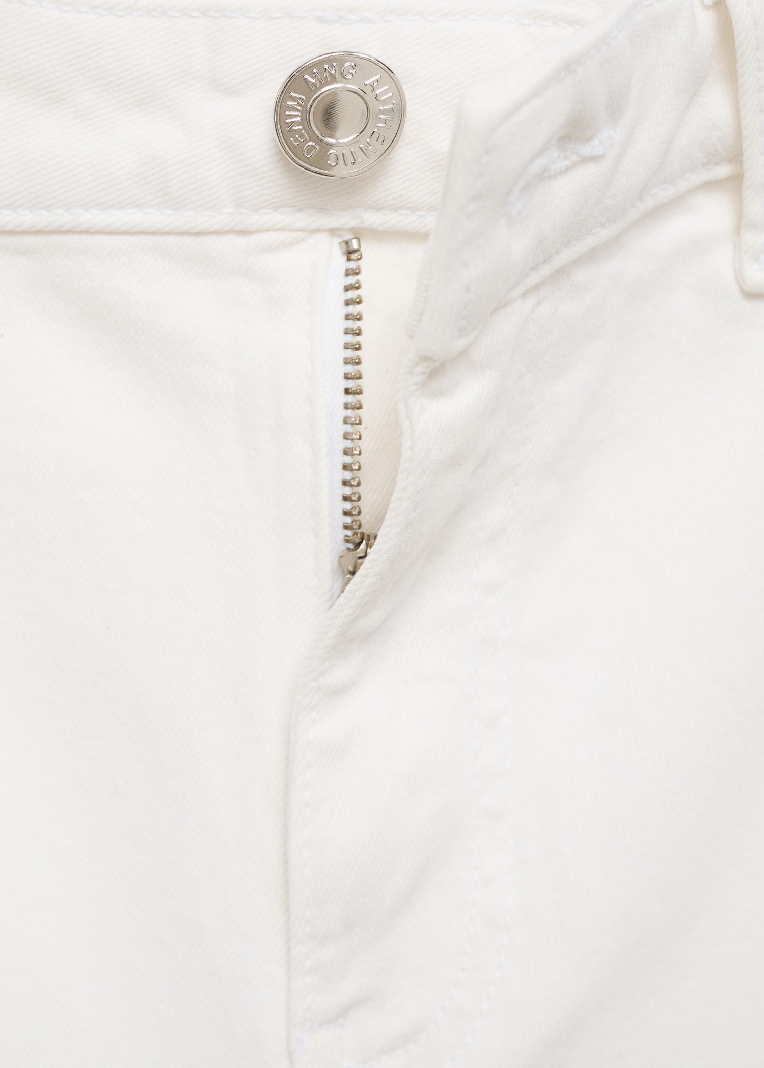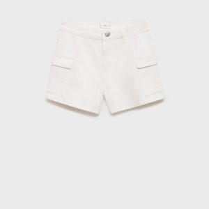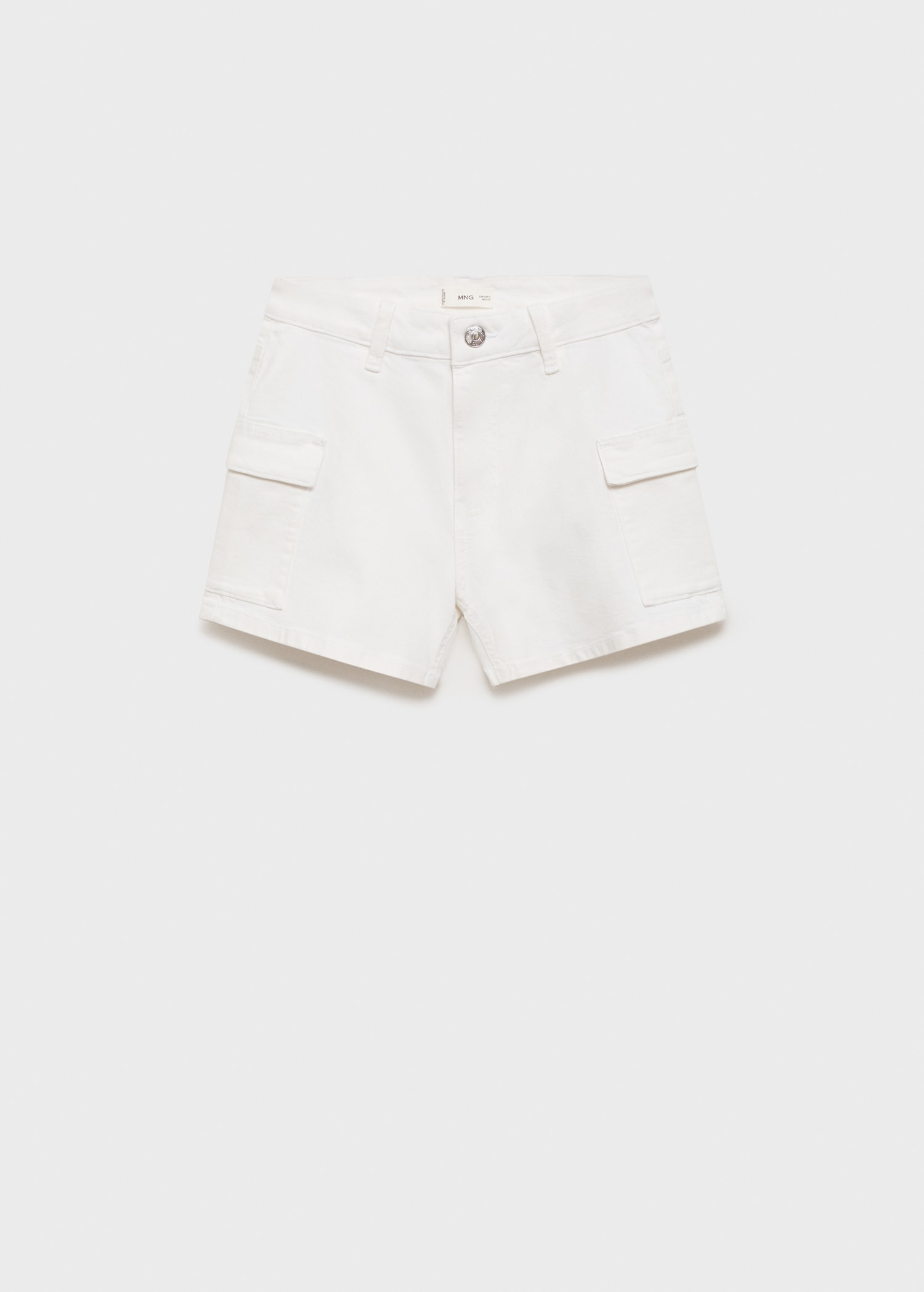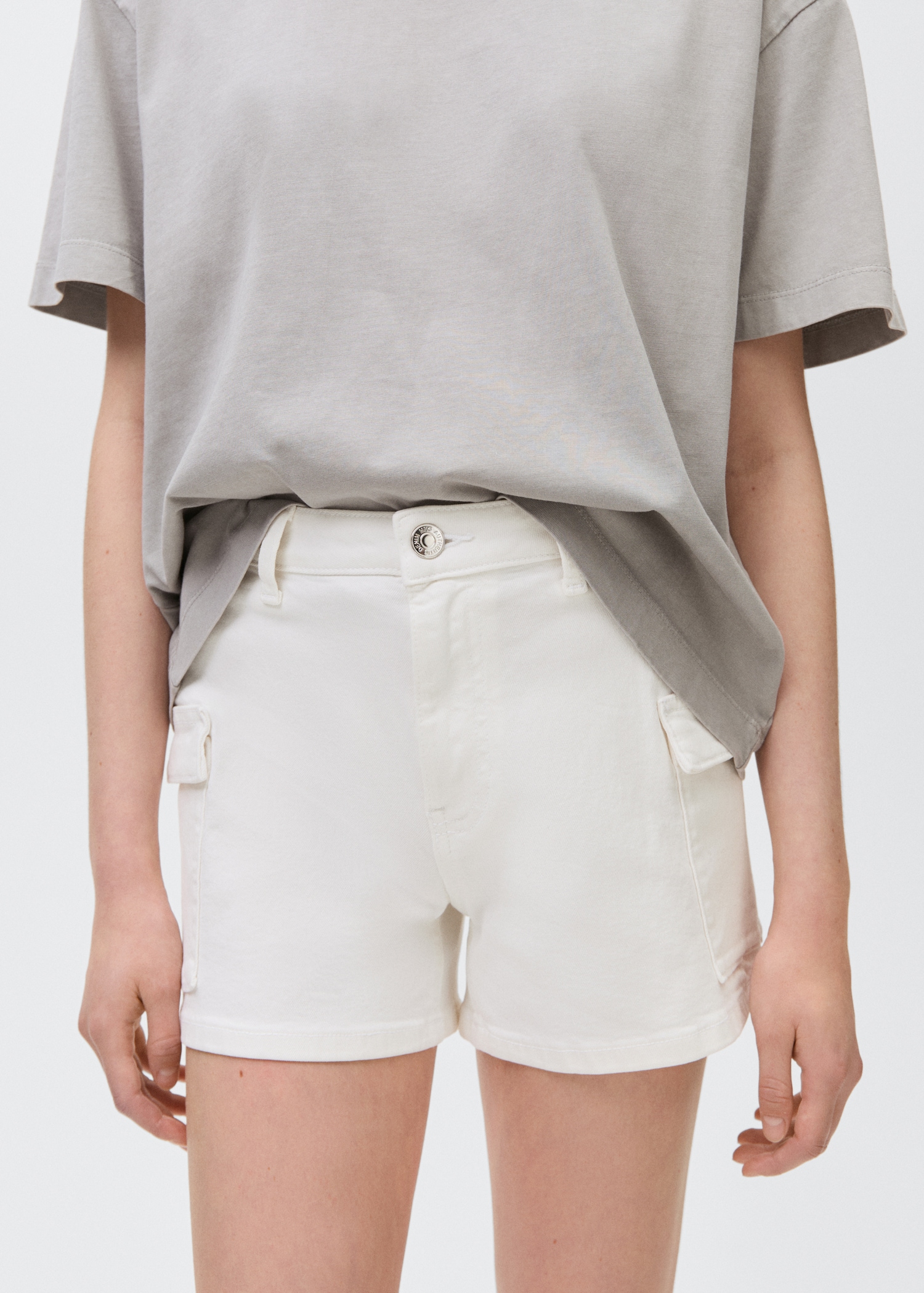 Cotton denim fabric. Straight Design. Short design. Metallic buttons. Cargo pockets. Two patch pockets at the back. Belt loops. Zip and button closure