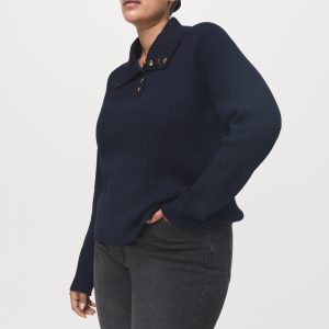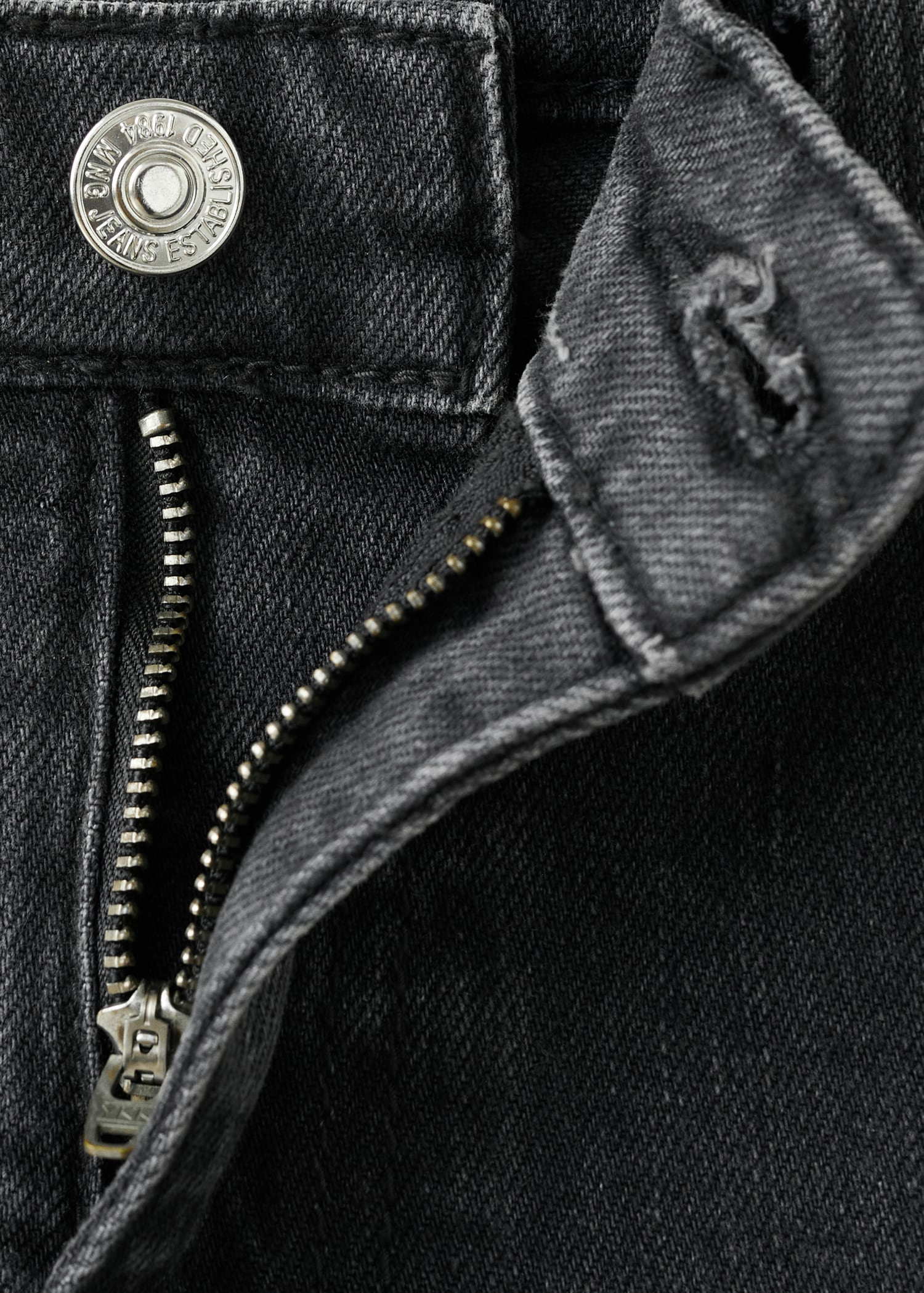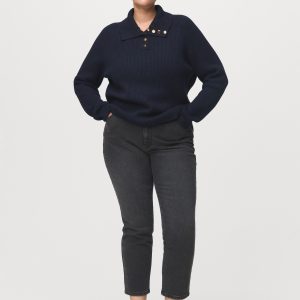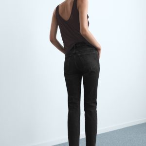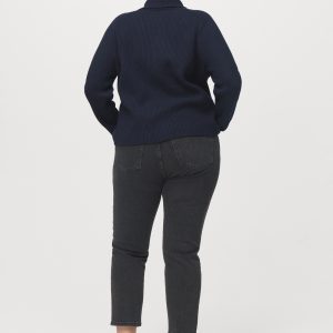Cotton denim fabric. Crop design. Slim Silhouette. High-rise. Belt loops. Five pockets. Button and zipper closure. Inside length 29.5 in. Available Plus. Comfort fabric with elasticity