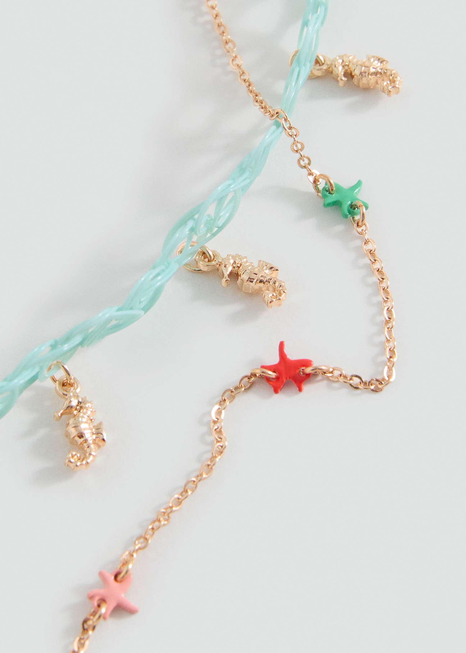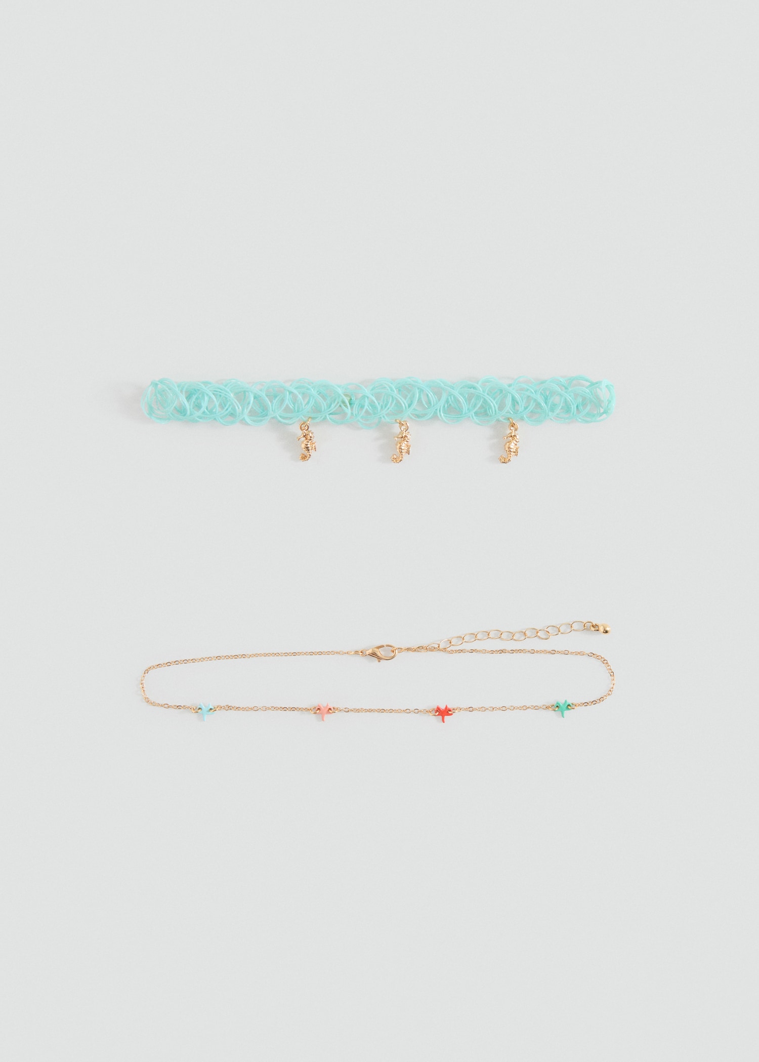 Pack of 2. Choker style. Seahorse pendant. No closure. Stars pendant. Metallic pendant. Multicolor design. Hook closure