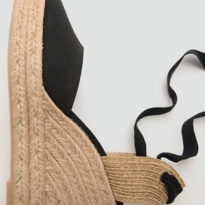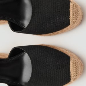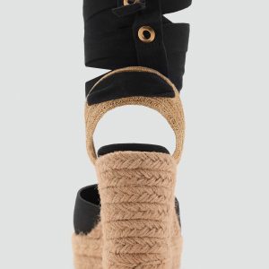 Slingback design. Combined design. Rounded toe. Wedge heel. Heel height is 10 cm. Ankle strap closure