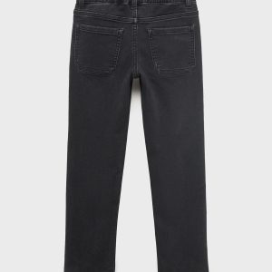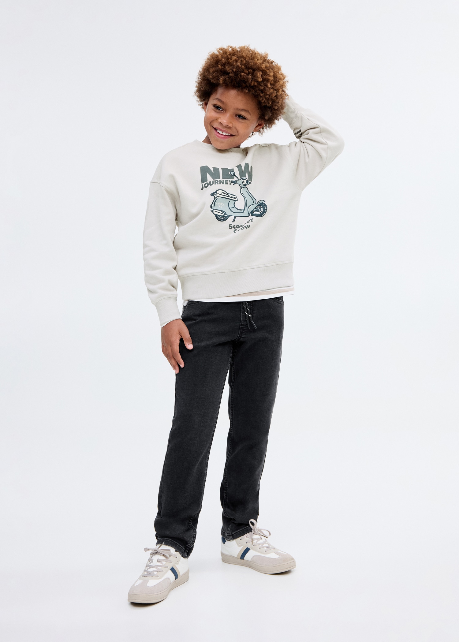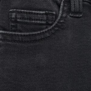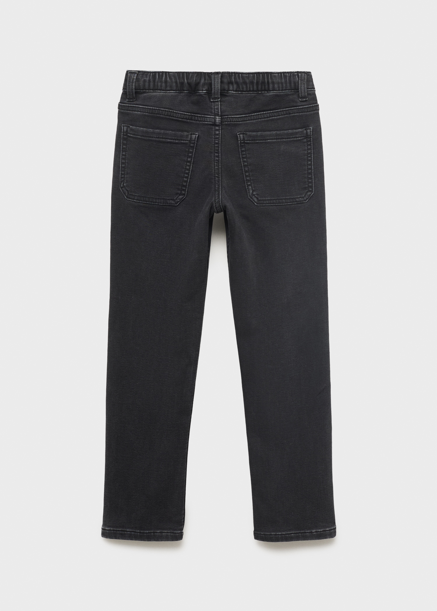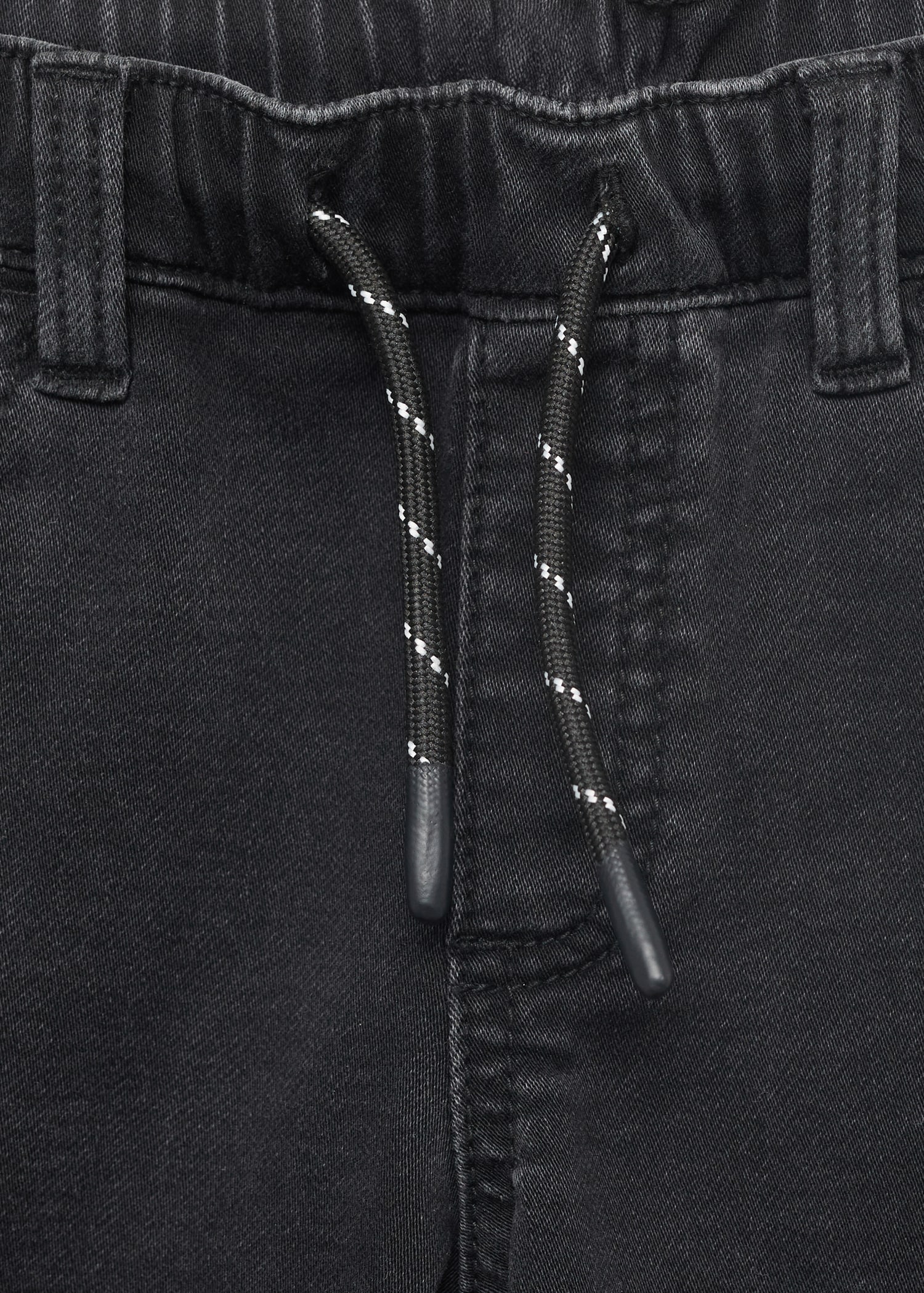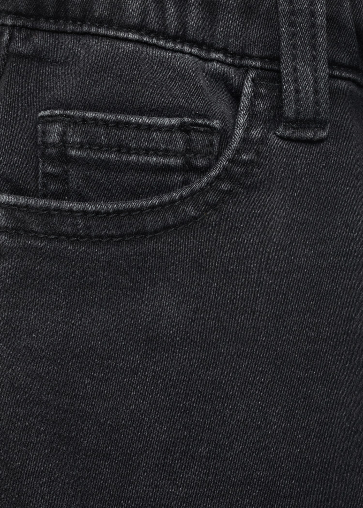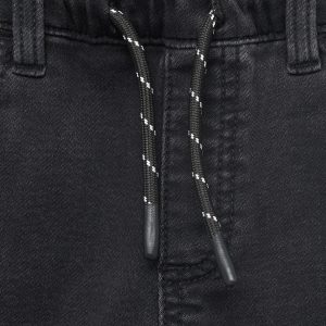 Denim fabric. Cotton fabric. Stretch fabric. Long design. Elastic waist with drawstring. Two side pockets. Two patch pockets at the back. Due to the washing process, the shade of the denim may show slight variations compared to the image displayed