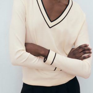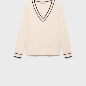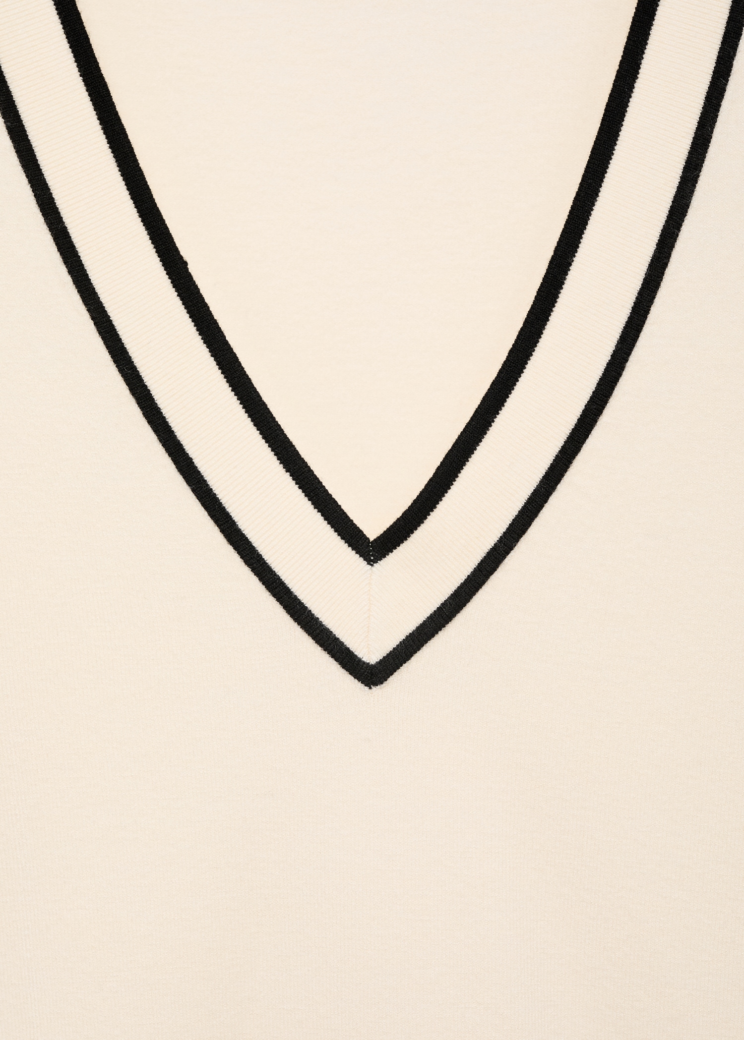 Crafted from fine knit-fabric, this straight design features a V-neck and long sleeves. The contrasting details give it a distinctive air. Available in Plus Size