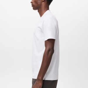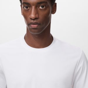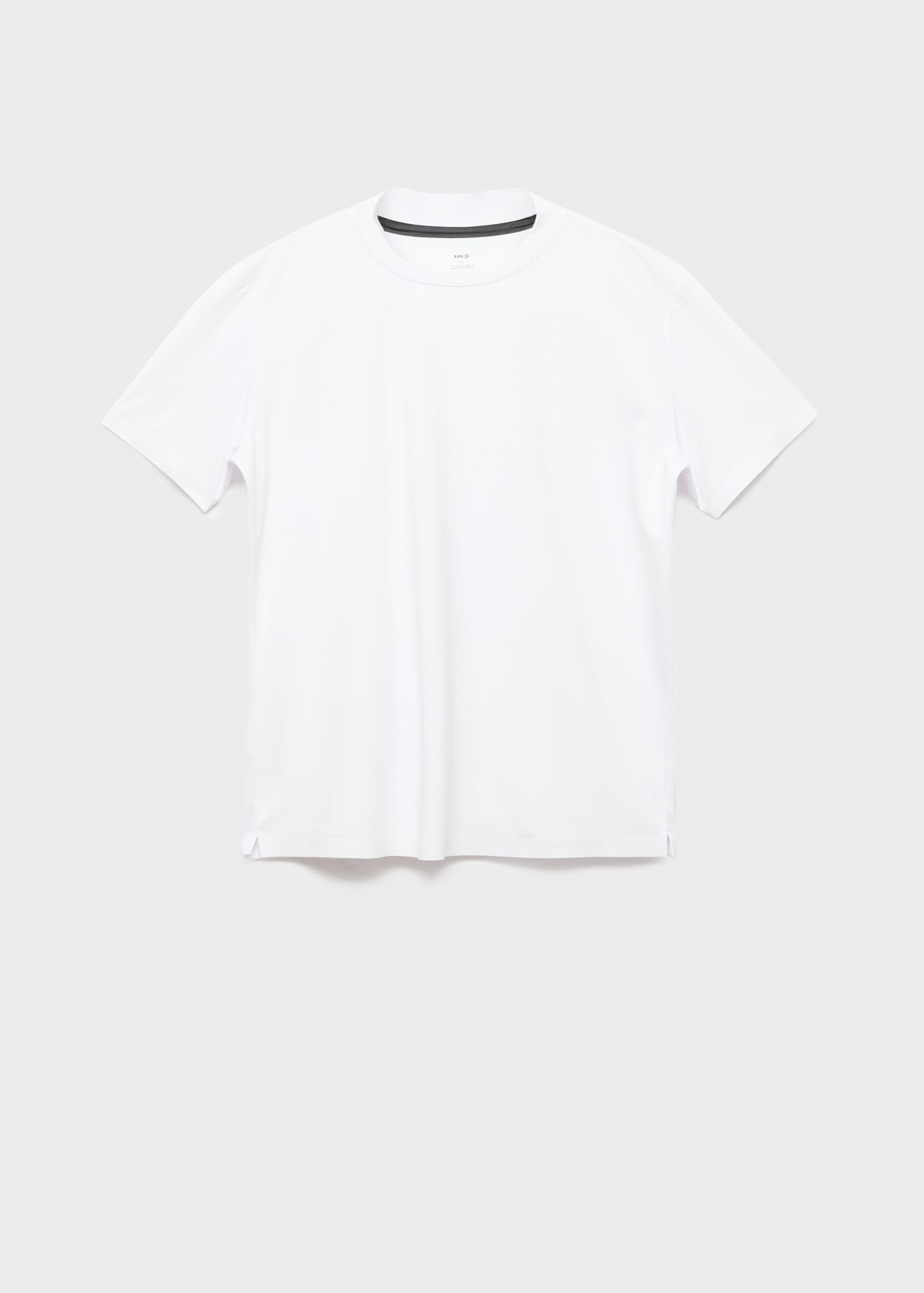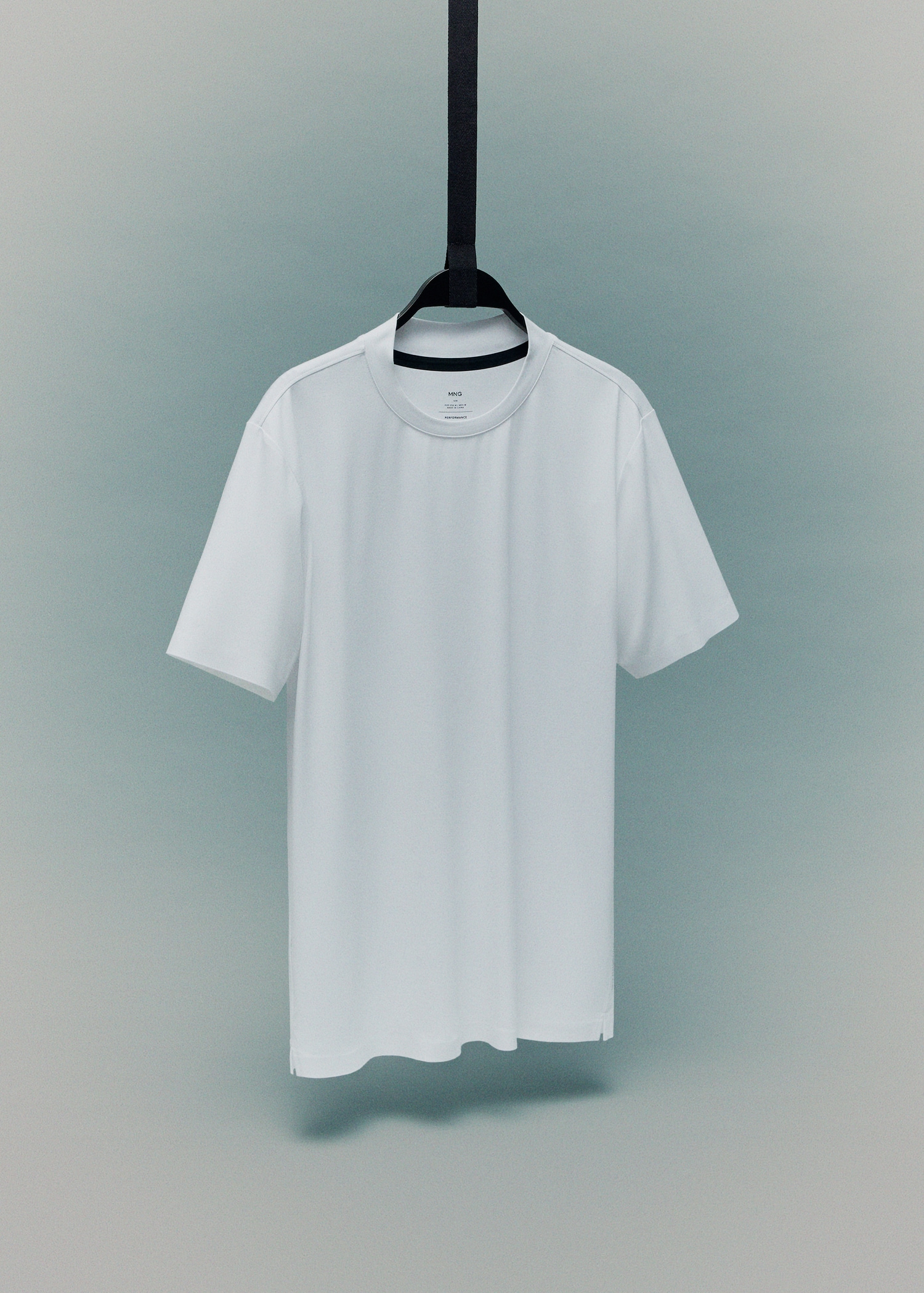 Slim fit. Viscose-blend fabric. Wrinkle free: wrinkle-resistant fabric. Thermoregulator fabric. Comfort Stretch: Stretch fabric that provides extra comfort. Coolmax® is a special fabric that helps wick moisture away from the skin, keeping the body dry and warm in cold climates, and is lightweight and fresh in warm climates. Crew neck. Thermo-sealed short sleeves. Double back vent at the hem