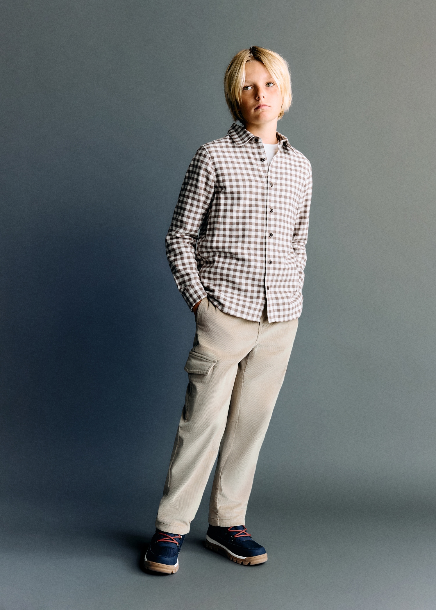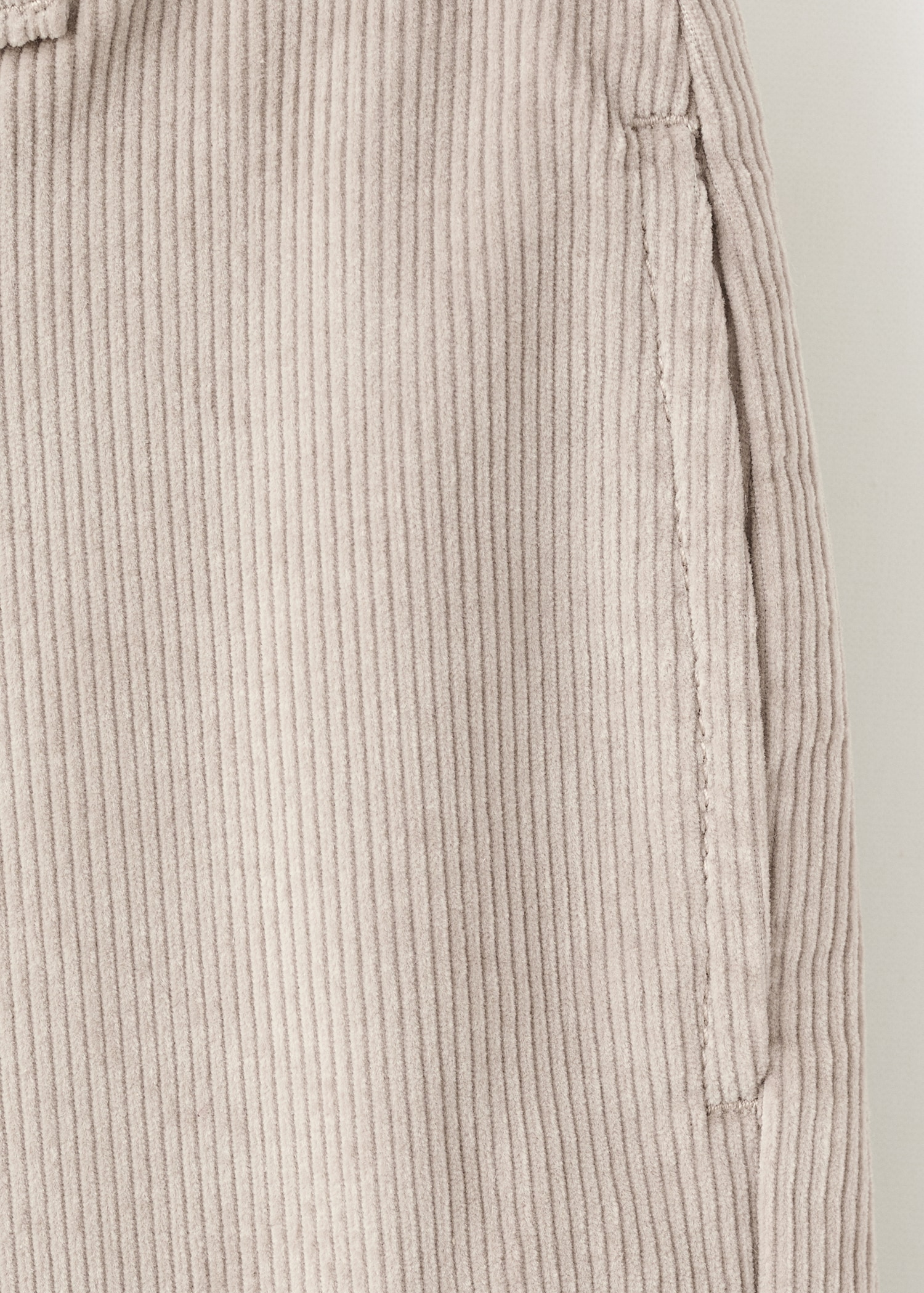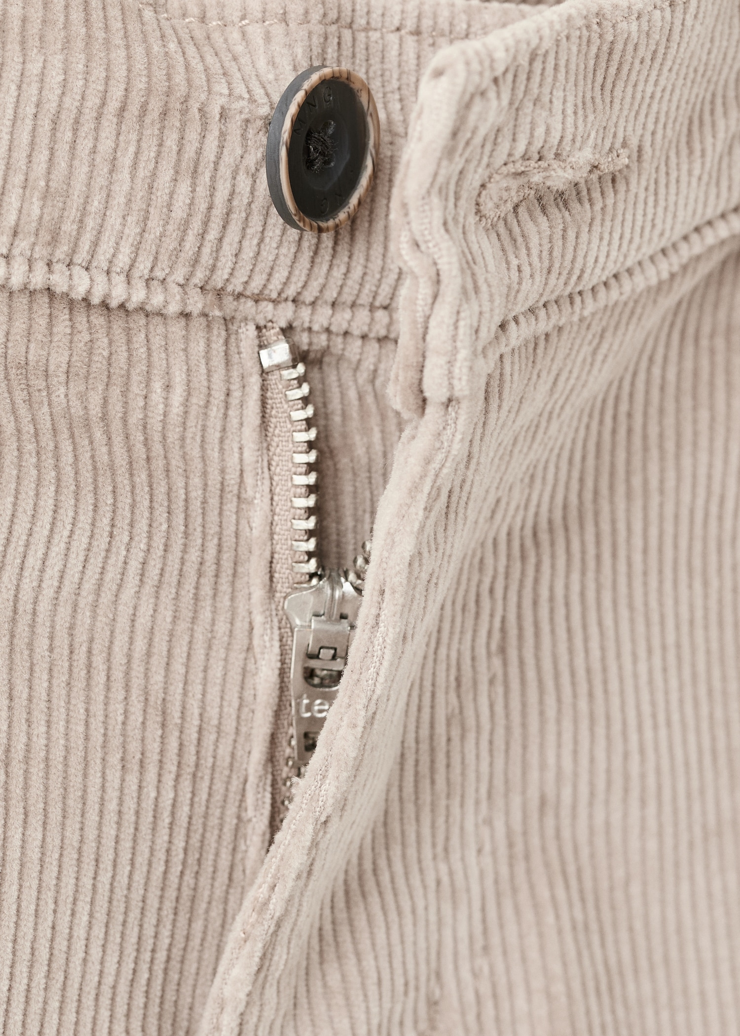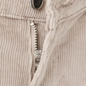 Fabric with cotton. Corduroy fabric. Straight Design. Long design. Two side pockets with flaps. Zip and button closure