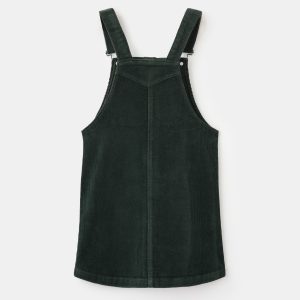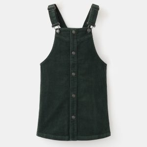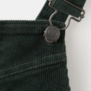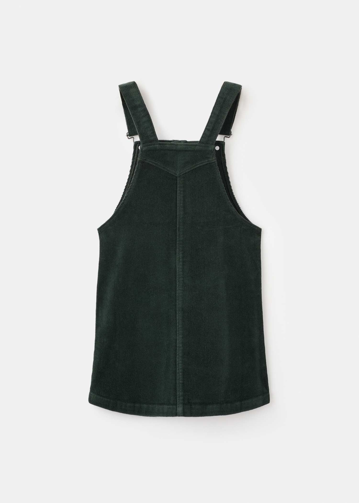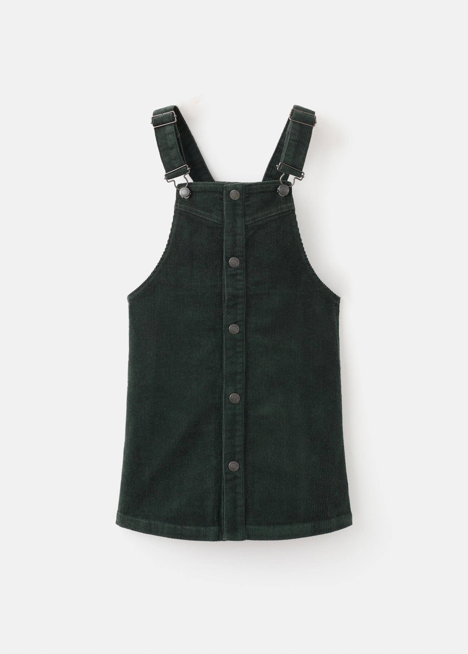Corduroy fabric. Stretch fabric. A-line design. Straight neckline. Straps with button closure. Adjustable straps. Front button closure
