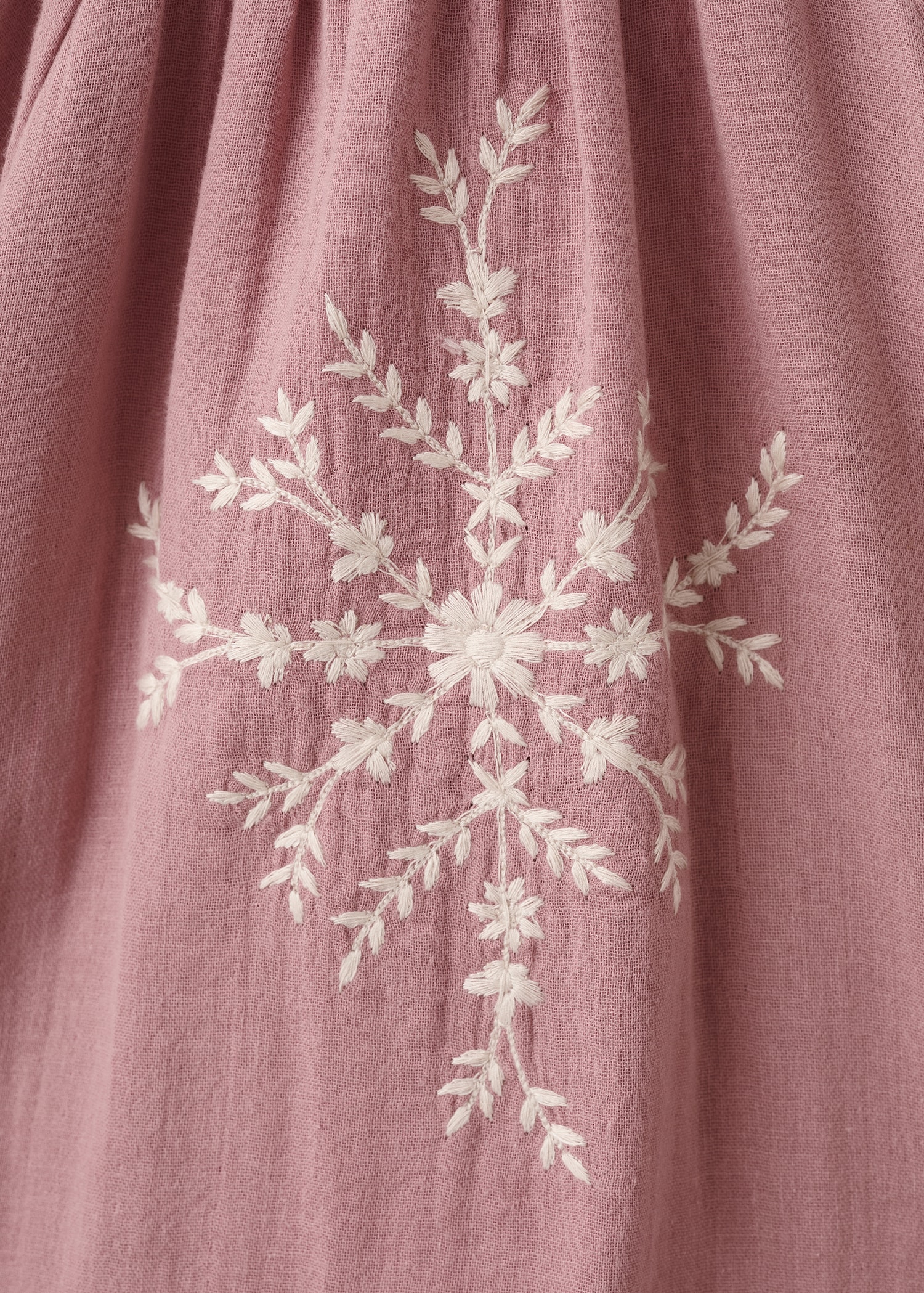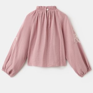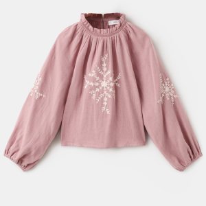 Crafted from 100% cotton fabric, this blouse features an A-line design with floral embroidery. The gathered round neckline and long puff sleeves with elasticated cuffs add elegance. Button closure at the back.