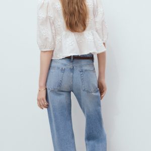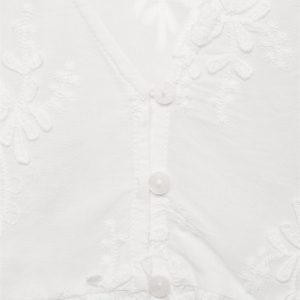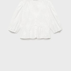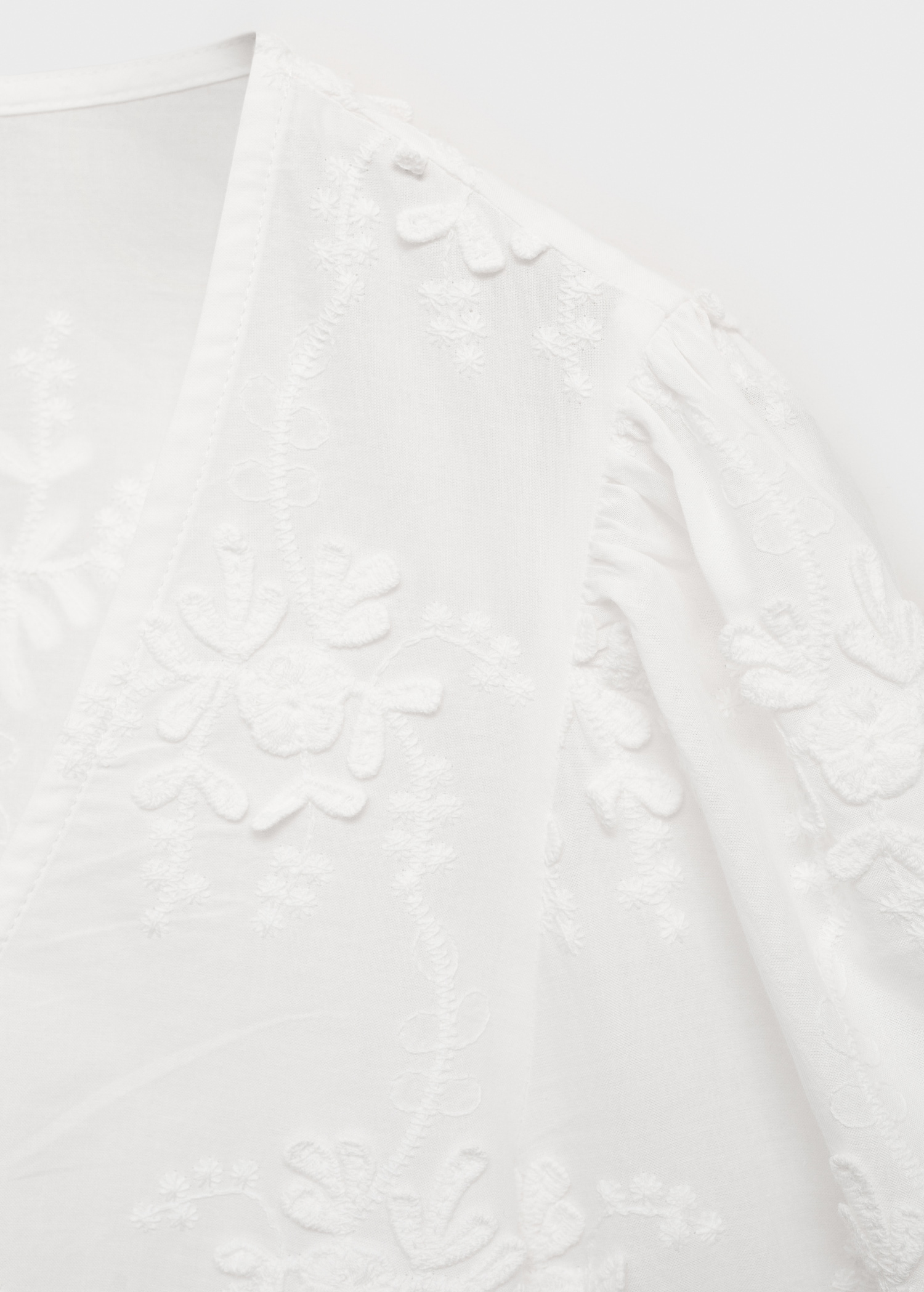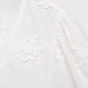 Crafted from 100% cotton fabric, this garment features a straight design with floral embroidery. The V-neck and three-quarter puff sleeves add style, while the front button closure ensures comfort.
