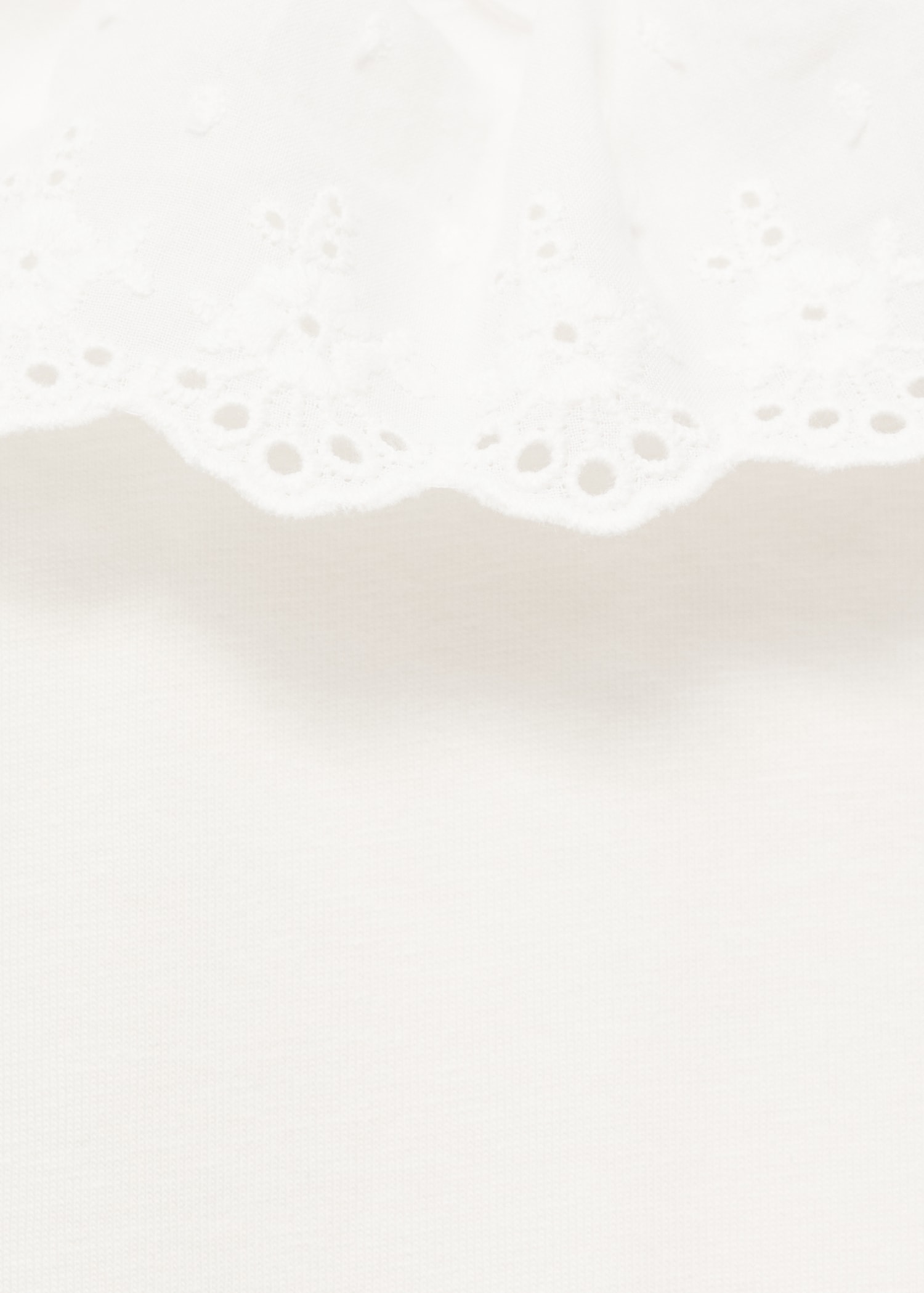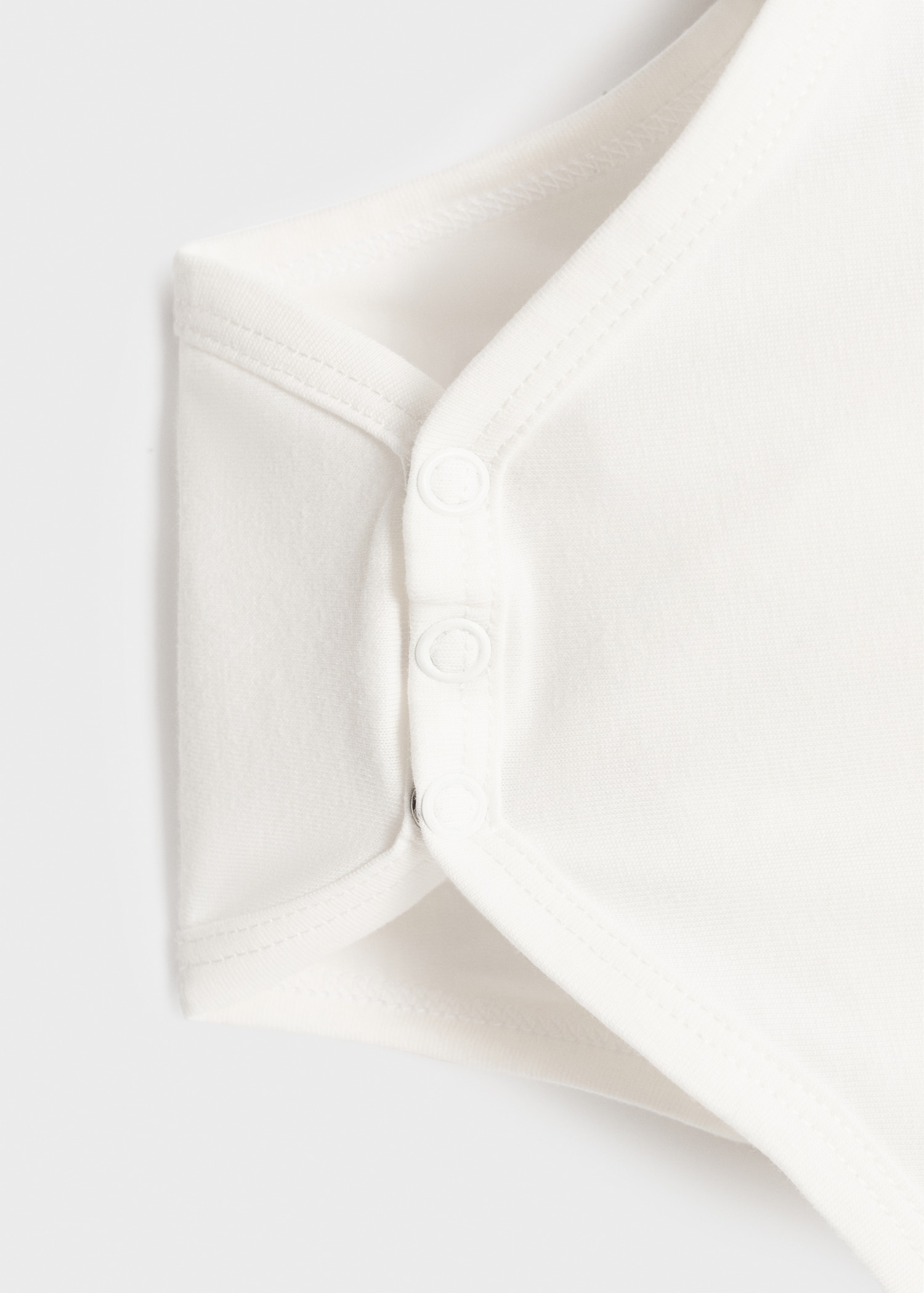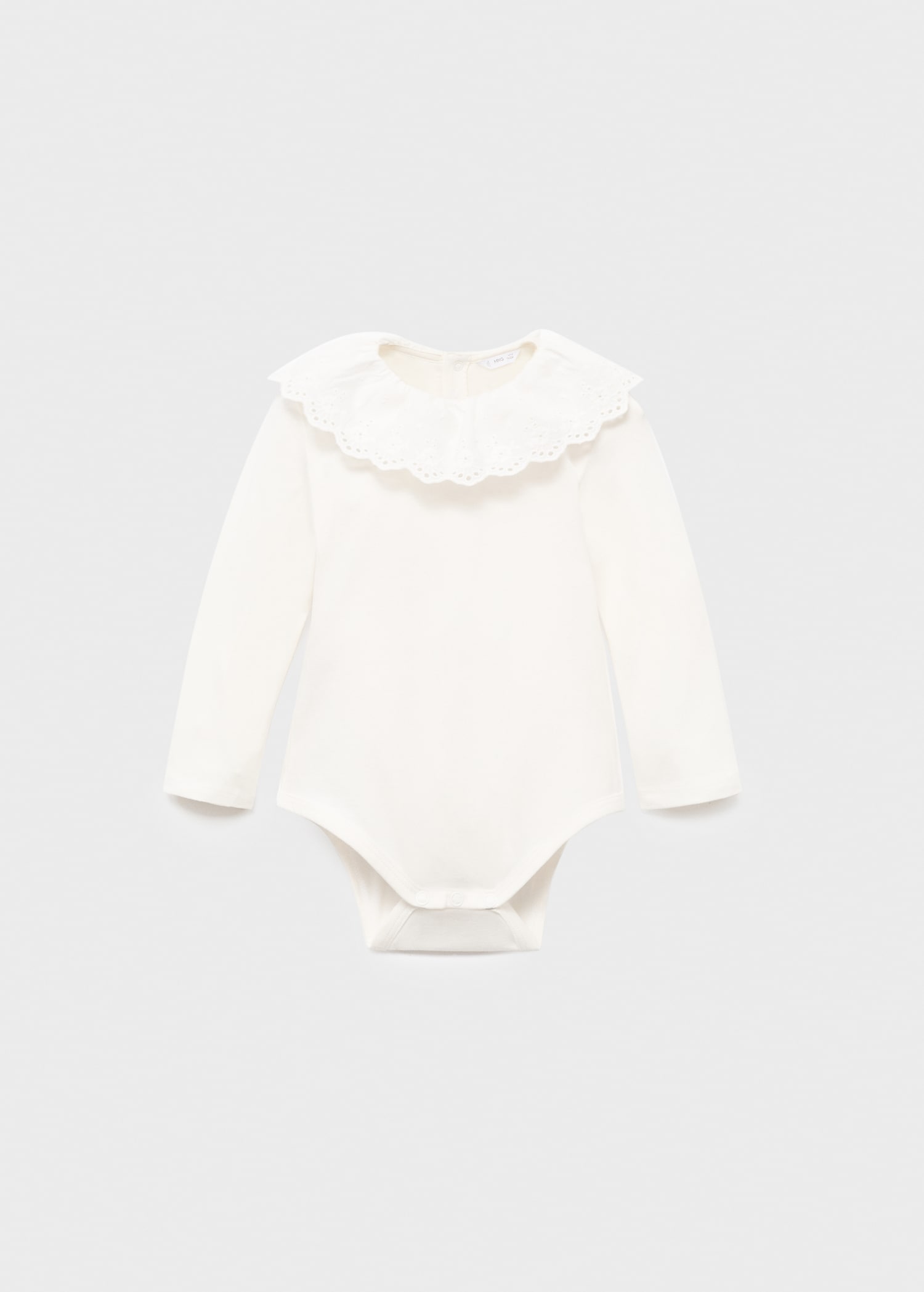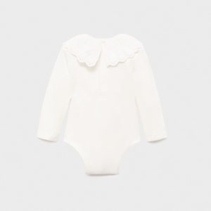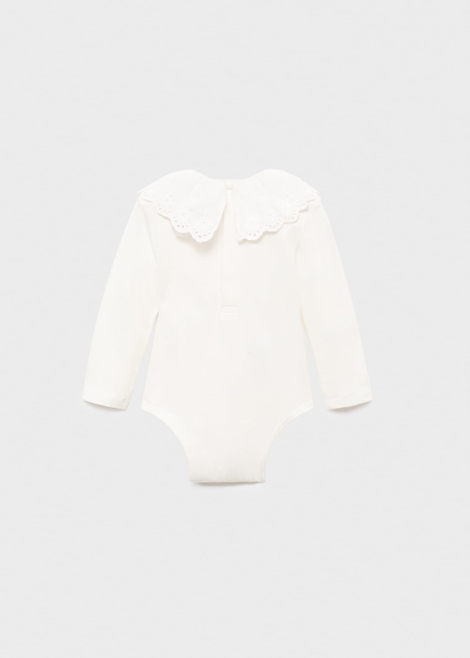 Crafted from stretch cotton fabric, this bodysuit features a straight design with a babydoll collar embellished with embroidery. It includes long sleeves and press-stud closures at the back and bottom.