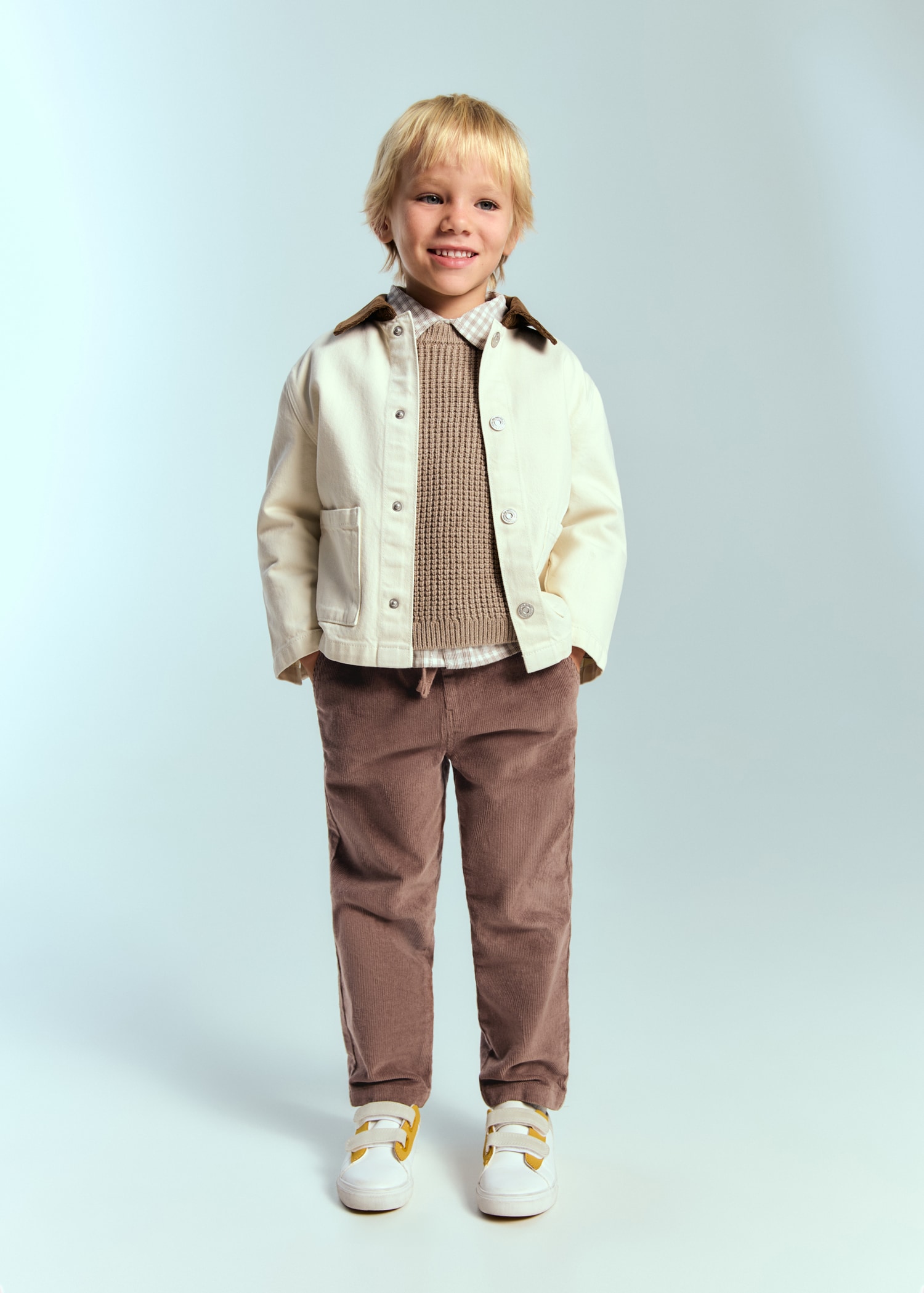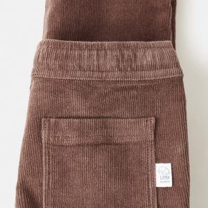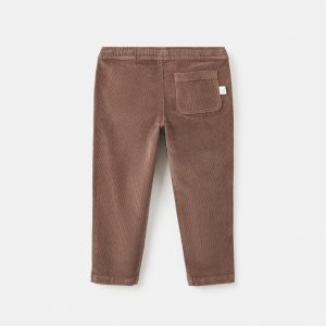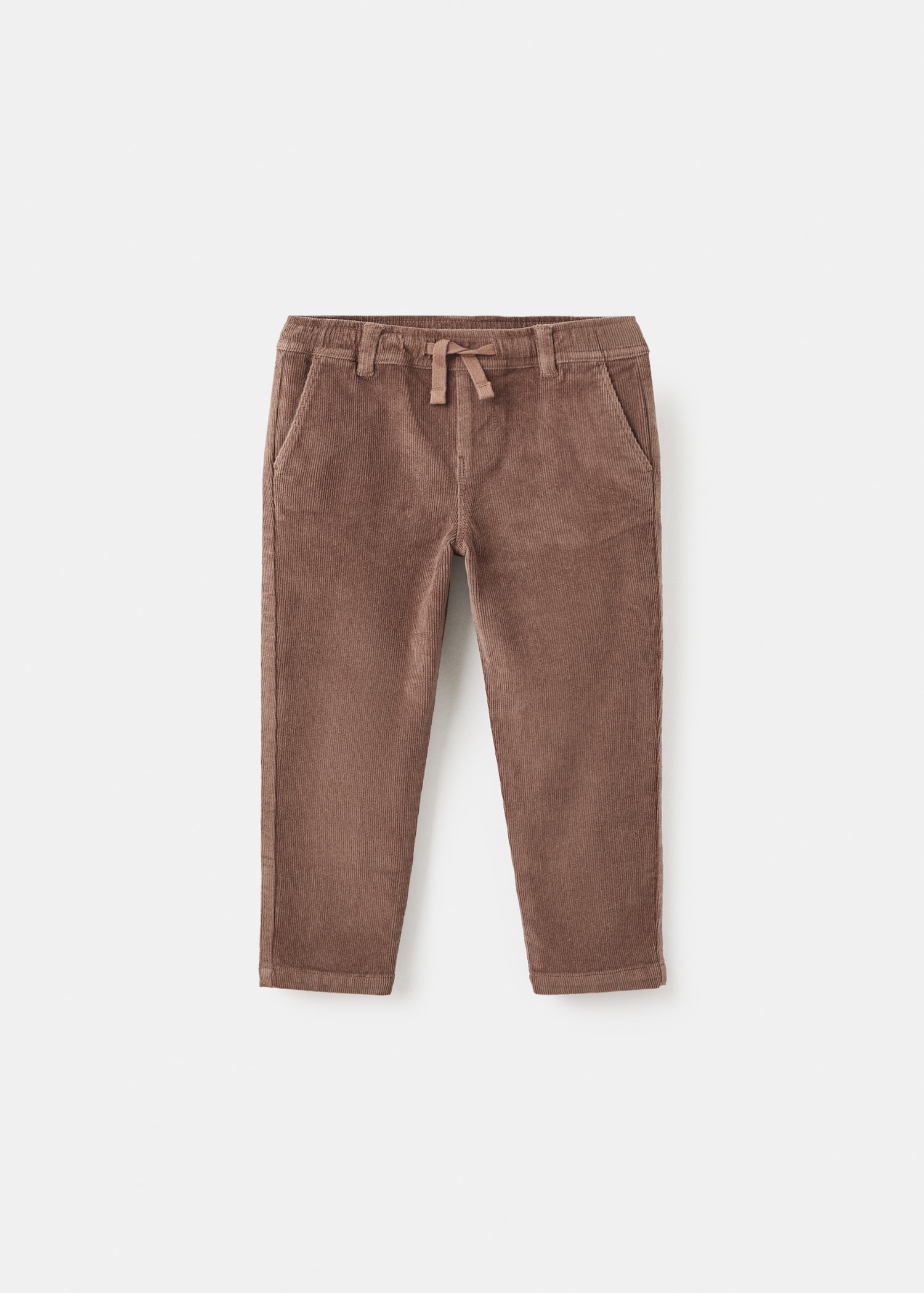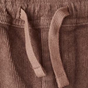 Cotton fabric. Corduroy fabric. Straight Design. Long design. Elastic waist. Belt loops. Elastic waist with drawstring. Two side pockets. One patch pocket on the back