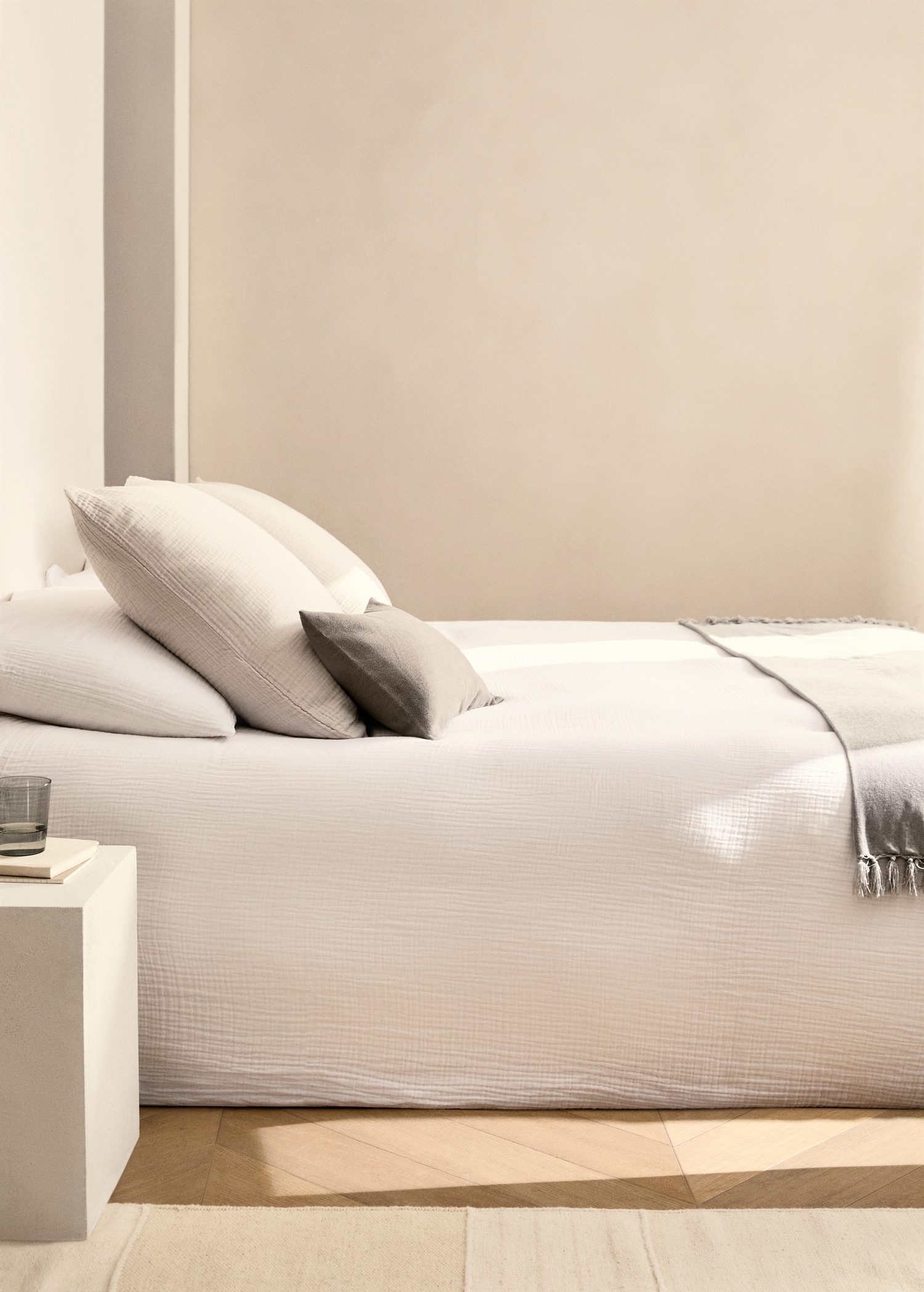 Bed 180/200cm. Size: 102.36×94.49in. 100% Cotton. Three-layer muslin. Soft texture. Chiffon fabric. Wrinkled and natural finishing. Quick-dry fabric. Adds a cozy and warm touch. Coordinates with more items from the collection. Mediterranean style. Match it with the pillowcases and cushion covers of the same collection to have a bedroom in perfect harmony. Button closure. Does not include insert. Available in various colors. Online Exclusive. 180/200cm bed