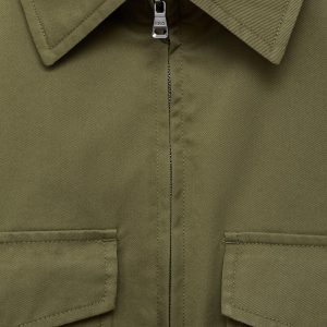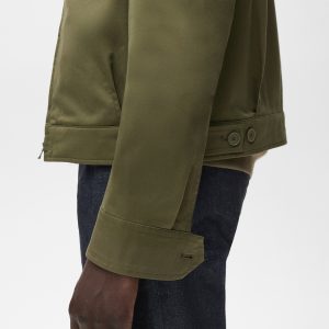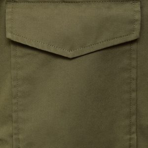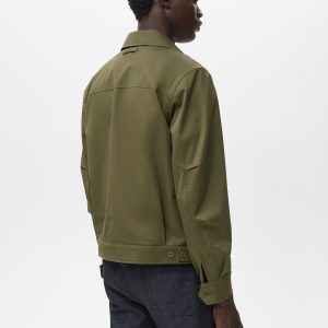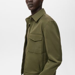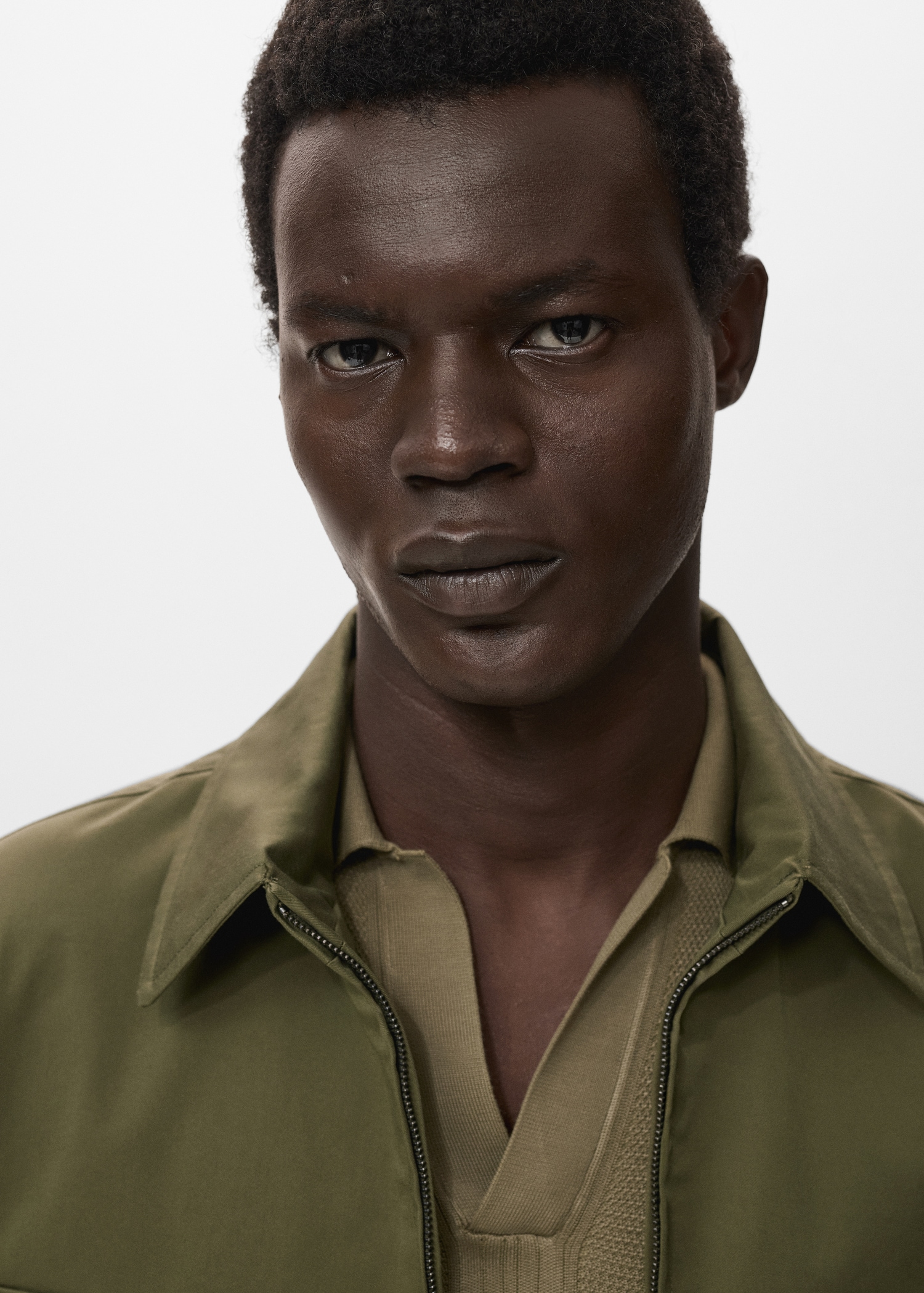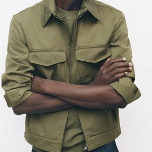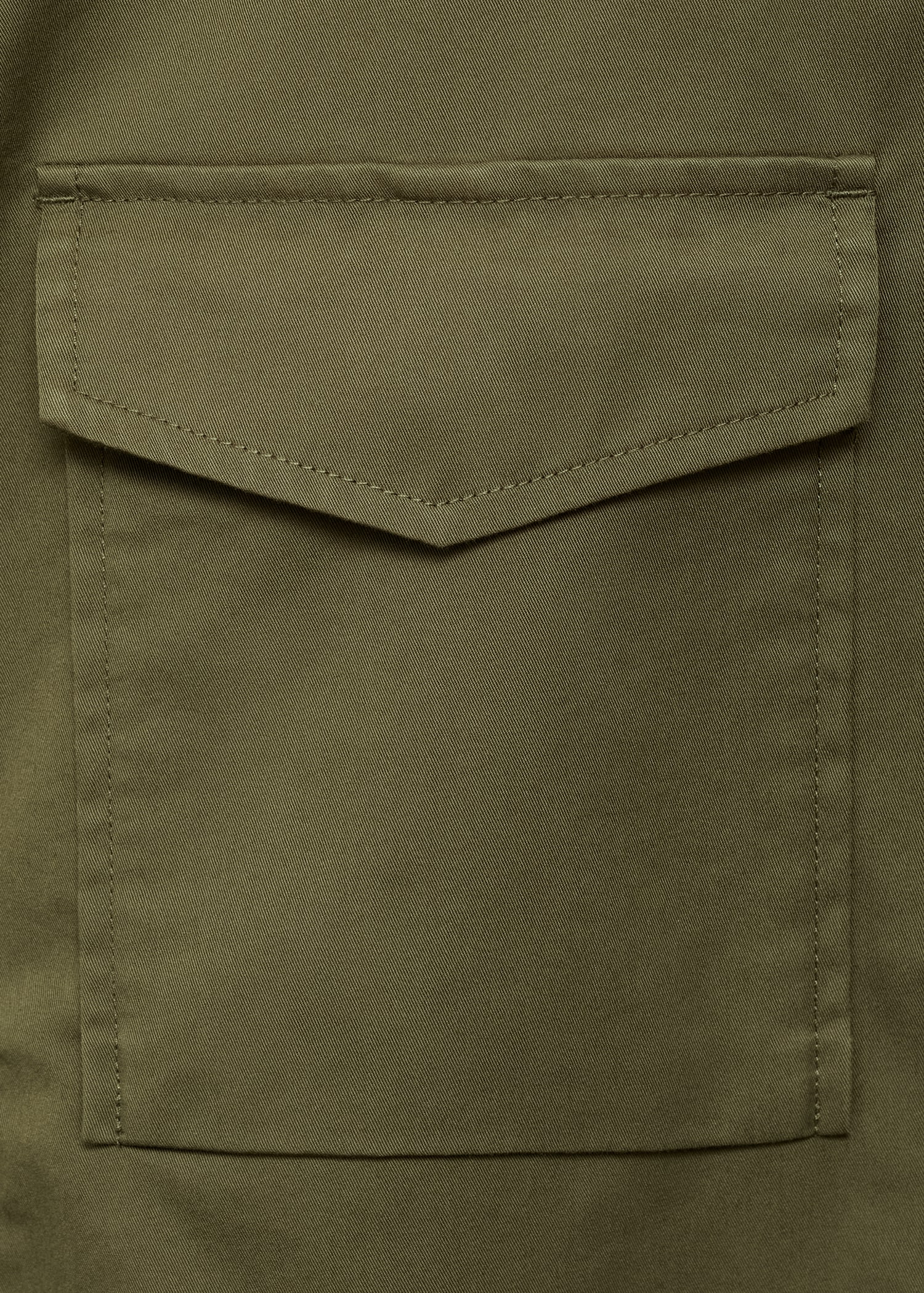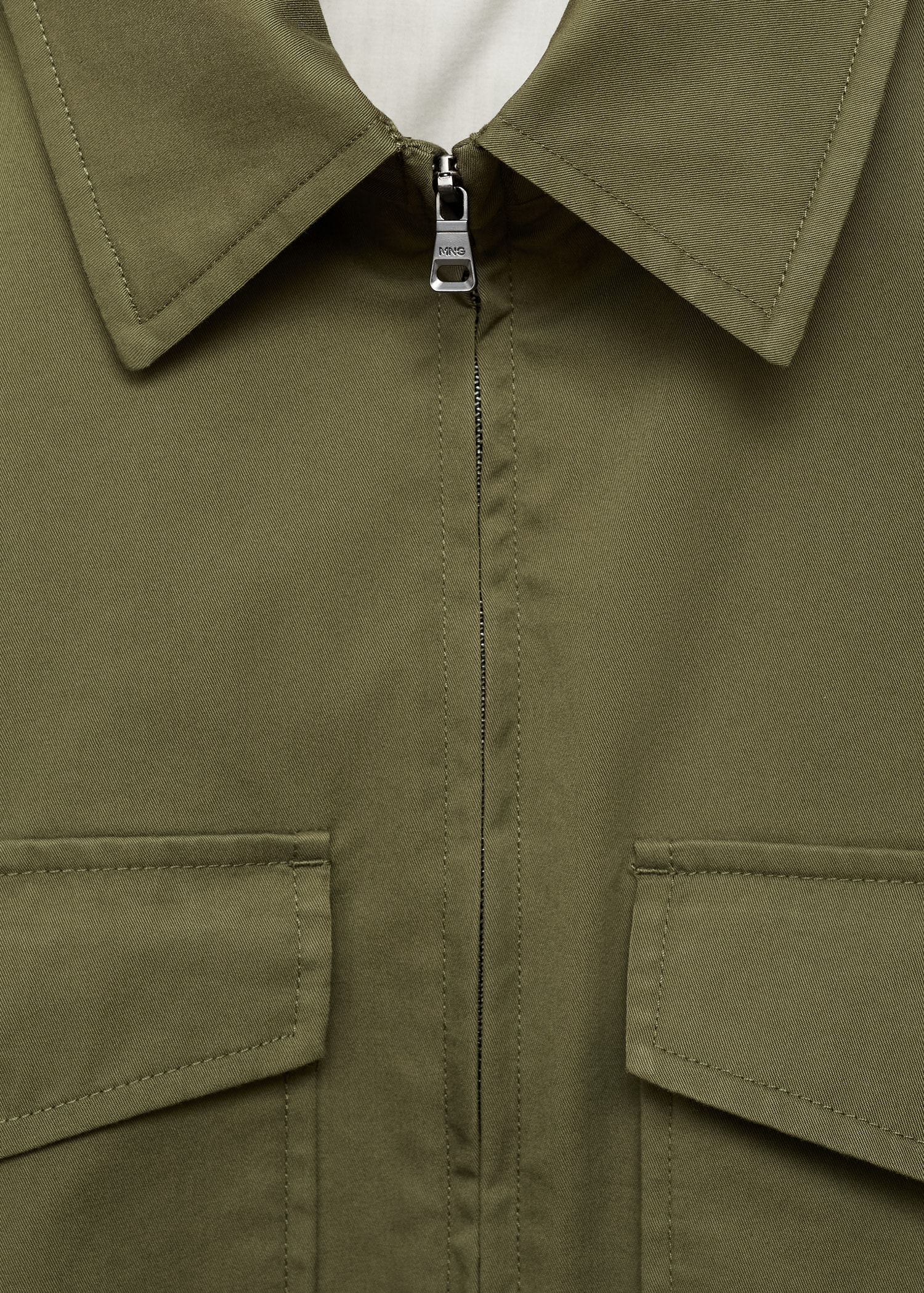 Cotton blend fabric. Straight silhouette. Shirt collar. Two chest pockets with flaps. Two inside patch pockets. Front zipper closure. Straight hem. Inner lining. Long sleeves with buttoned cuffs