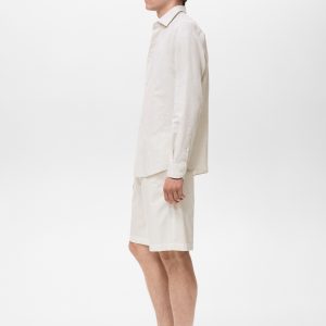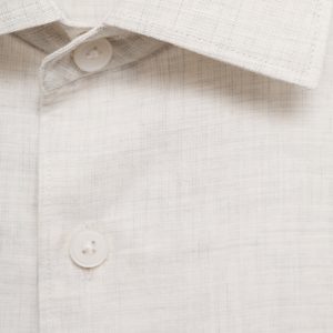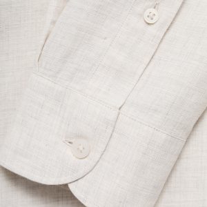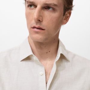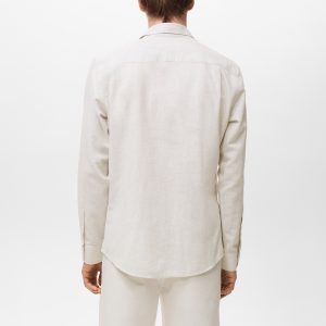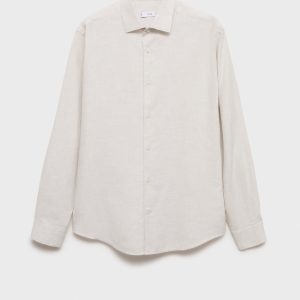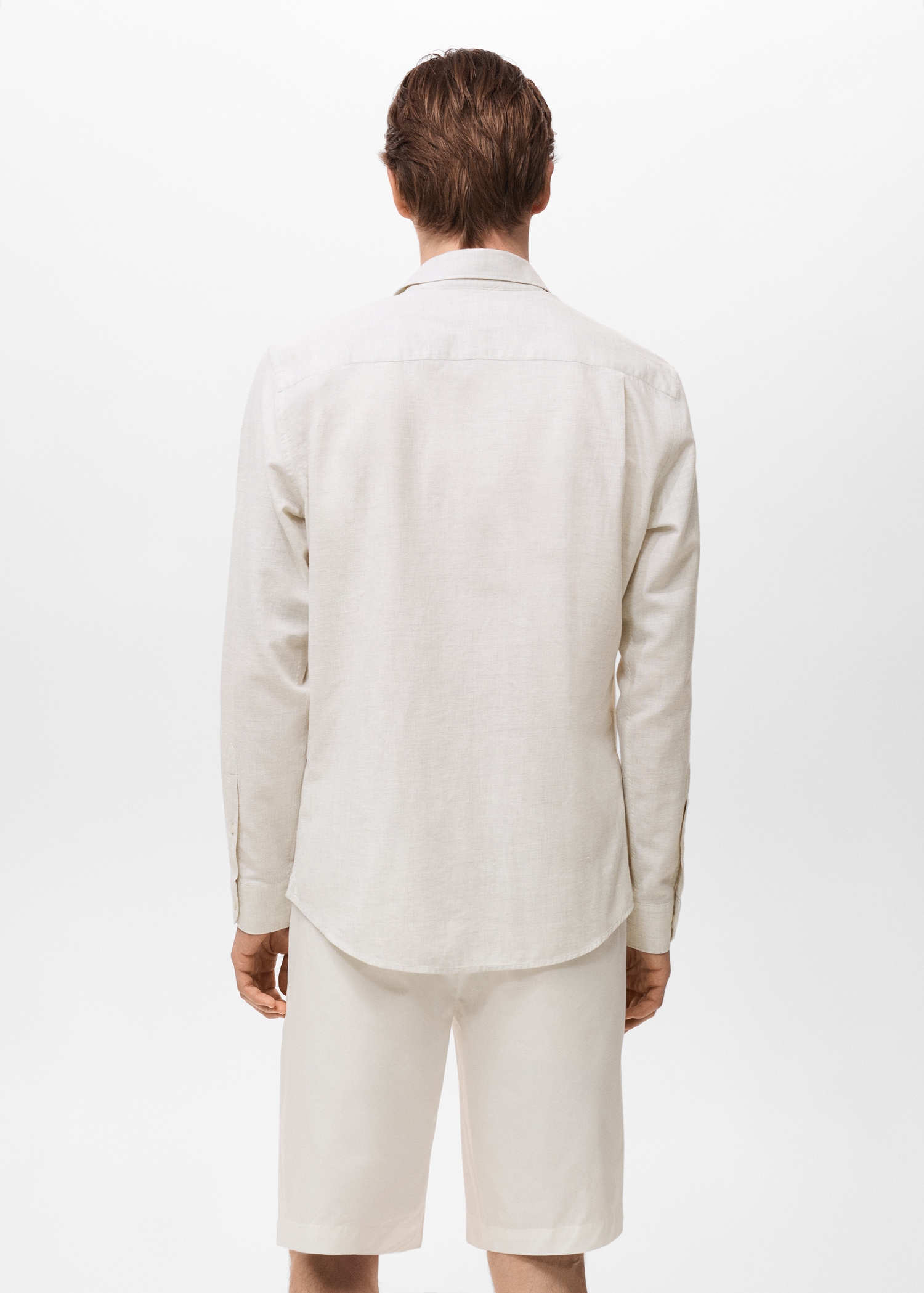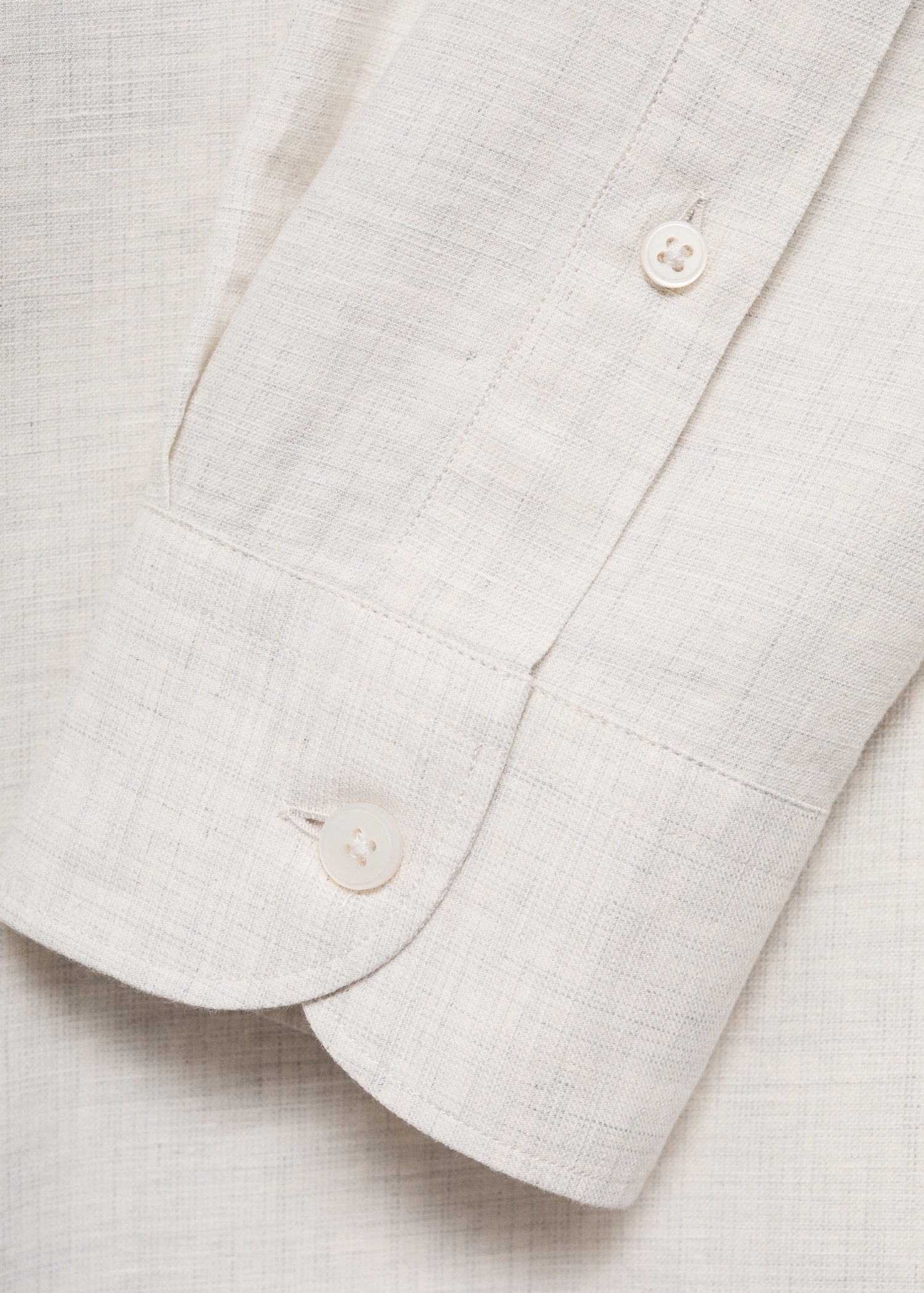 Regular Silhouette. Cotton and linen fabric. Shirt collar. Front button closure. Long sleeves with buttoned cuffs. Back dart detail. Rounded hem