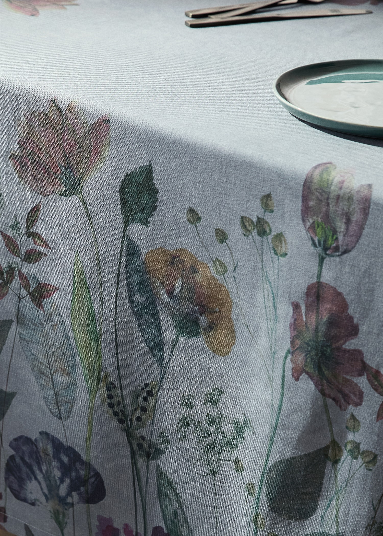 Cotton and linen fabric. Size: 150x250cm. Seats 4 to 6 people. Floral print. Made in Spain. Adds a colorful and original touch to your table on any occasion. Available in various colors. Available in different sizes