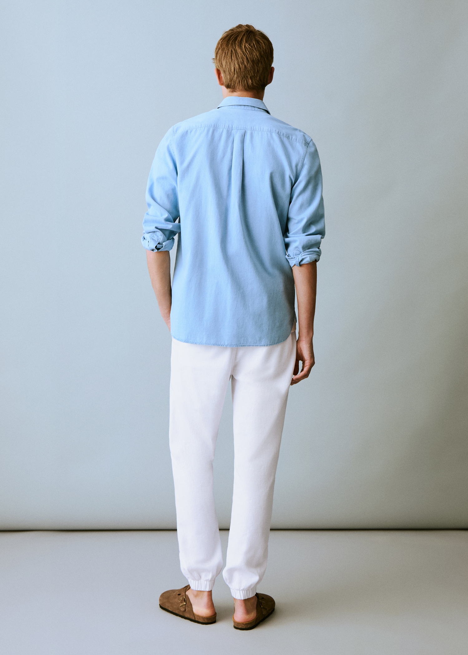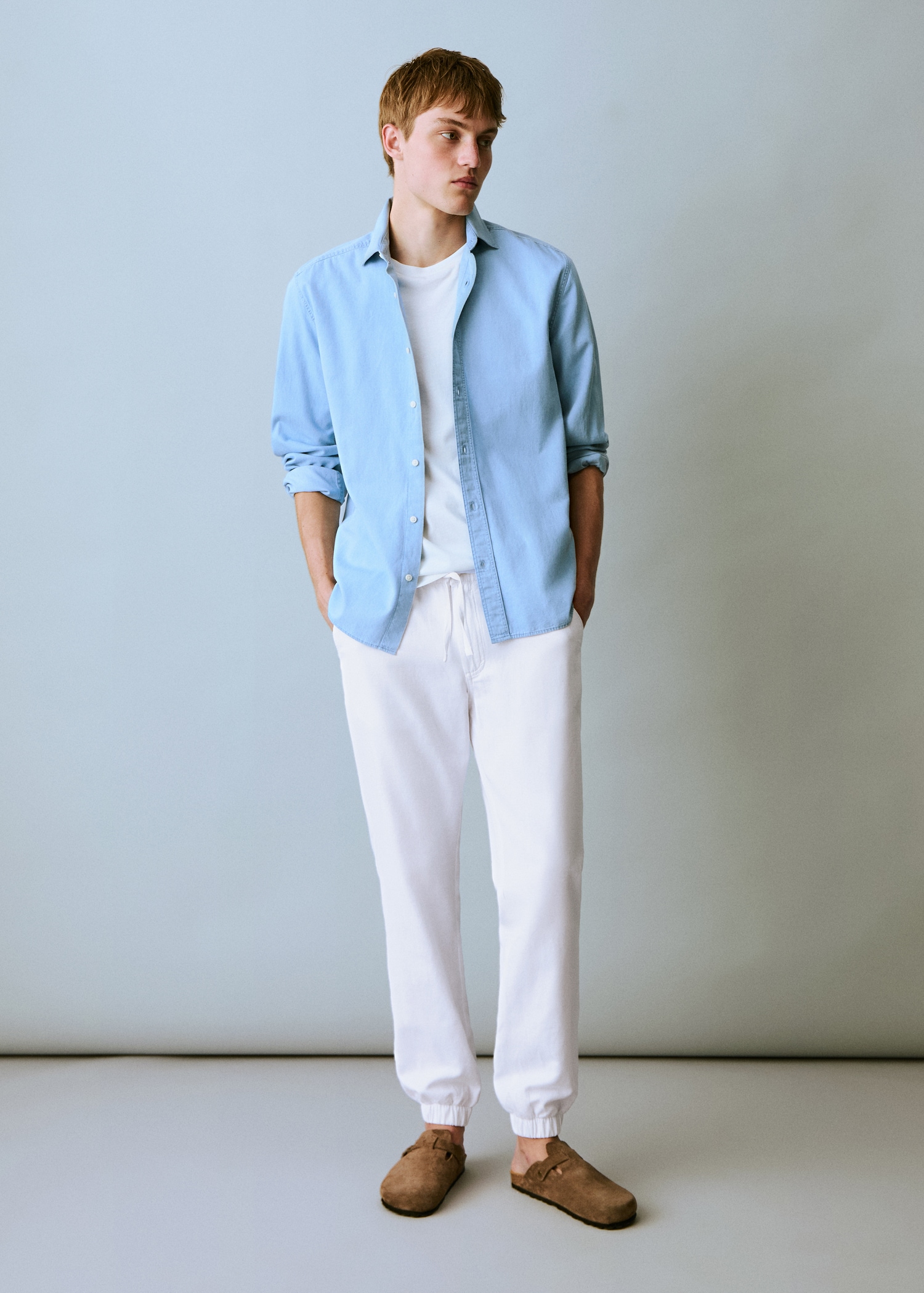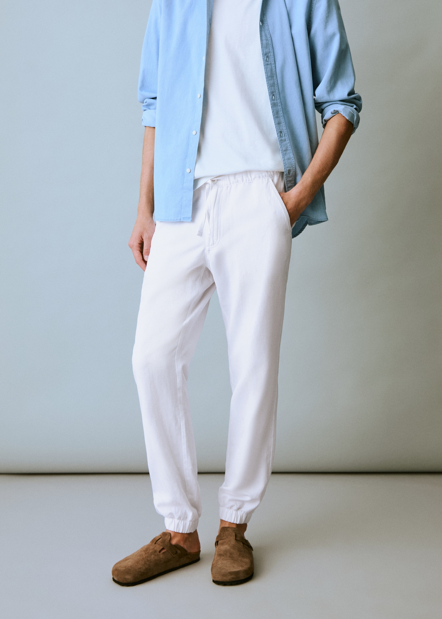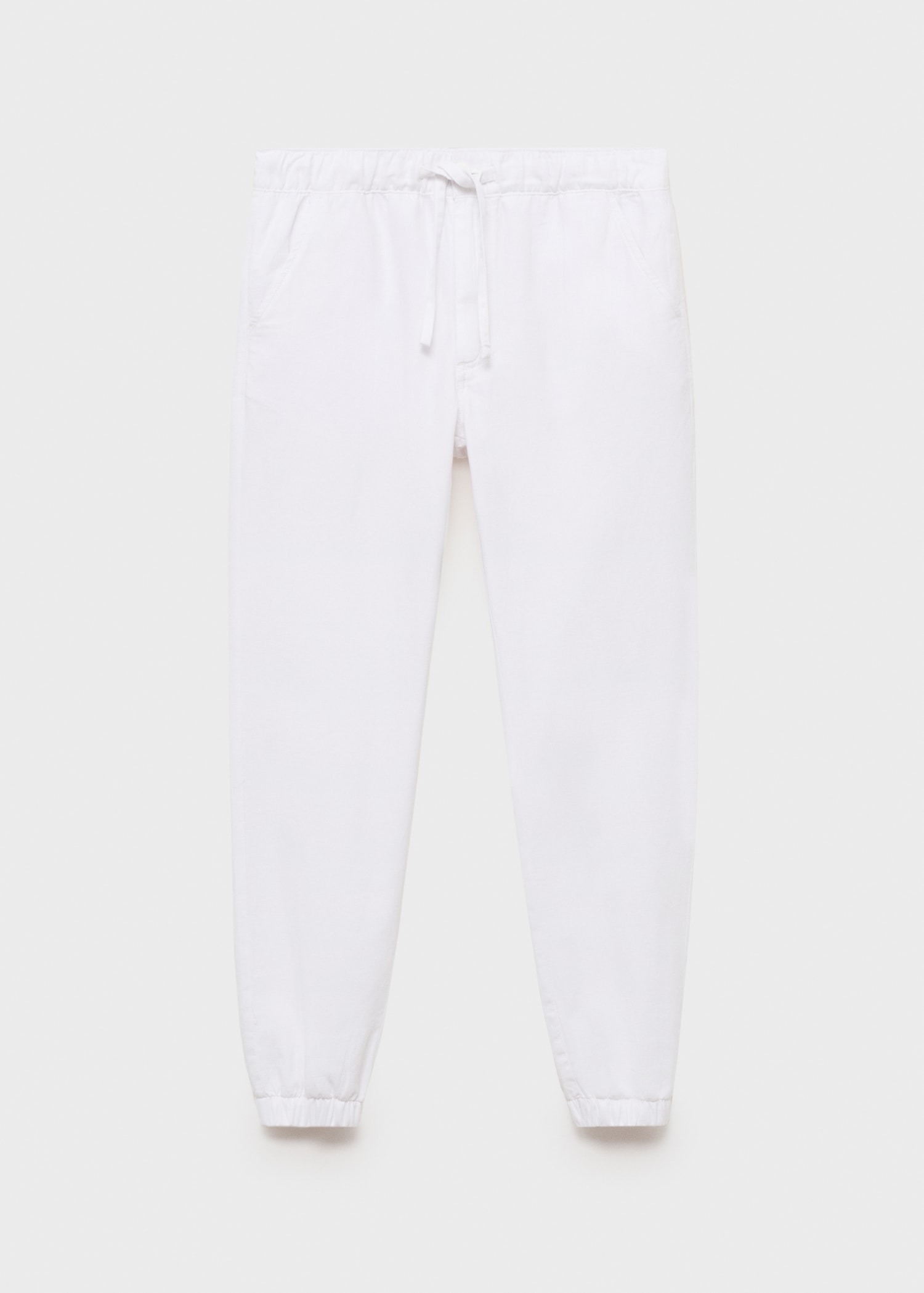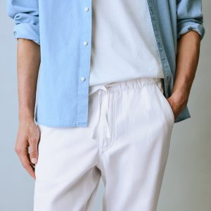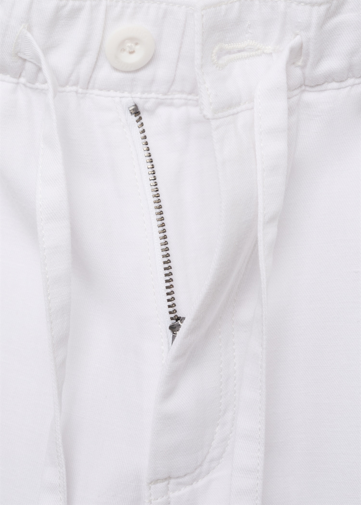 Cotton and linen fabric. Straight Design. Long design. Elastic waistband. Drawstring on the waist. Zip and button closure