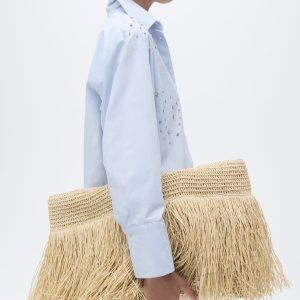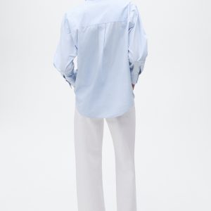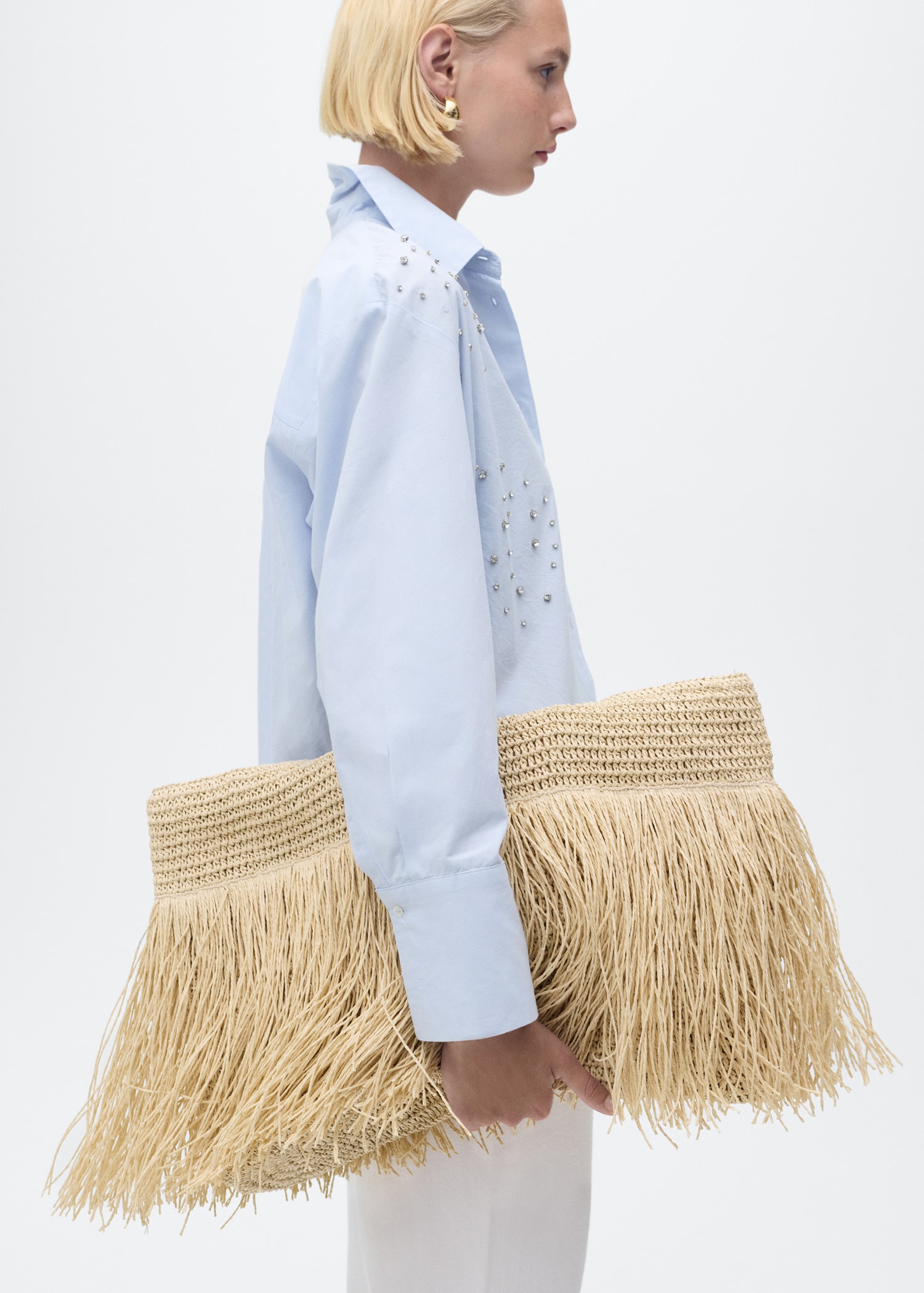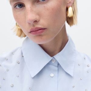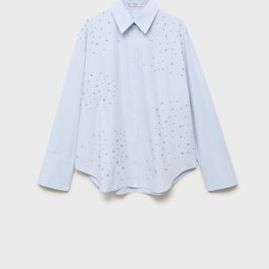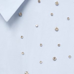 Crafted from 100% cotton fabric with rhinestone details, this garment features a straight design with a shirt collar and long sleeves