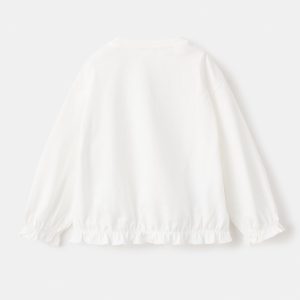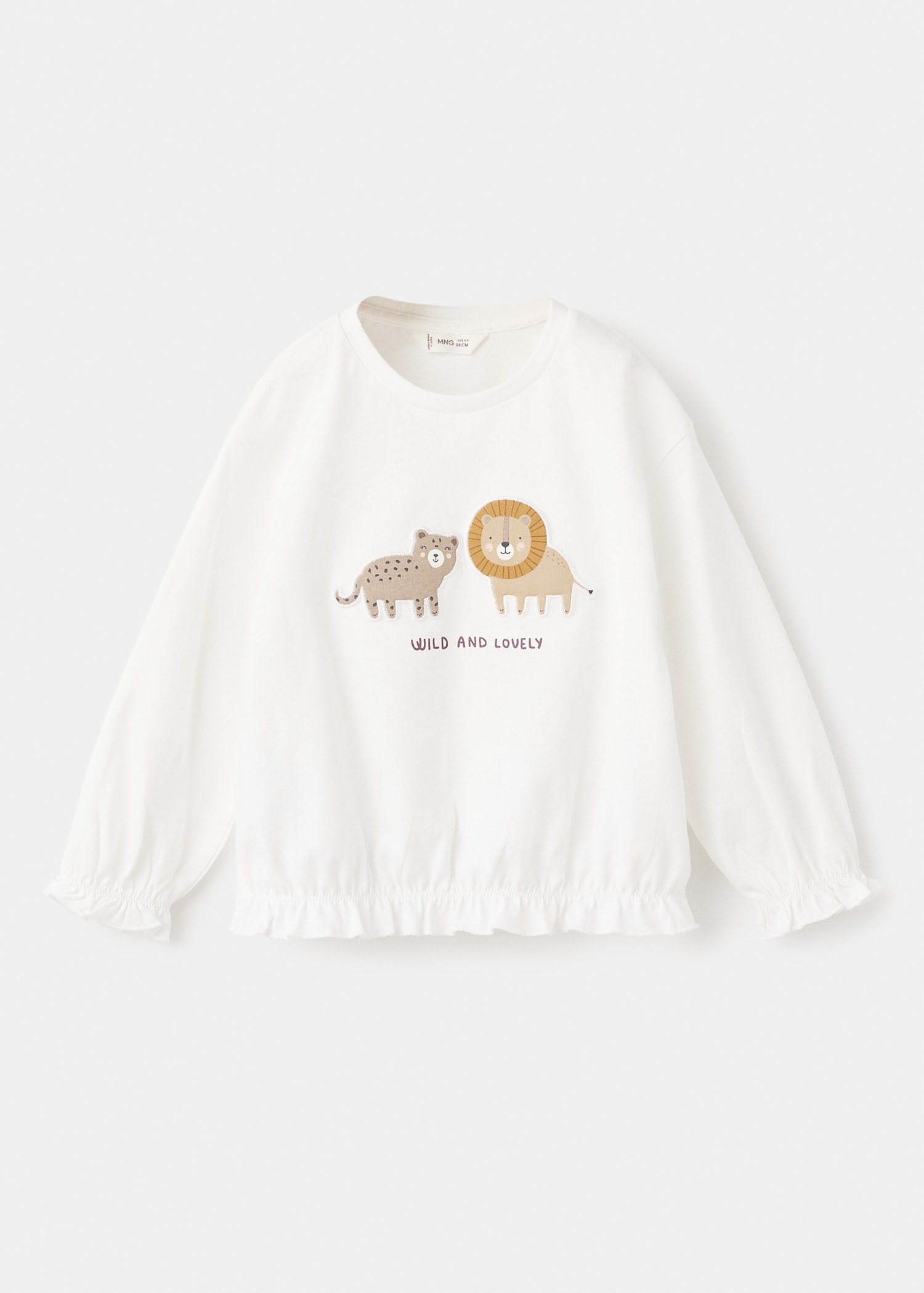 Crafted from 100% cotton fabric, this garment features a straight design with an animal print and an embroidered lion on the front. It has a round neck, long sleeves with a ruched detail, and an elasticated hem