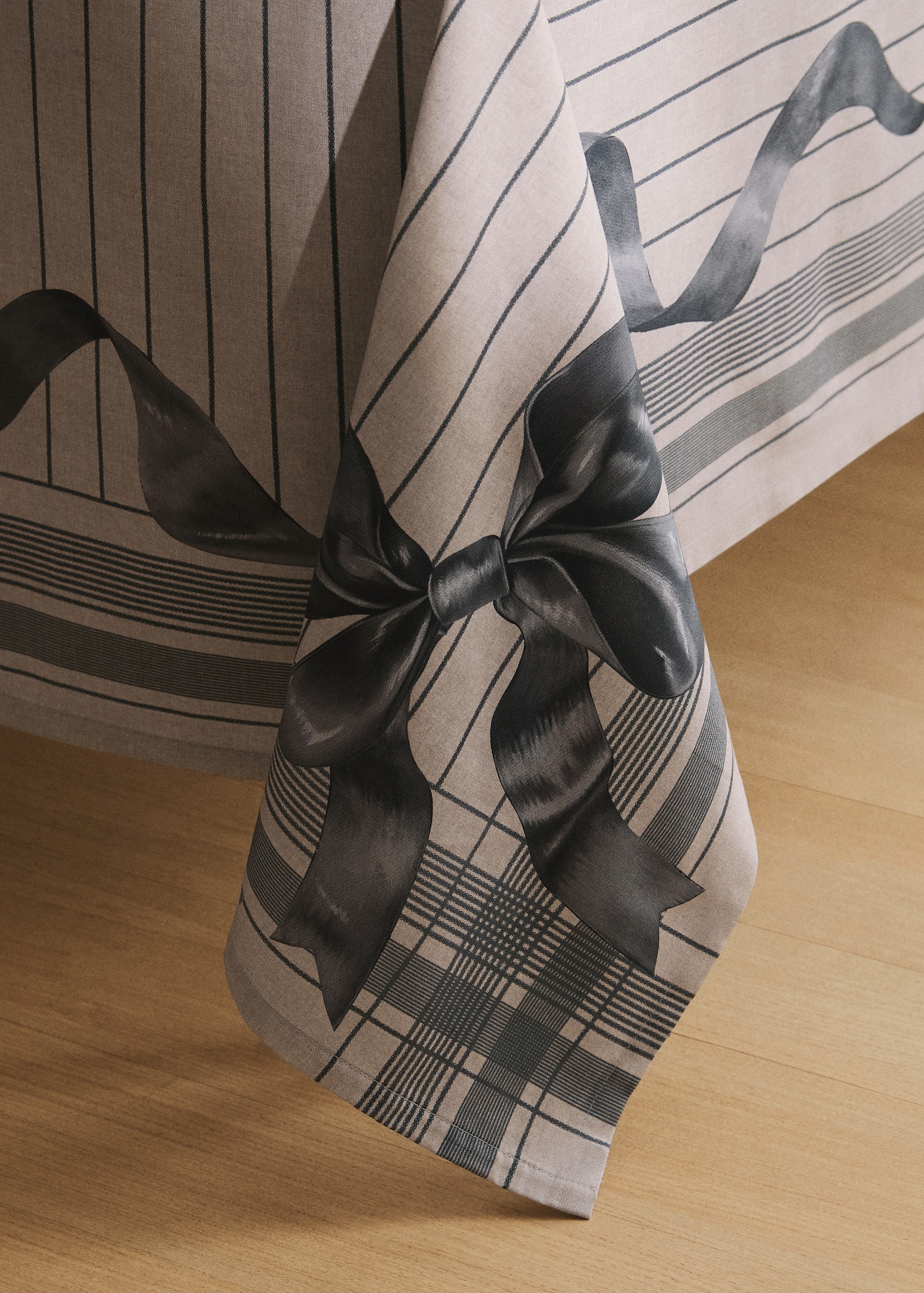 100% Cotton. Size: 150×350 cm. This cotton tablecloth, crafted from 100% cotton and manufactured in Spain, stands out for its elegant design and high-quality craftsmanship. Its composition guarantees softness and durability. Its design with geometric lines and its combination with the bow gives it a sophisticated and festive air, ideal for both celebrations and more formal occasions