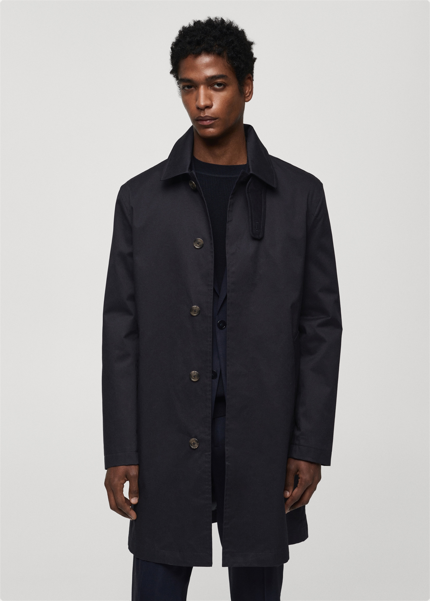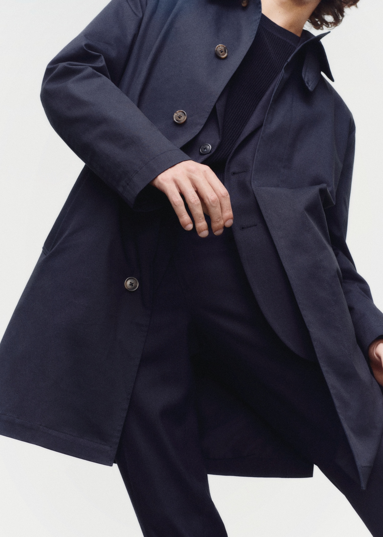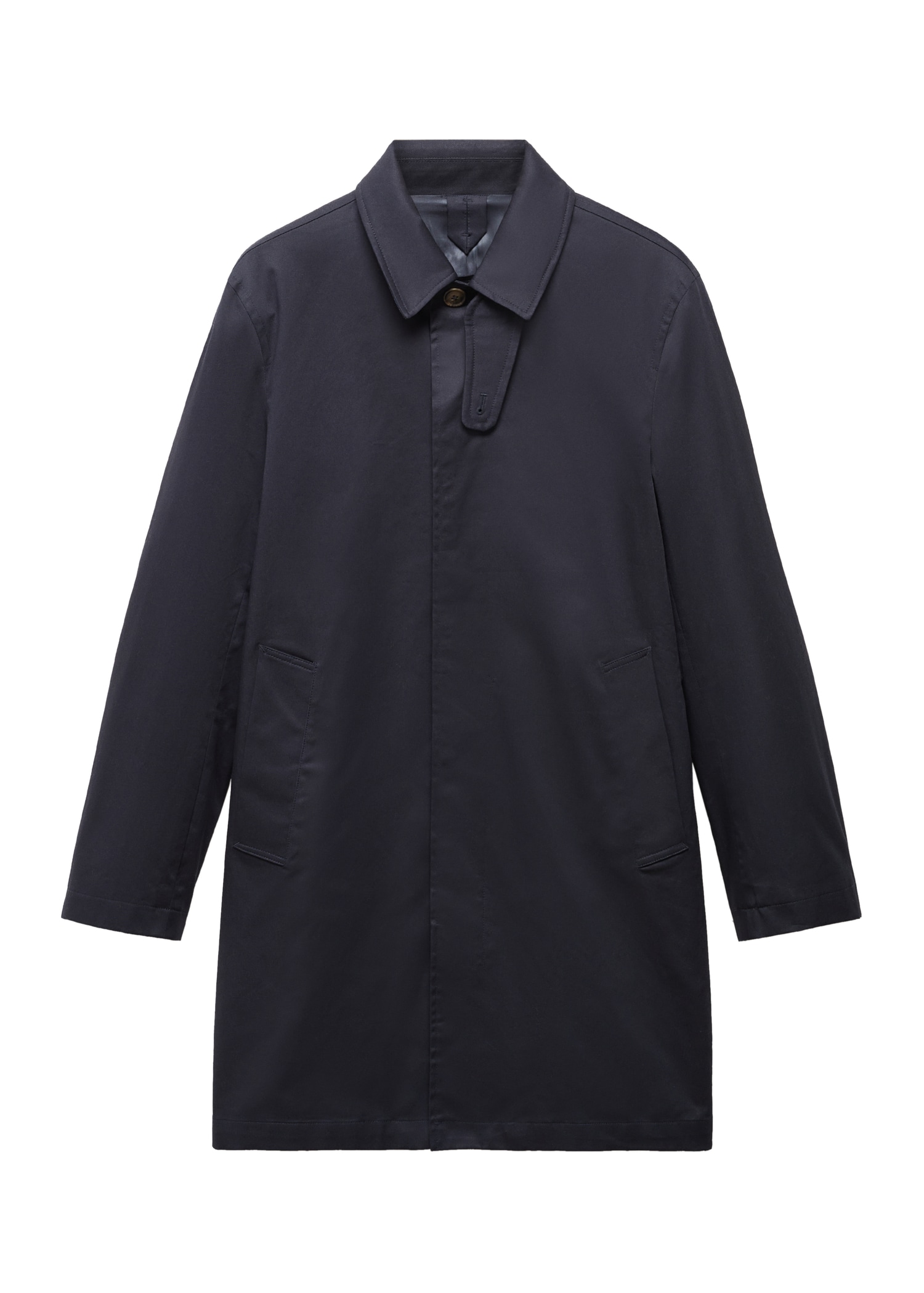 ESSENTIALS: Made to last. Print detail on the inside of the neck. Two side welt pockets. Inner lining. Interior pocket. Back Slit at the Hem. Long design. Front button closure. Classic collar. 100% cotton fabric. ESSENTIALS: Made to last. We have strengthened our quality requirements by adding new resistance tests to our garments. Designed paying careful attention to their manufacture, they are now even more durable, versatile and timeless.