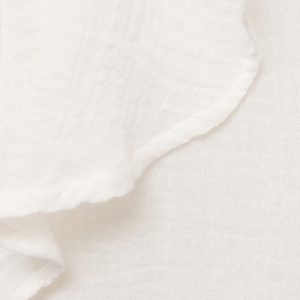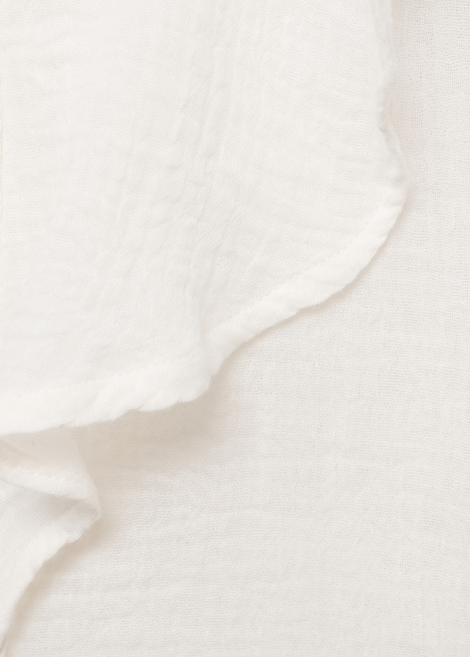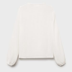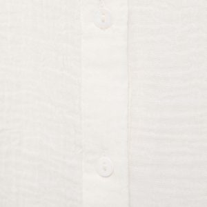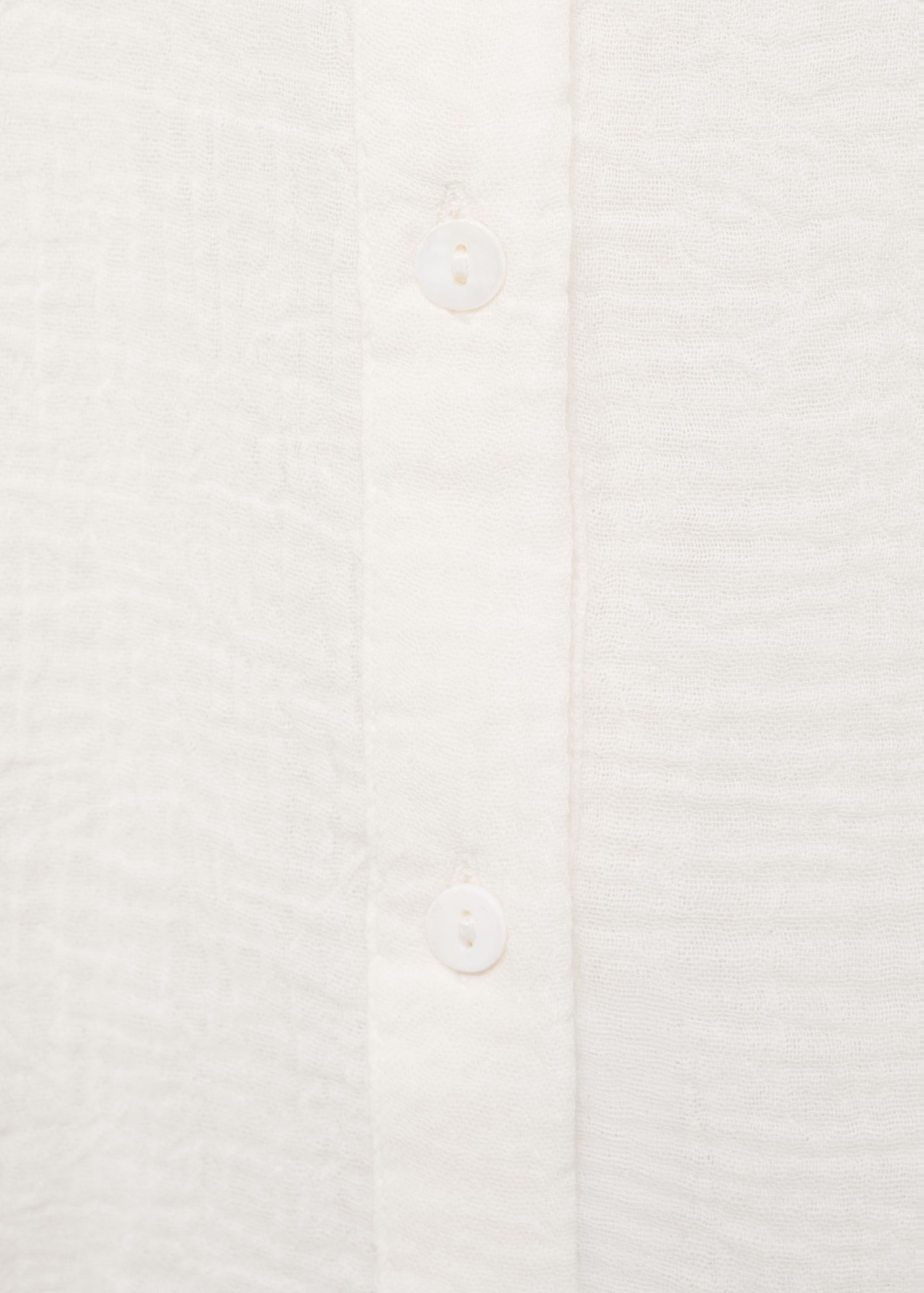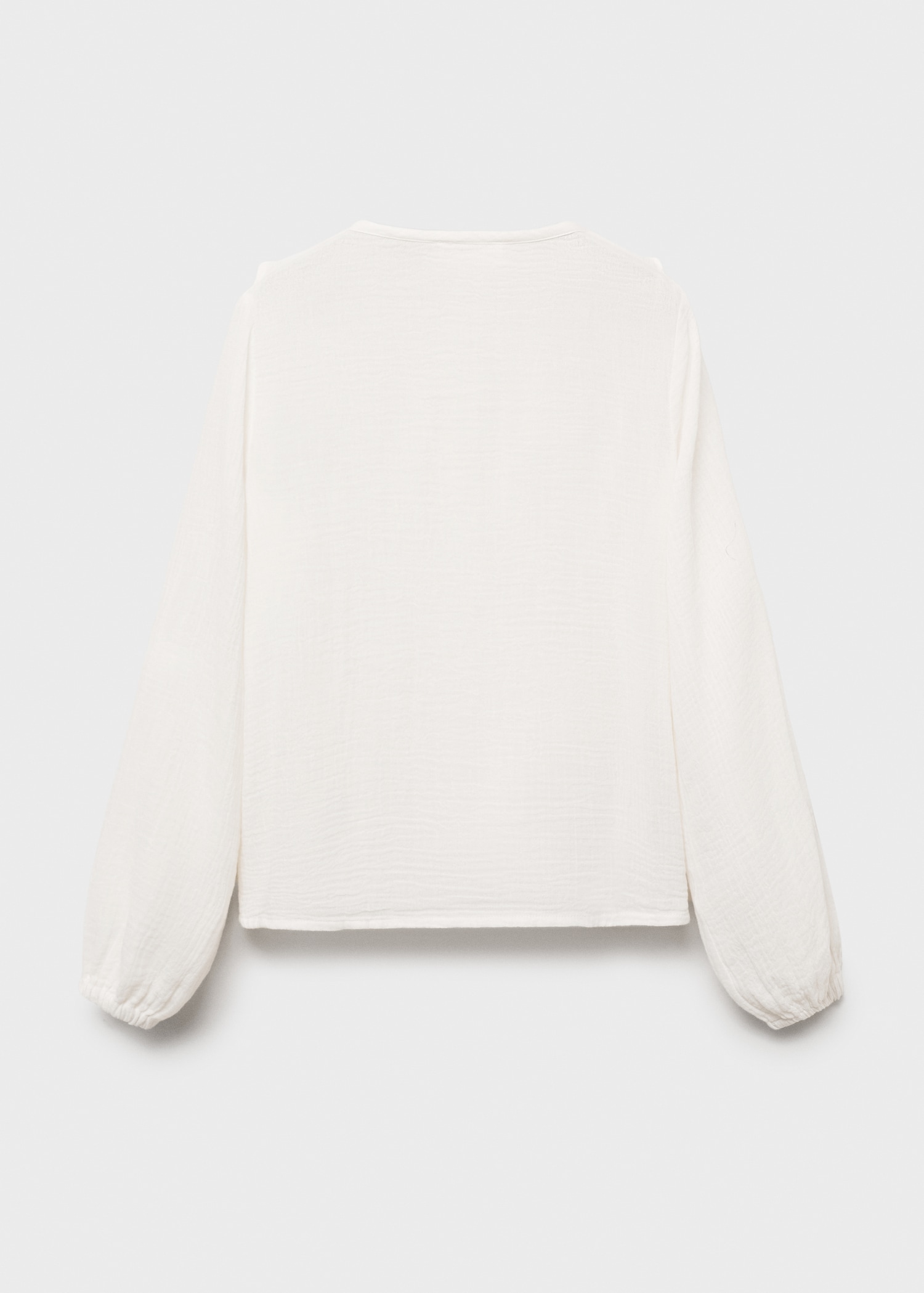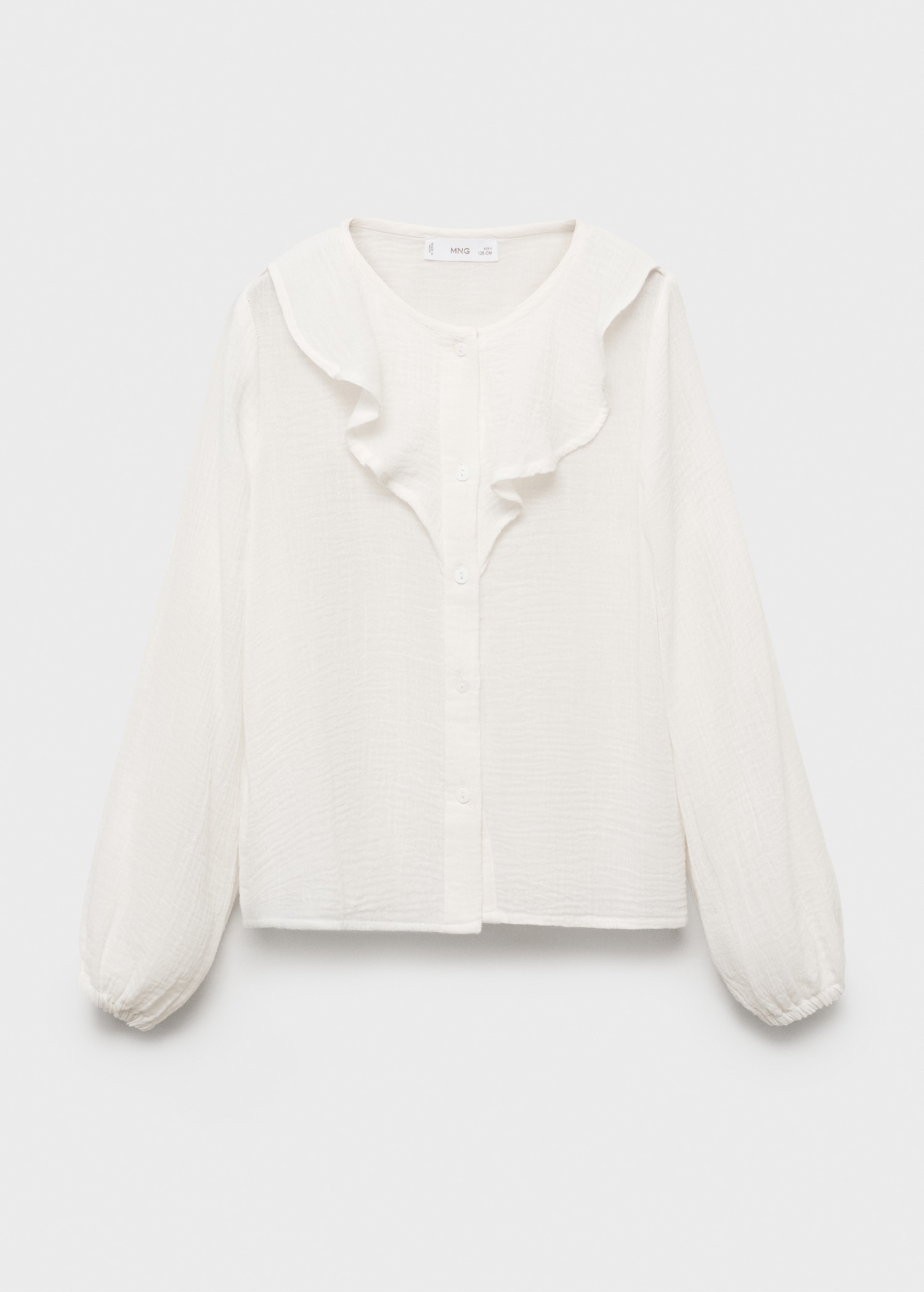 Crafted from 100% cotton cheesecloth fabric, this garment features a straight design with ruffle detailing. It has a round neckline and a front button fastening. The long sleeves have buttoned cuffs