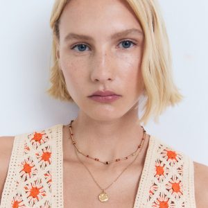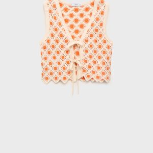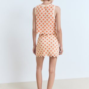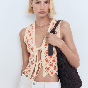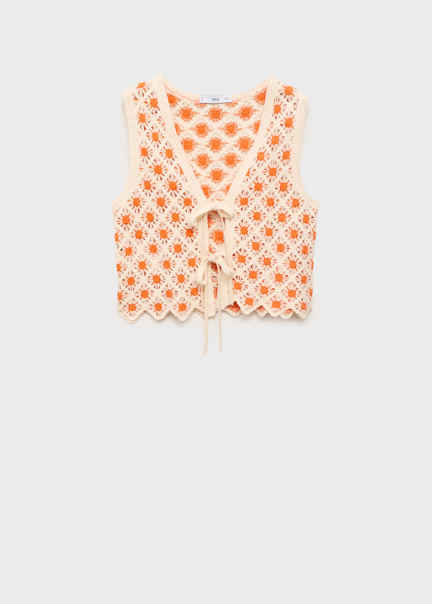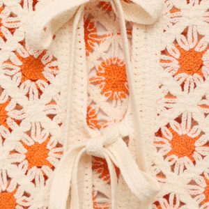 This straight design, crafted from a delicate crochet fabric, is distinctive for its daring V-neck and wide straps that enhance the silhouette. The front tie closure adds a romantic touch, while the scalloped hem provides an exquisite finish, creating a total look that captures the essence of contemporary style